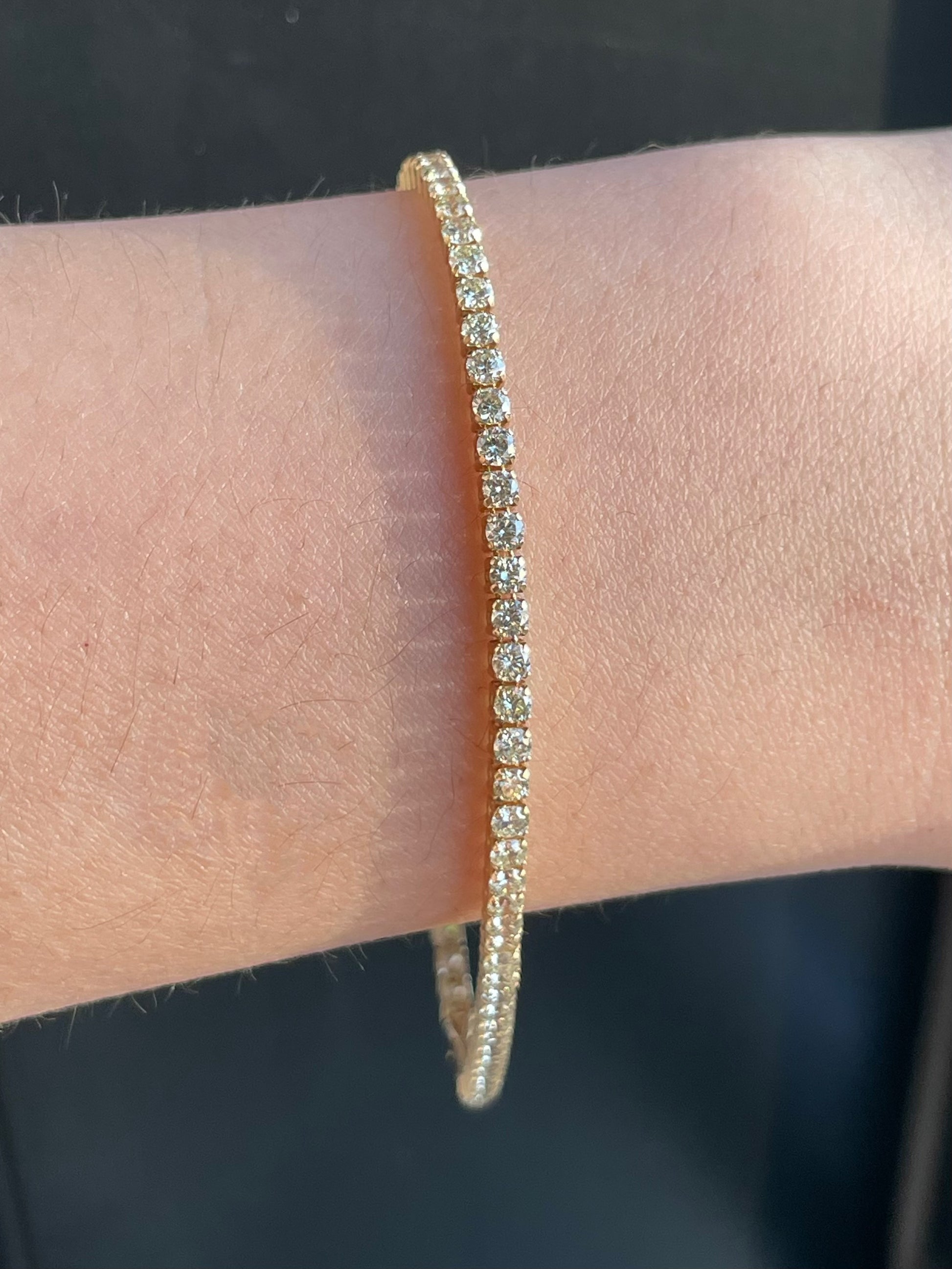 A 14K yellow gold tennis bracelet featuring 73 gleaming and scintillating brilliant cut diamonds (VS Clarity, L-M Color) totaling 3.00 carats secured with a croc lock. The classic piece that adds just the right touch of sparkle to any look.