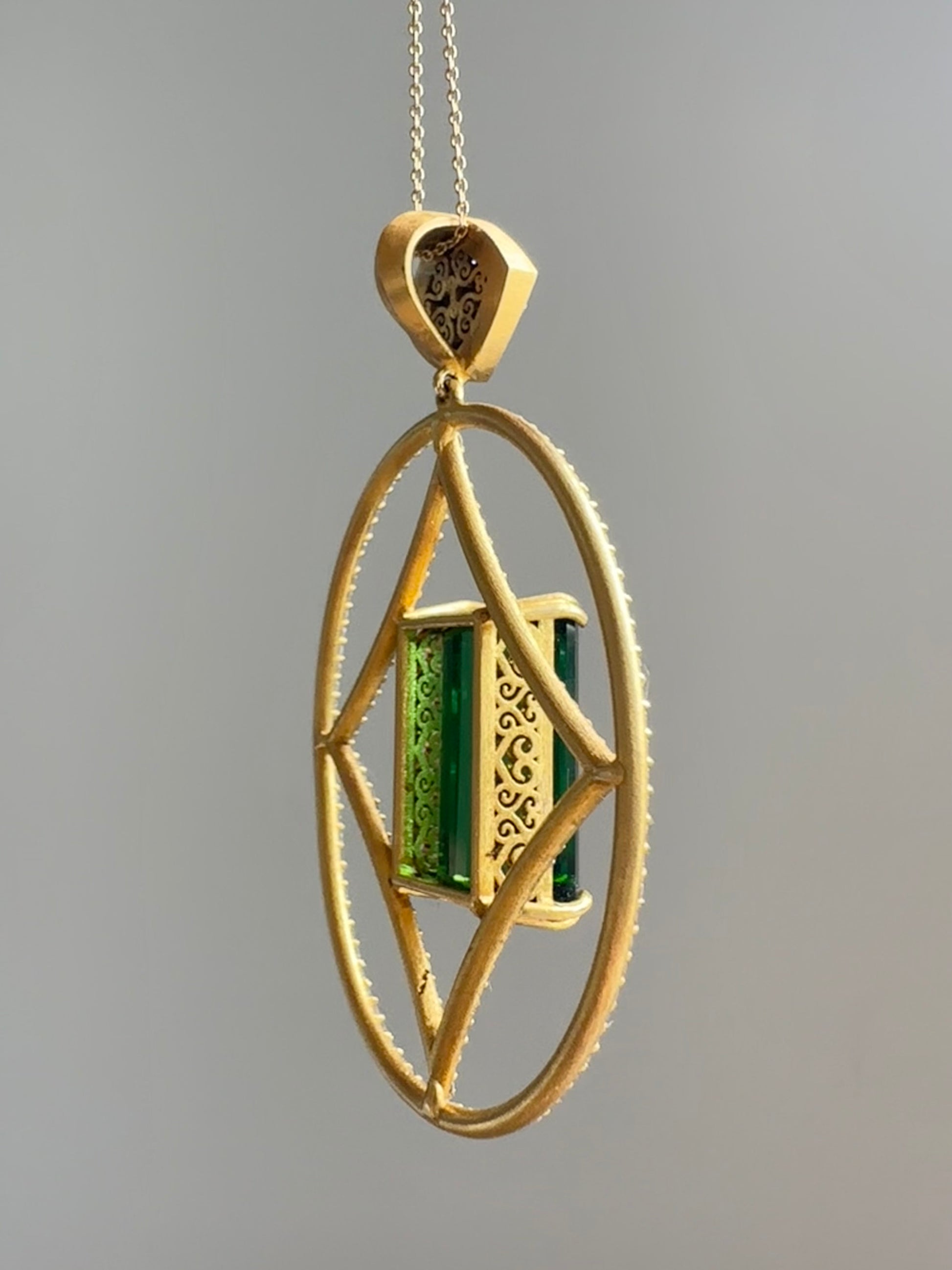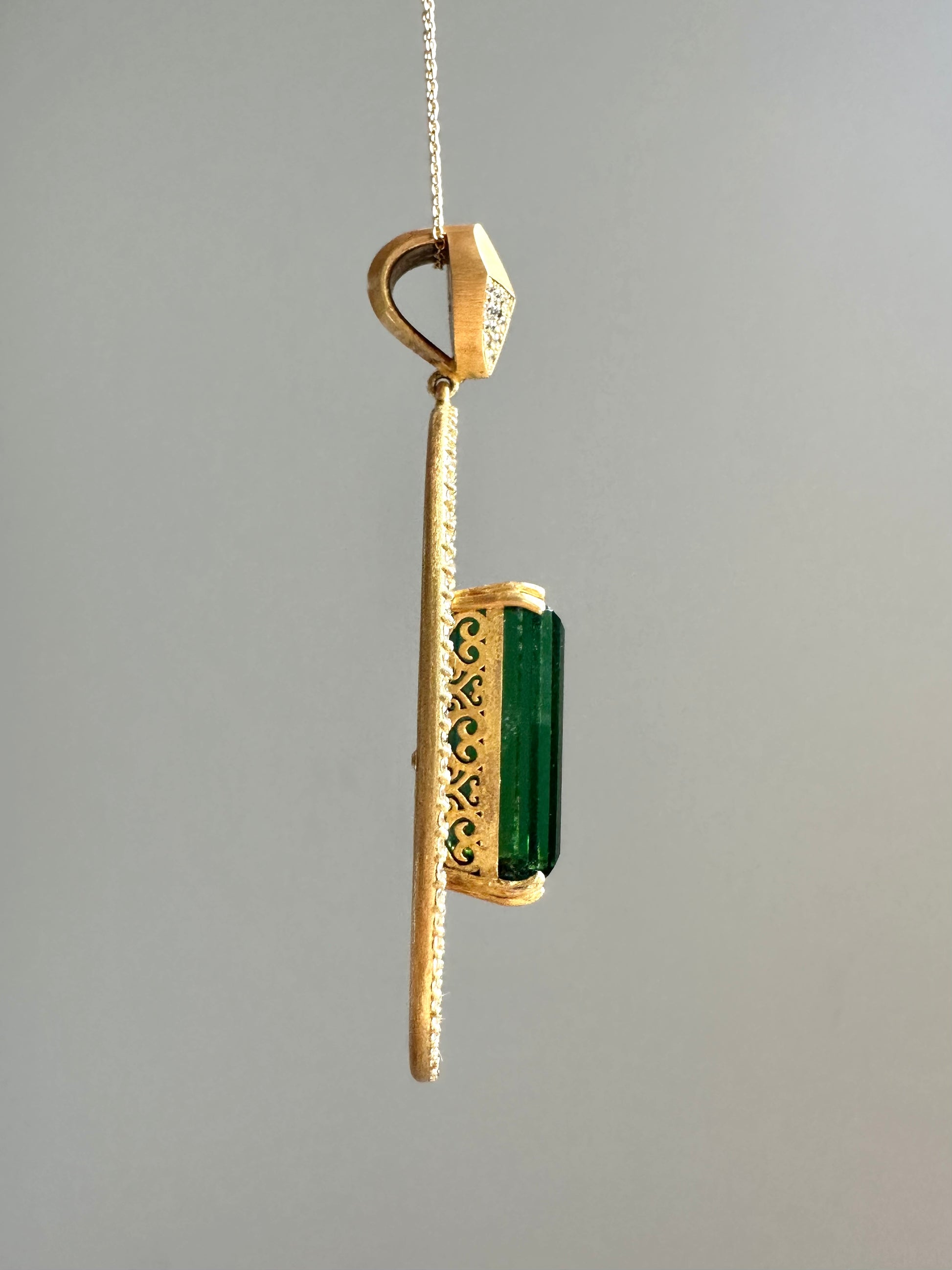 18K Gold Elongated Green Tourmaline Diamond Pendant