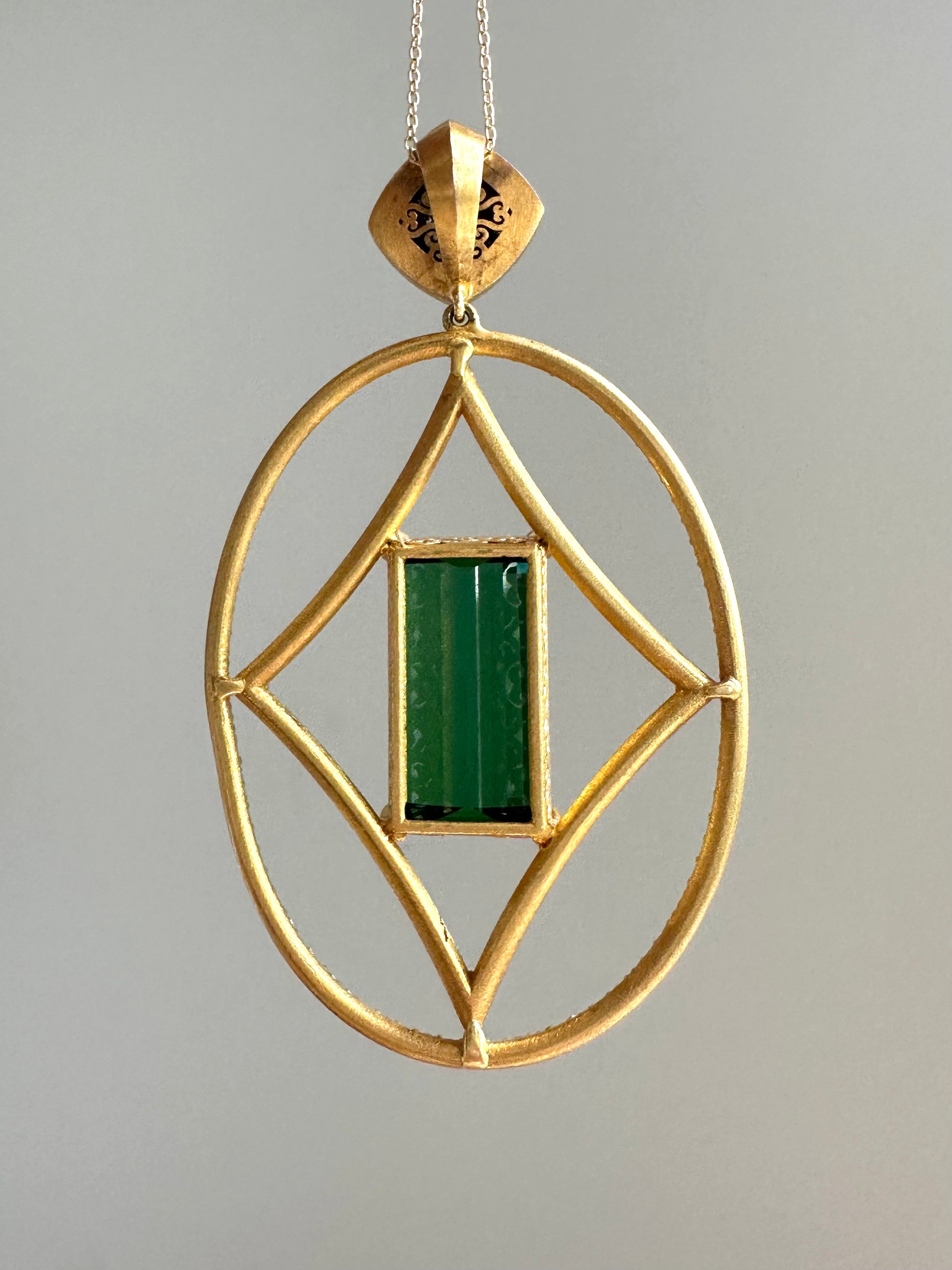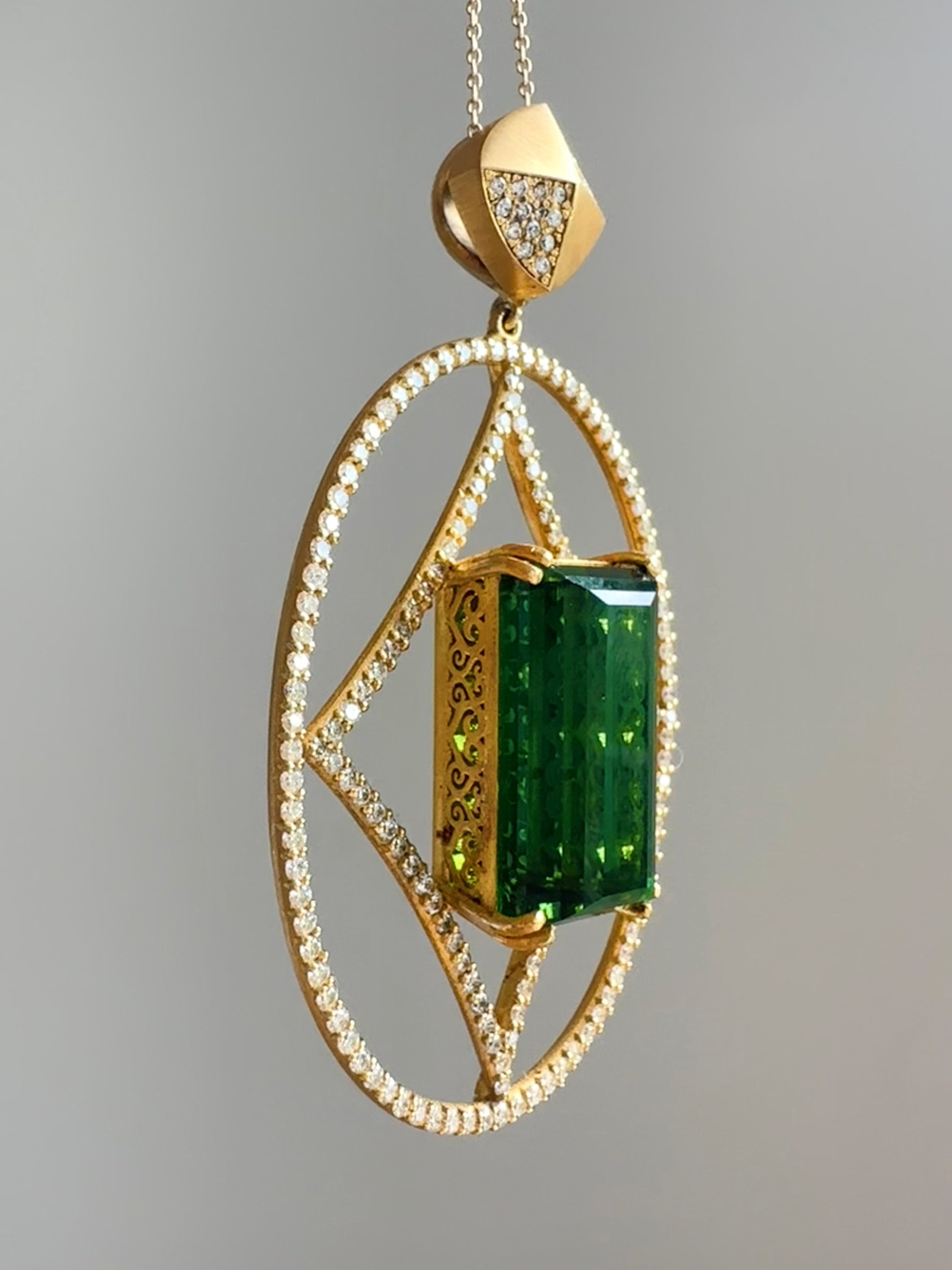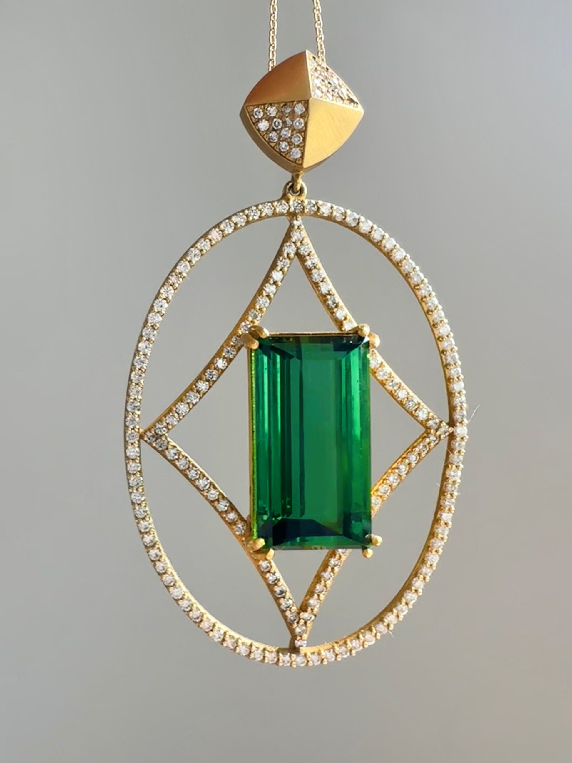 An exceptional 18K gold pendant featuring a captivating elongated tourmaline with a rich, vibrant green hue highlighted by sparkling white diamonds forming into a rhombus and oval shape. A timeless piece that combines classic elegance with modern sophistication. Perfect for elevating any outfit or making a statement on a special occasion!