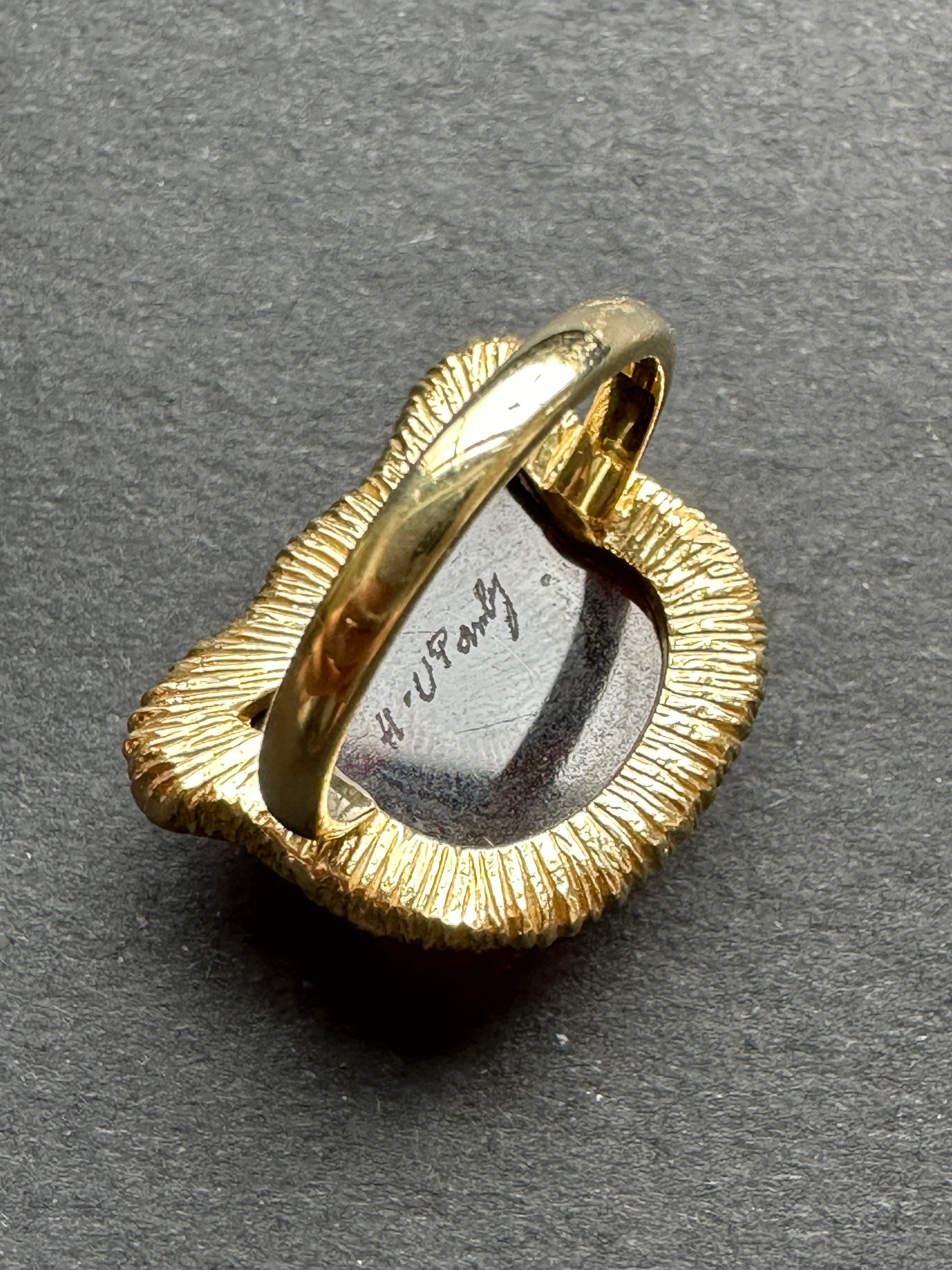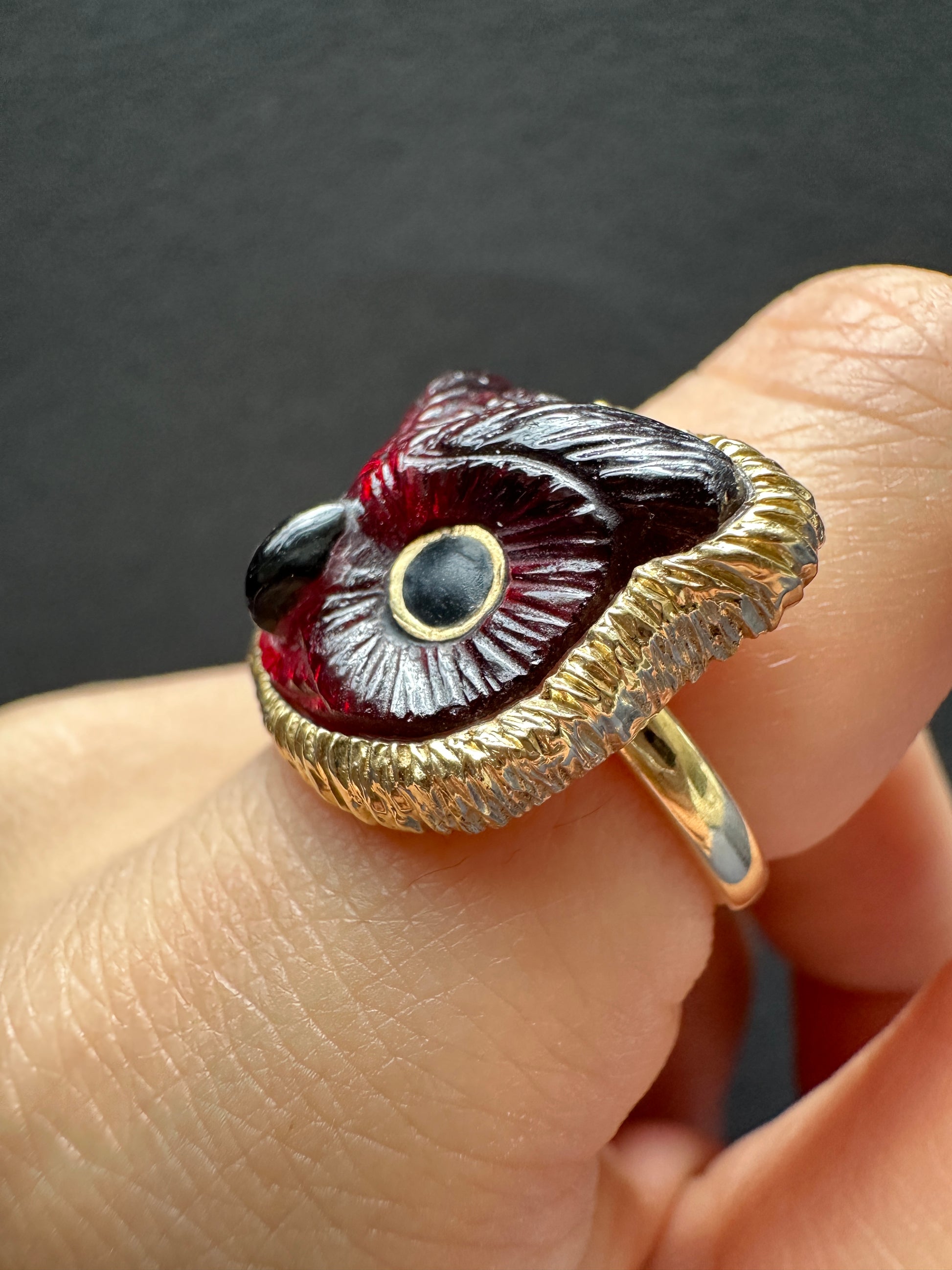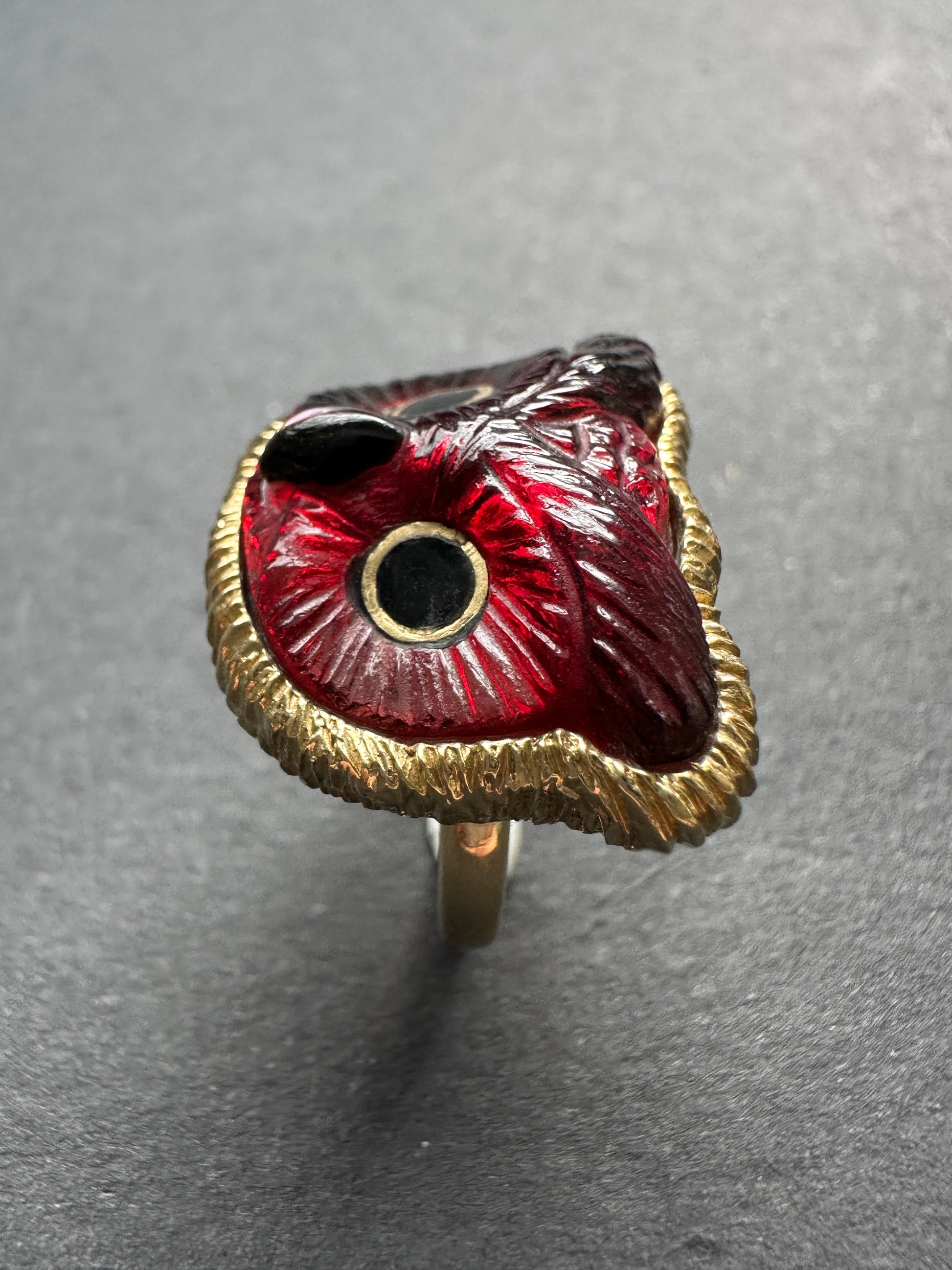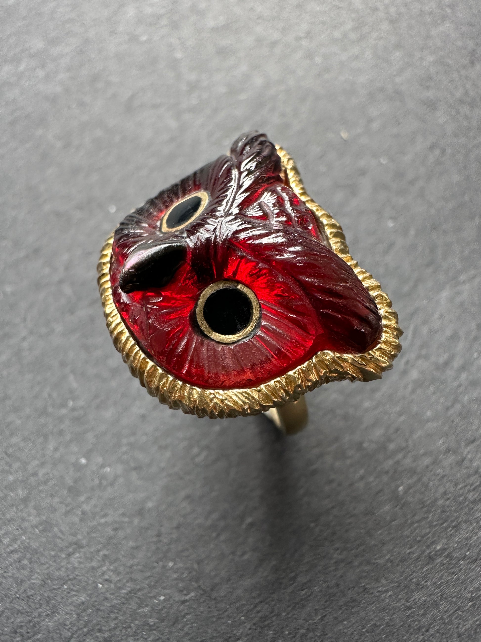 By Diane Griswold, a whimsical owl ring sculpted from a glowing garnet displaying a cranberry-red hue wrapped in 18K gold, with enameled eyes.