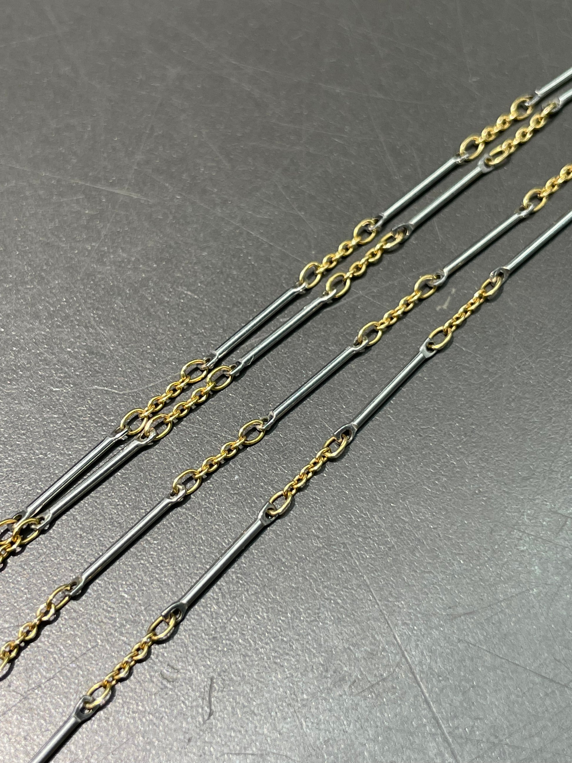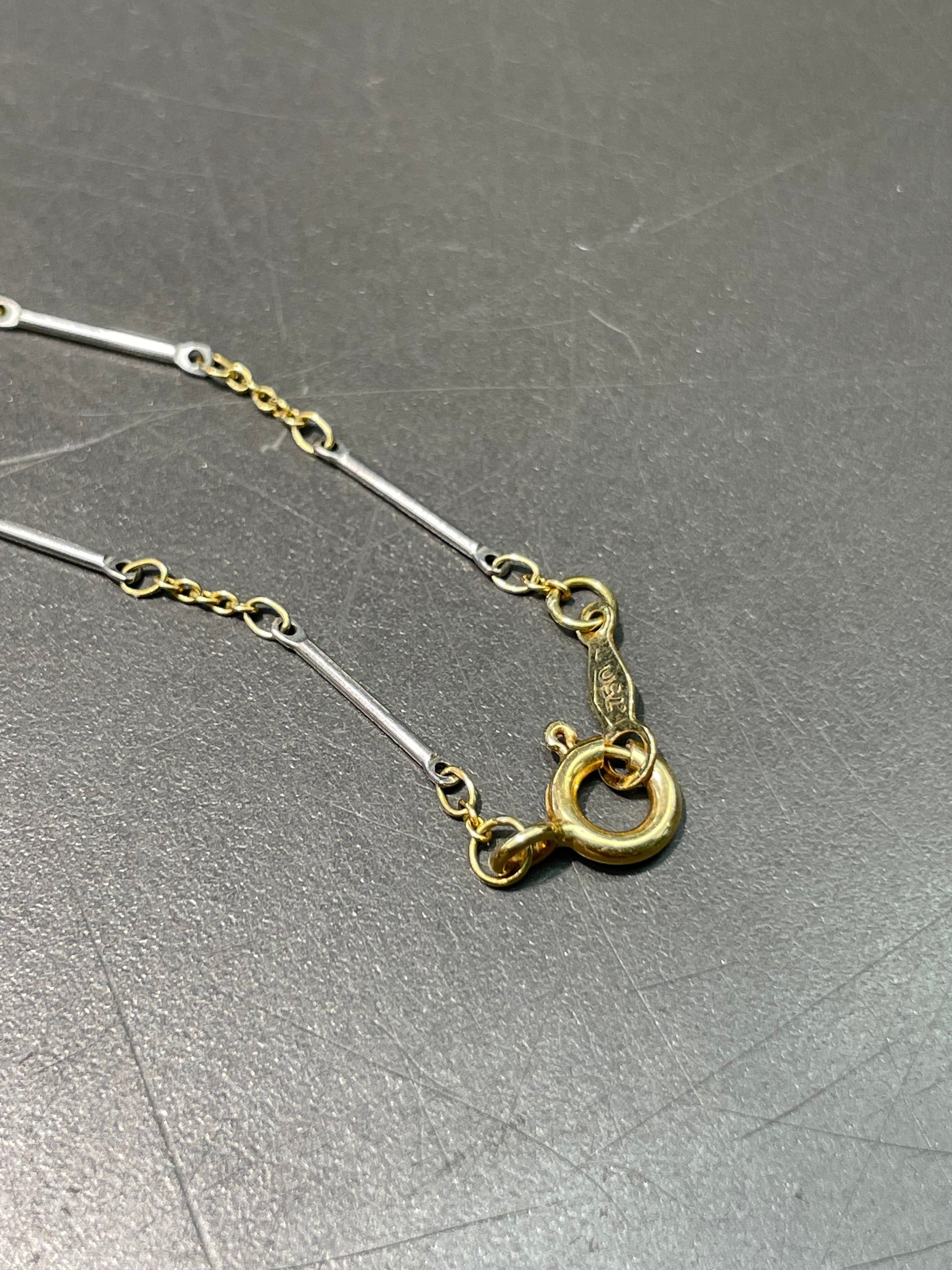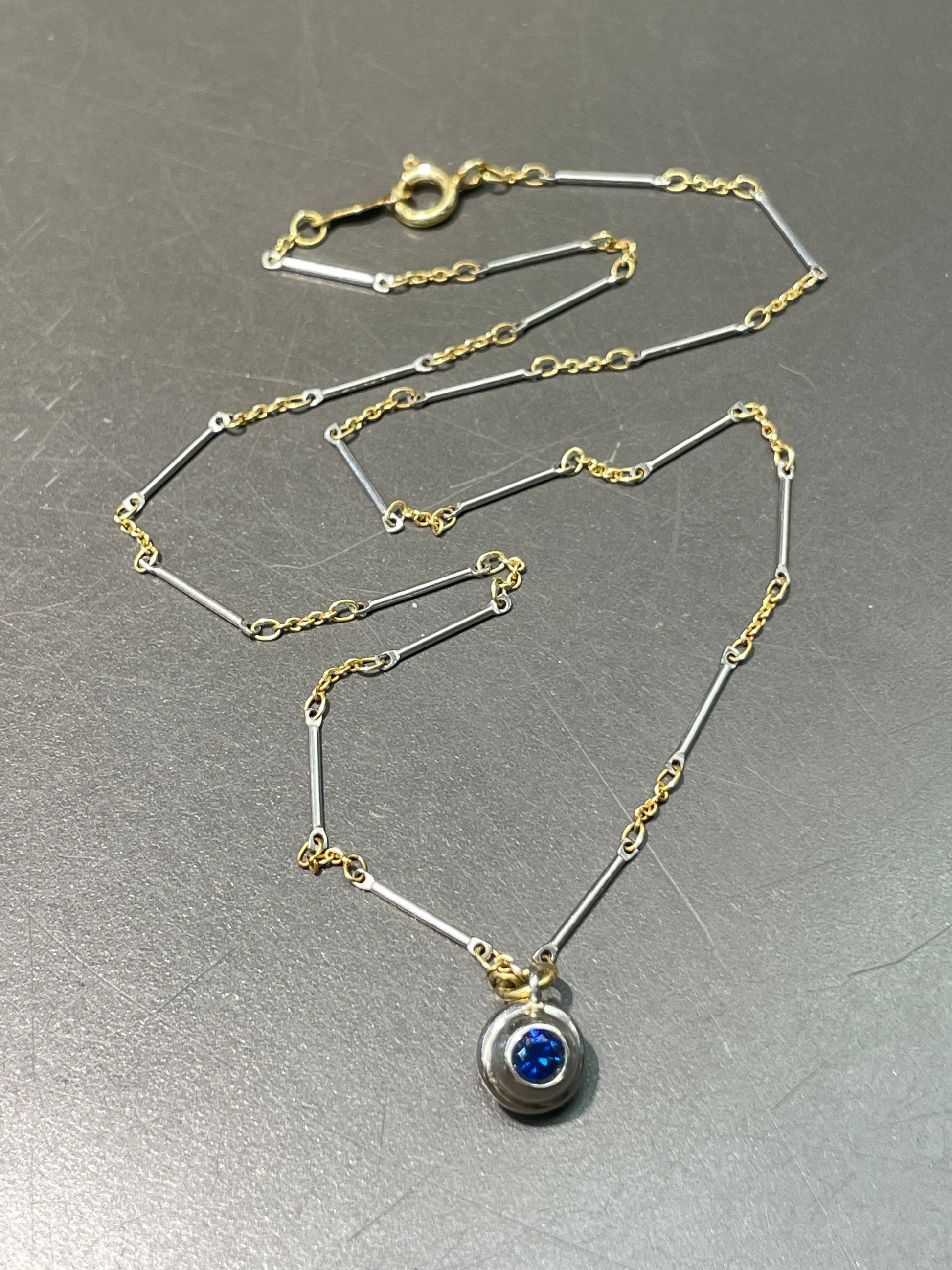 A gleaming and glistening two sided pendant necklace centered with a 0.30 carat diamond (VS clarity, G color) and natural sapphire with an alluring vibrant royal blue hue finished with a platinum and 18k gold stationed chain.