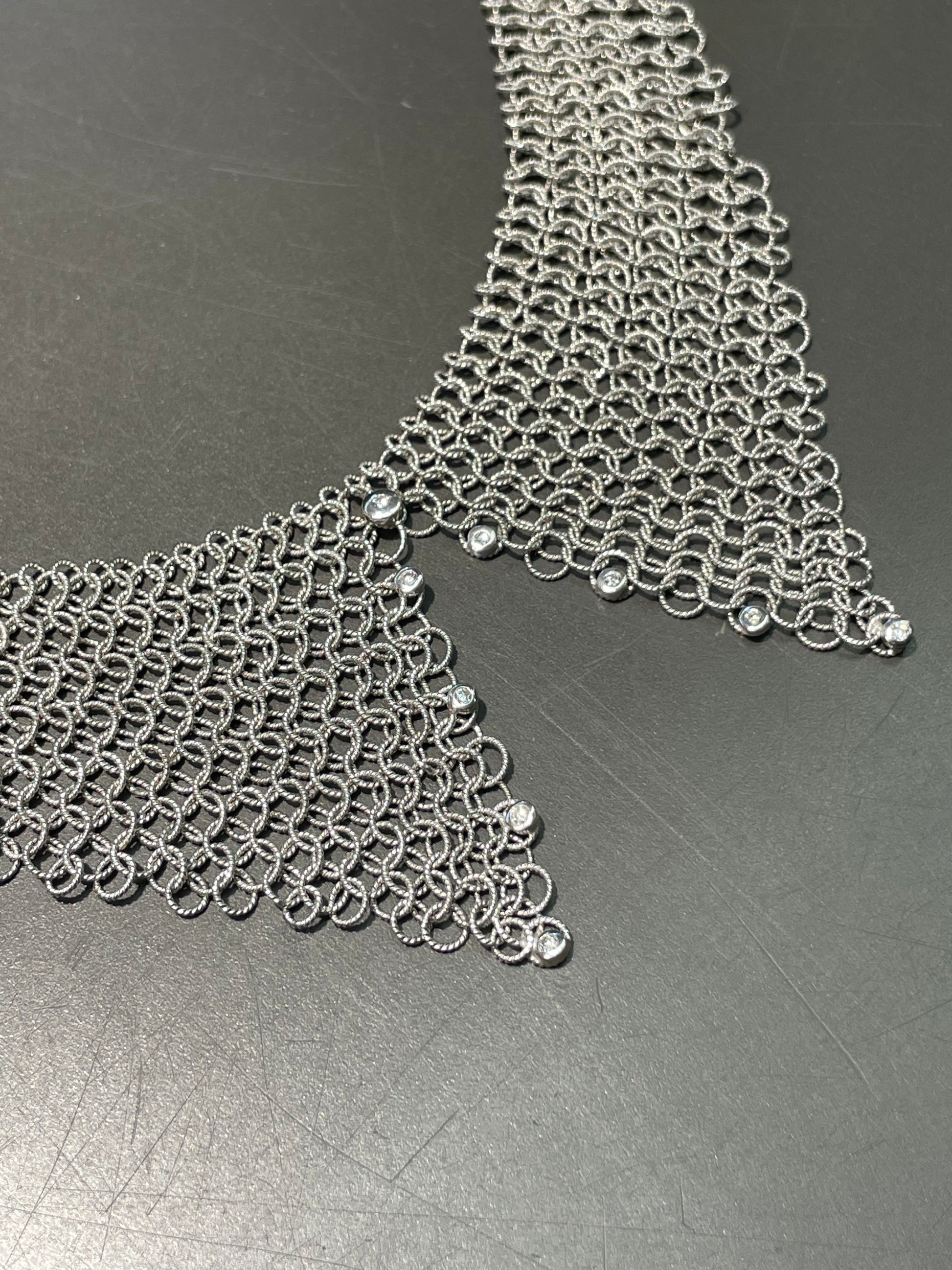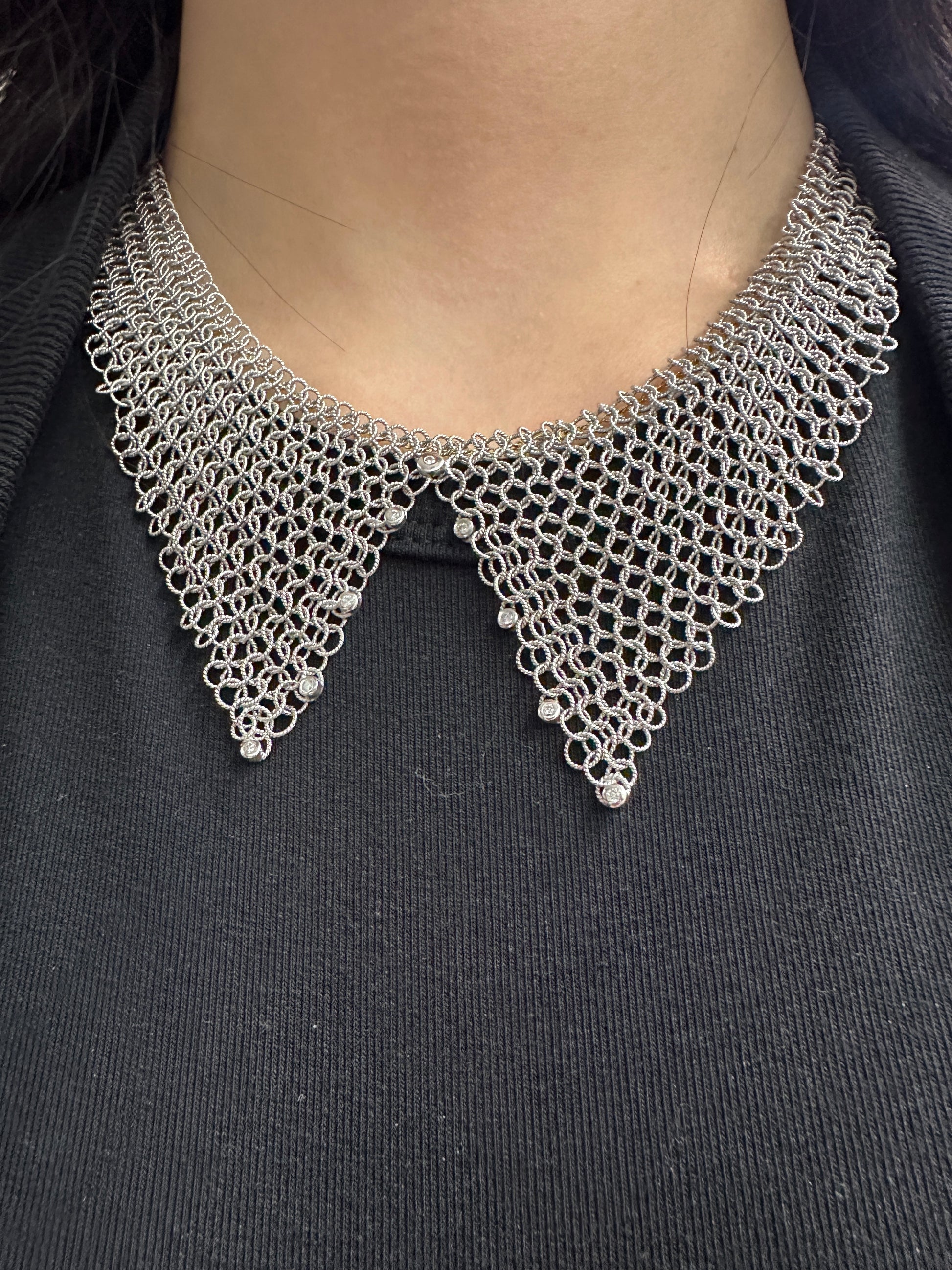 Make a bold yet elegant statement with this stunning 18K White Gold Mesh Collar Necklace. Crafted with fluid, interwoven links that gradually drapes beautifully along the neckline, this piece is accented with 0.18 carats (VS clarity, G-H color) total weight of sparkling diamonds that add just the right touch of brilliance.