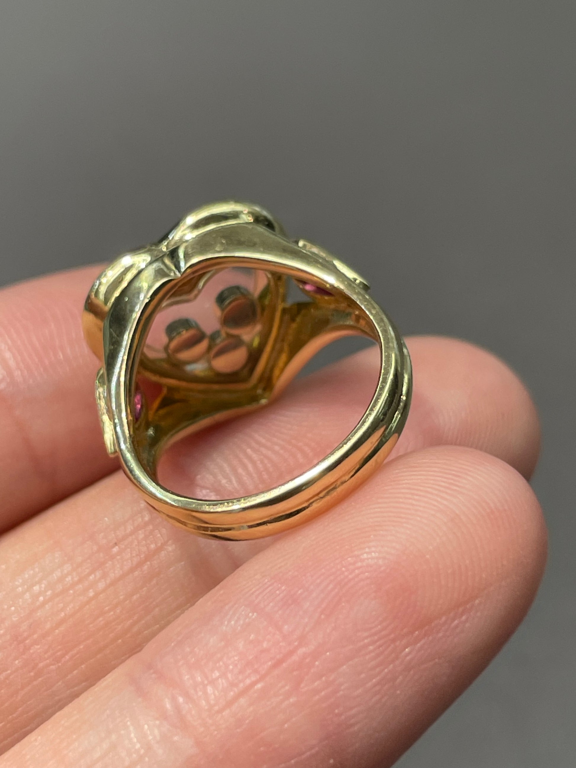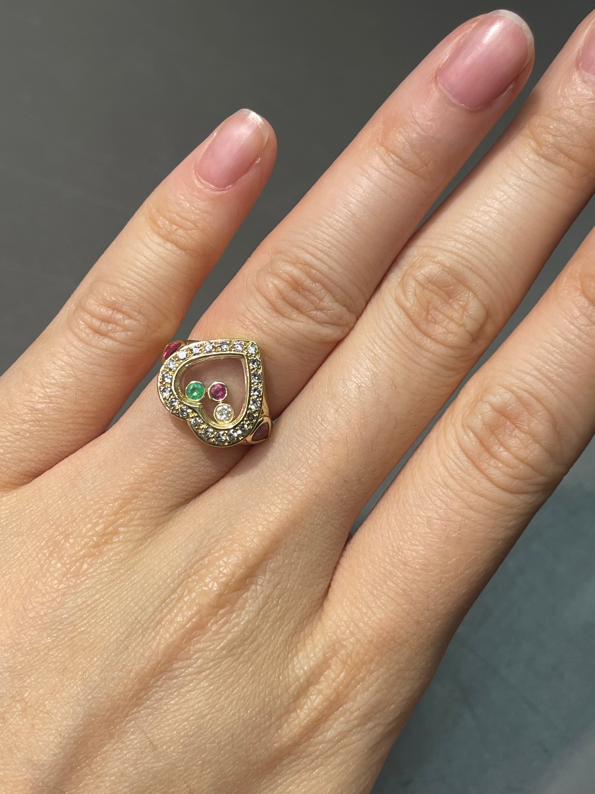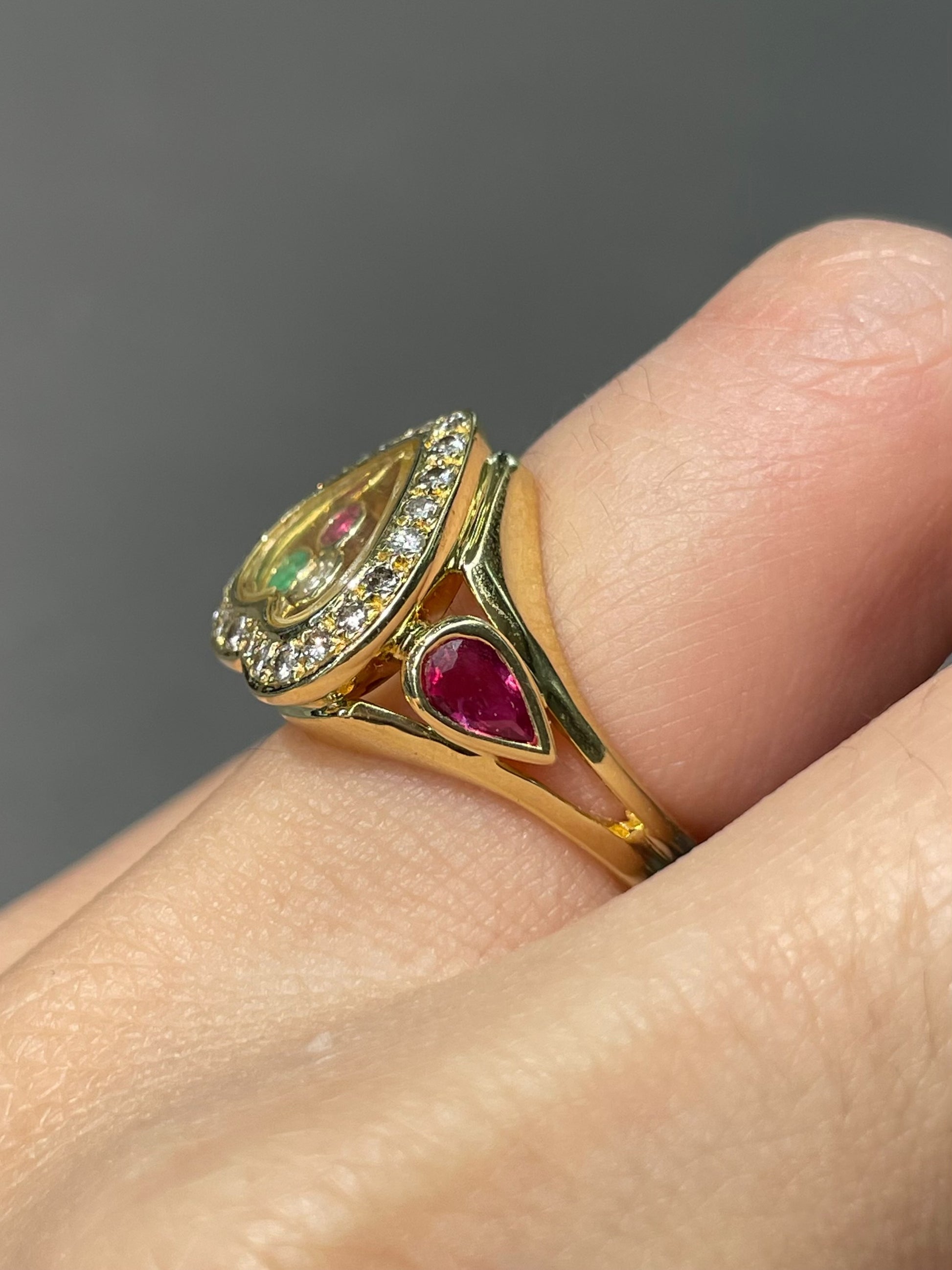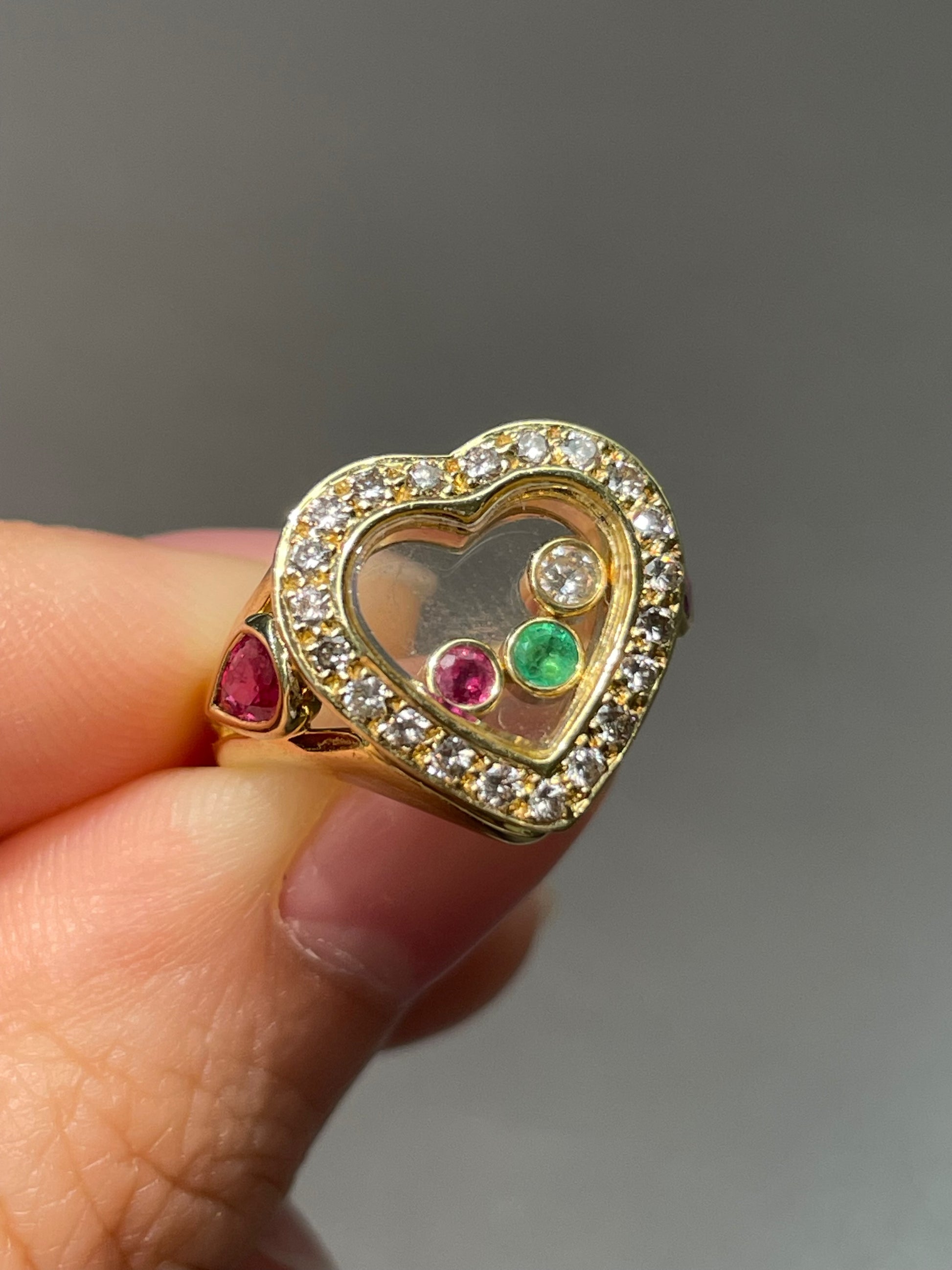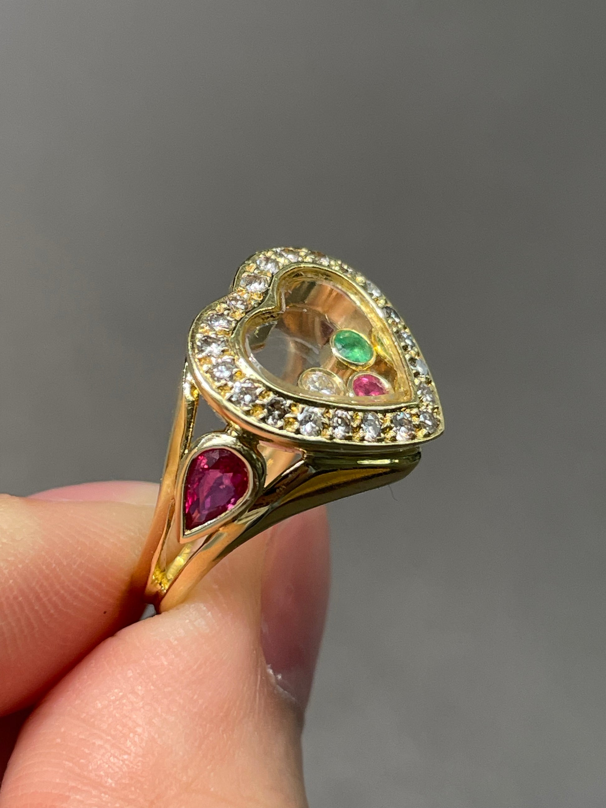 A playful 18K gold floating gemstone and diamond ring resembling the Happy Diamonds collection from Chopard, flanked by two drop-shaped rubies. The heart-shaped window in the center is surrounded by a halo of brilliant-cut diamonds (0.21 carats, SI clarity, H-I color) with three bezel-set floating gemstones that twirl and move between the two sapphire crystal panels.
