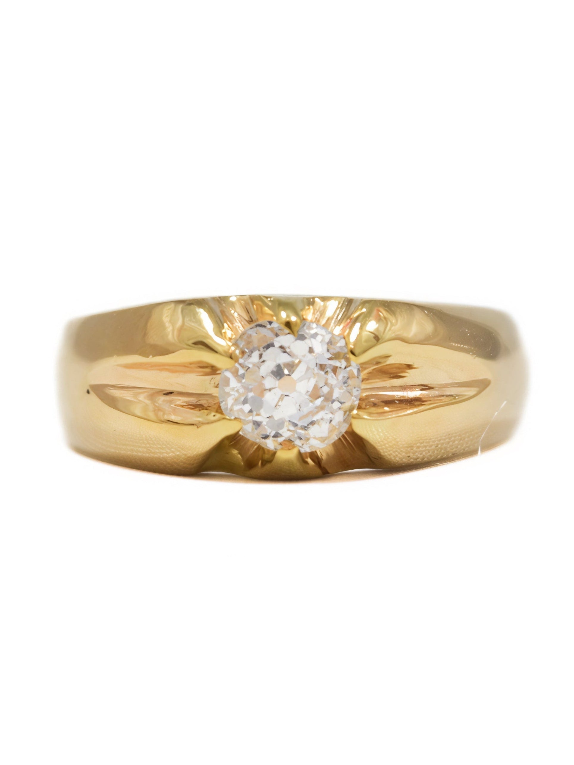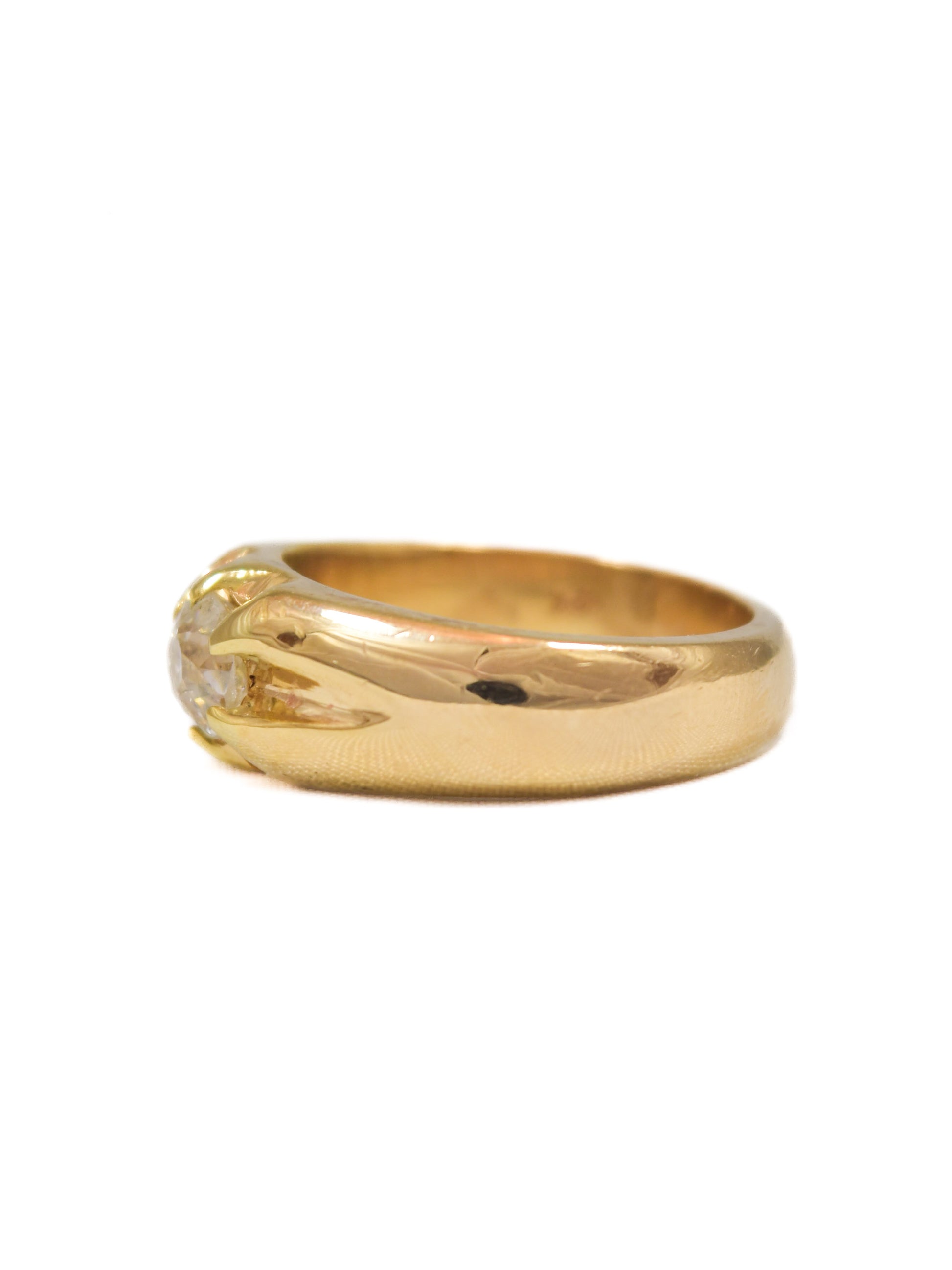 An antique 12K gold gypsy signet ring centered with a bright and lively 0.90 carat old mine cut diamond ornamented with ribbed prong design.