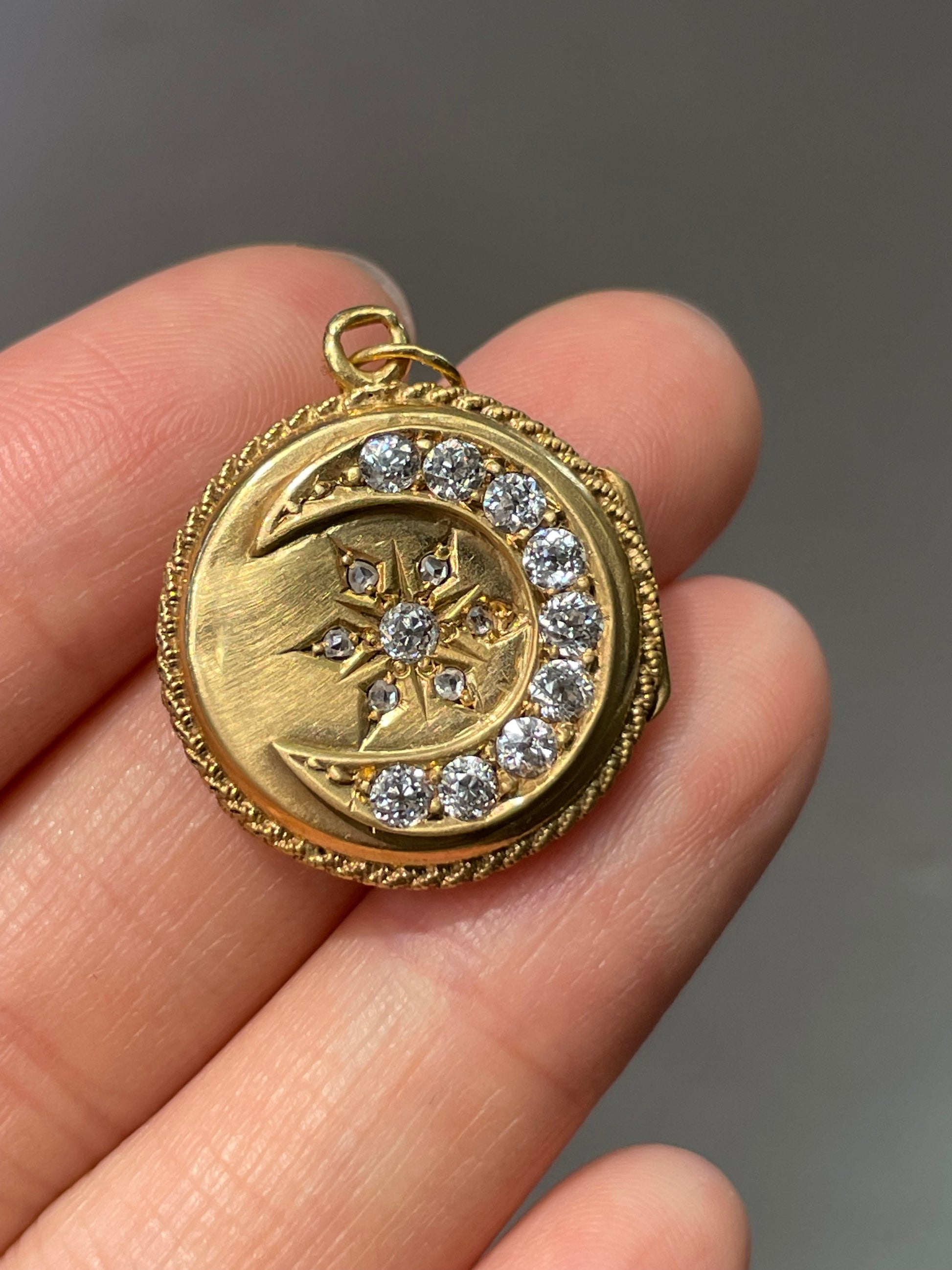 A breathtaking 14K gold Victorian celestial crescent starburst locket set with sparkling white old mine cut diamonds totaling 0.92 carats (SI clarity, I color). The locket opens to reveal two compartments, perfect for holding cherished photos or keepsakes.