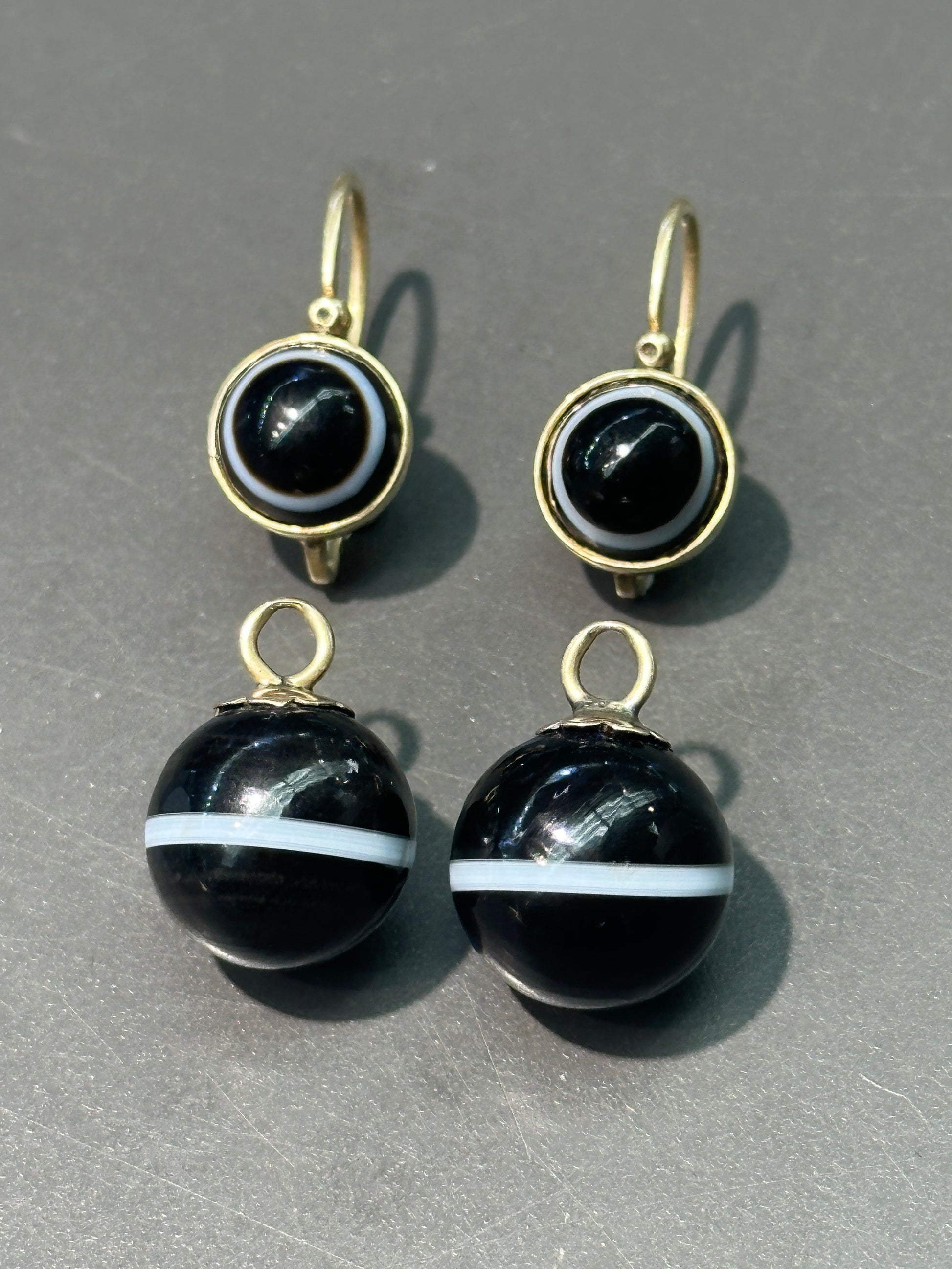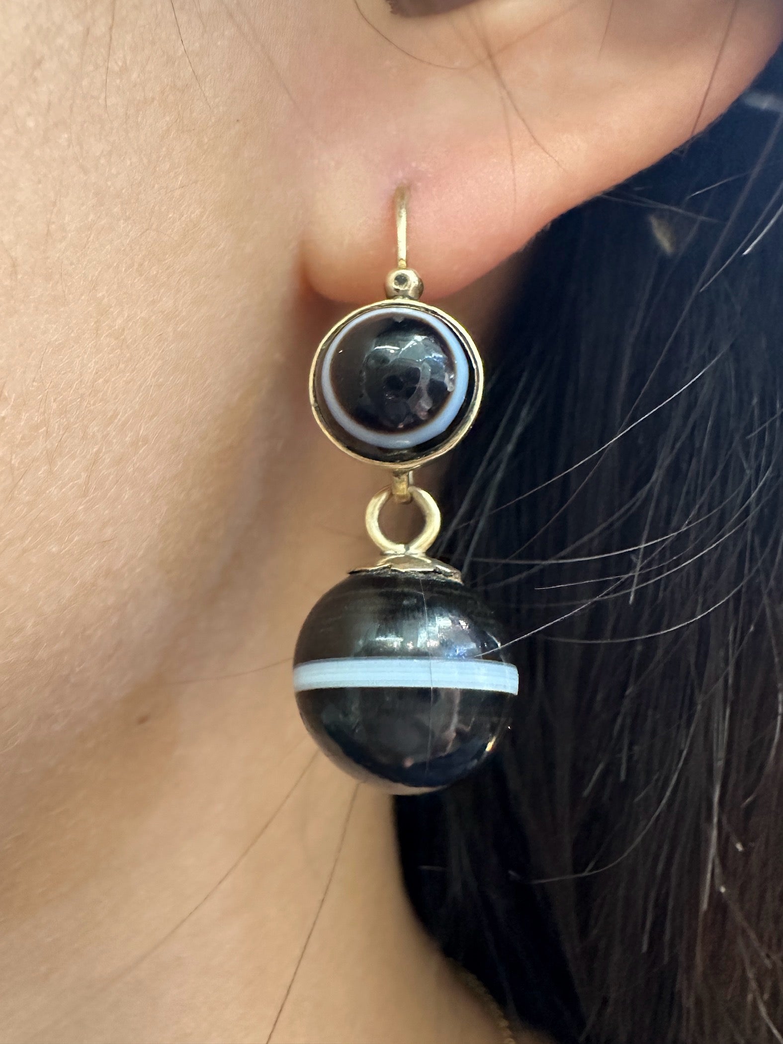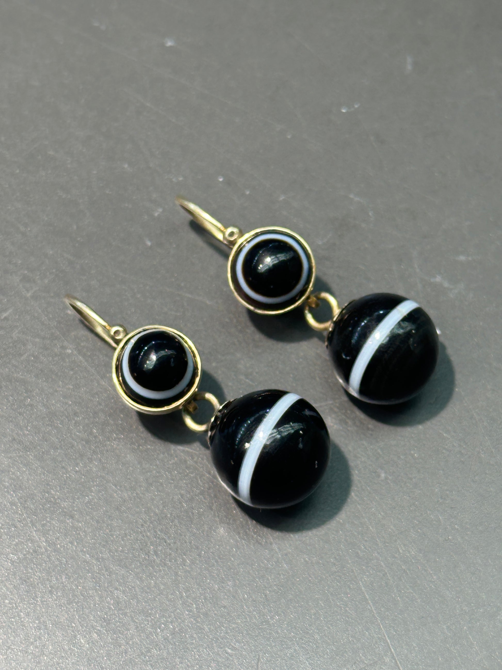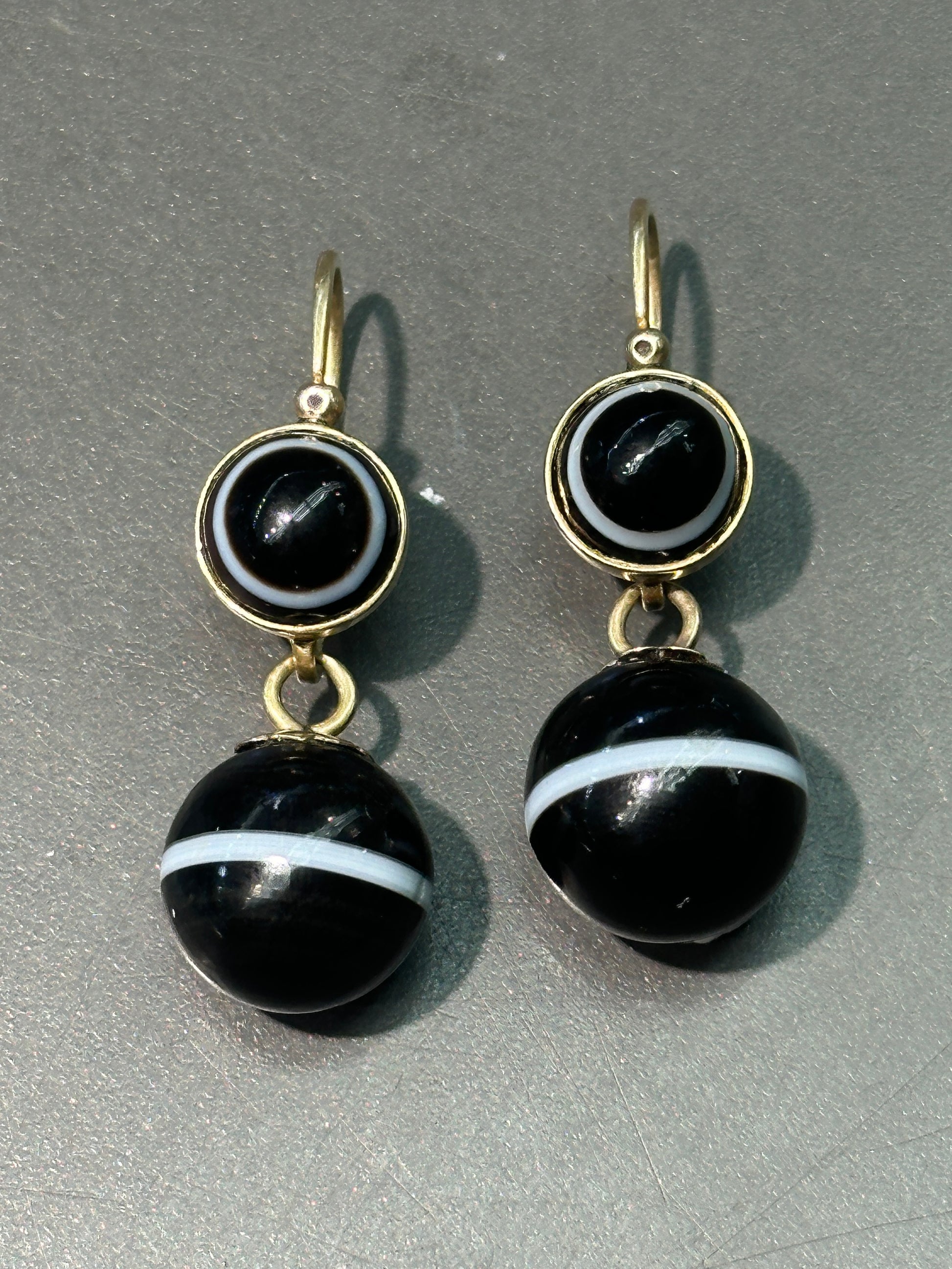 Antique 14K Gold Banded Agate "Day and Night" Drop Earrings