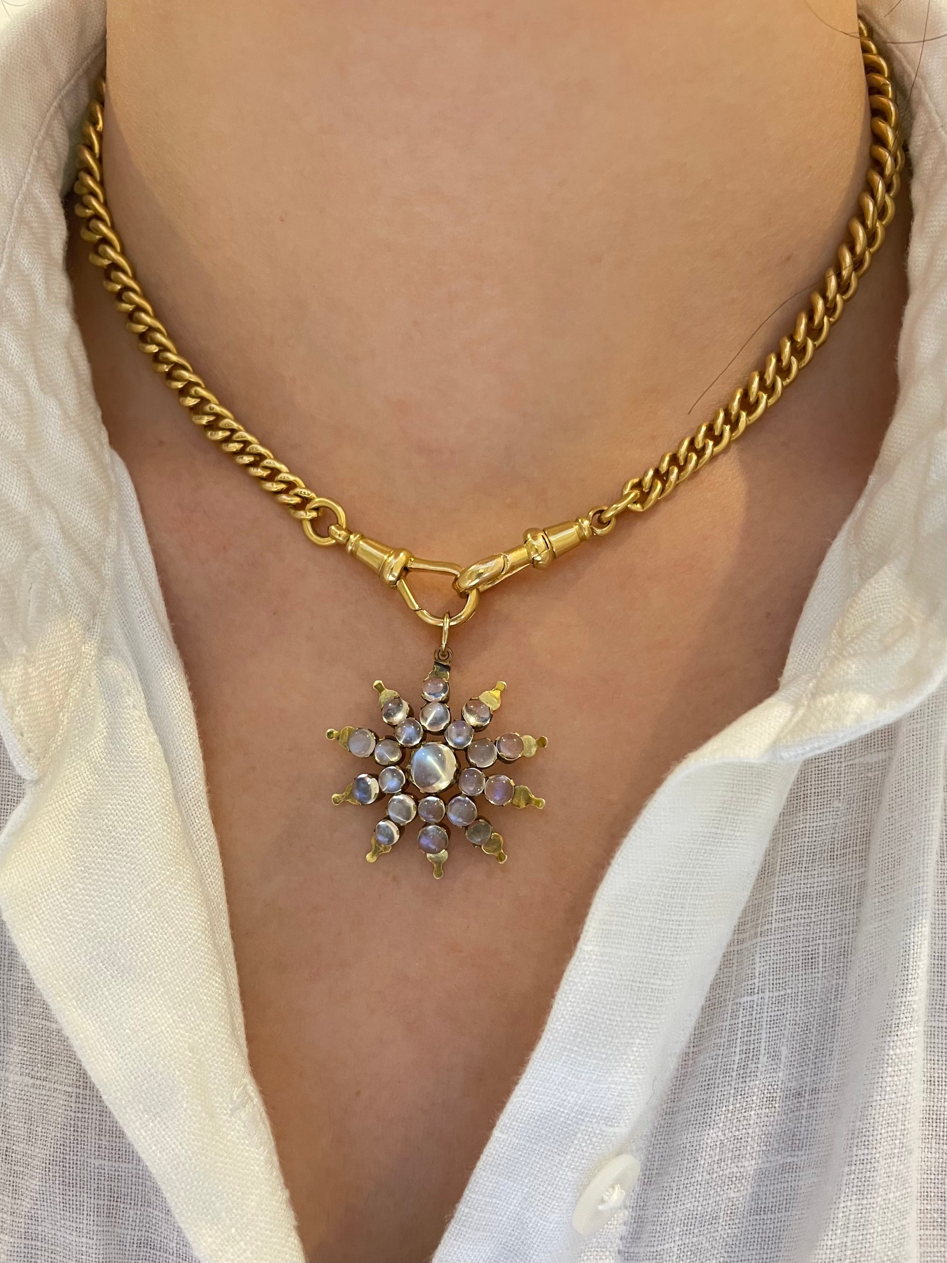 A striking celestial antique starburst pendant crafted in 14K gold and set with 21 glowing Ceylon moonstones, each boasting a gorgeous silvery blue adularescence as they catch the light.
