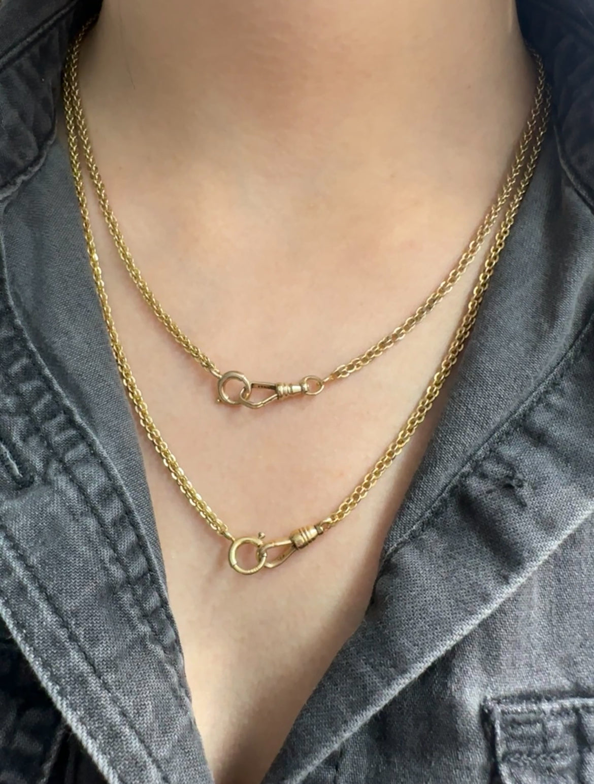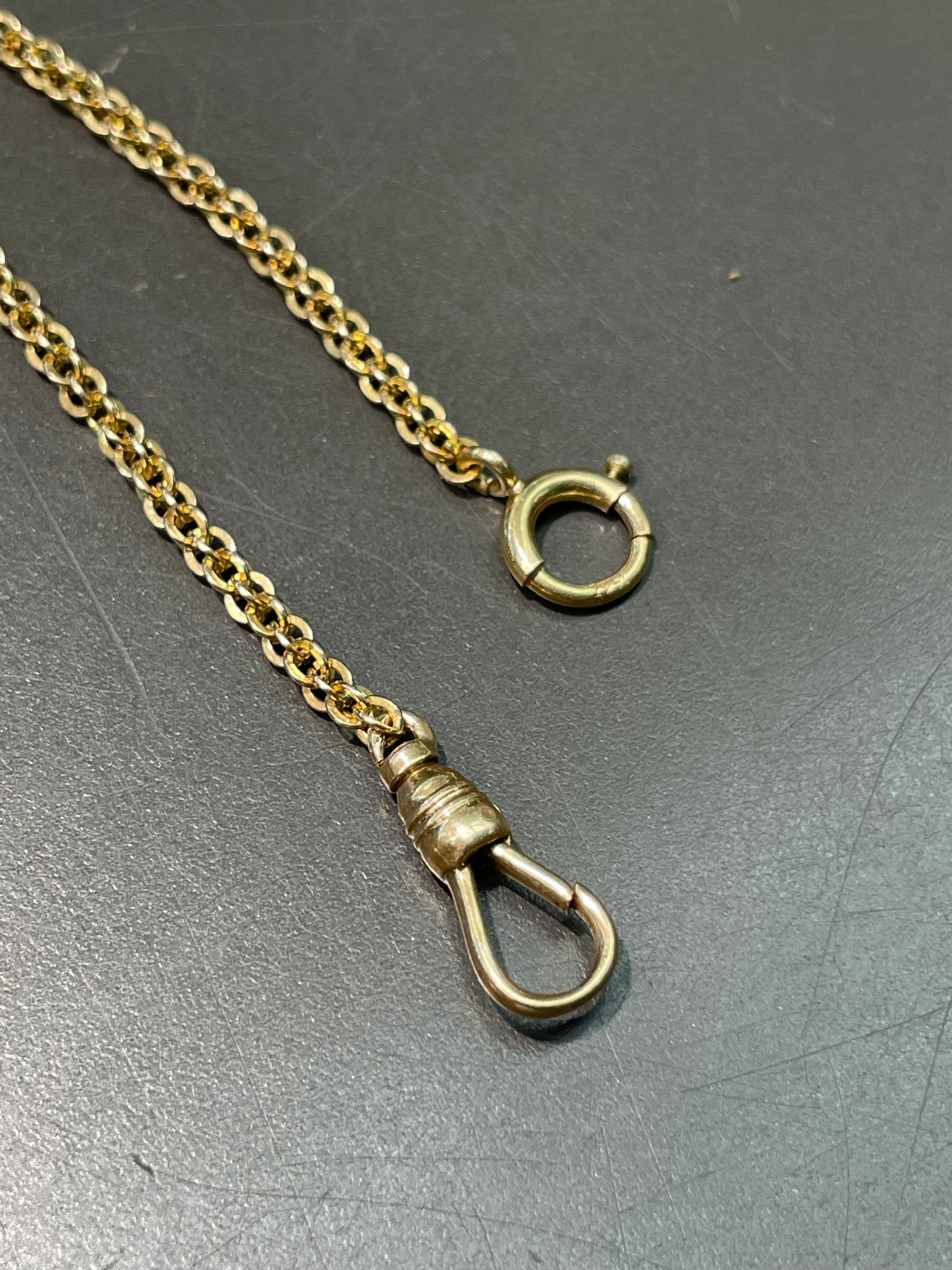 A antique 14K gold watch chain featuring interlocking chains secured with a dig clip and bolt.
