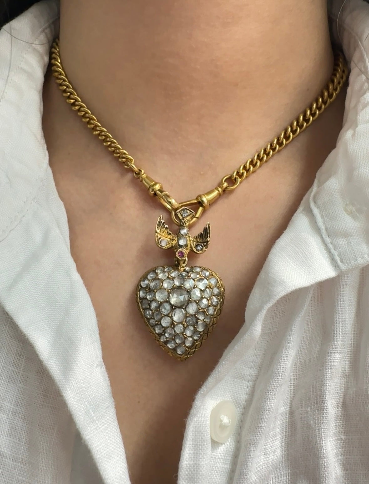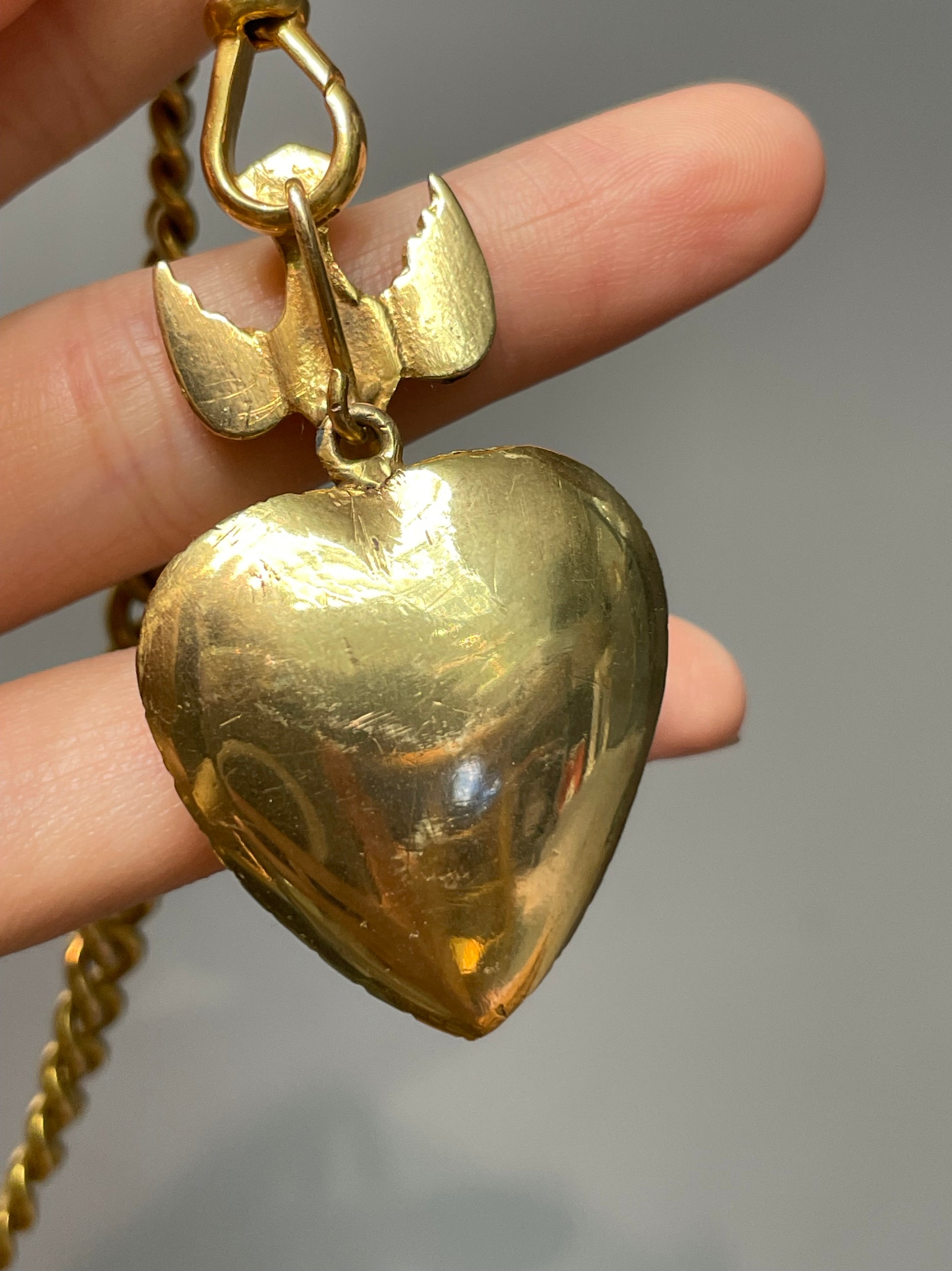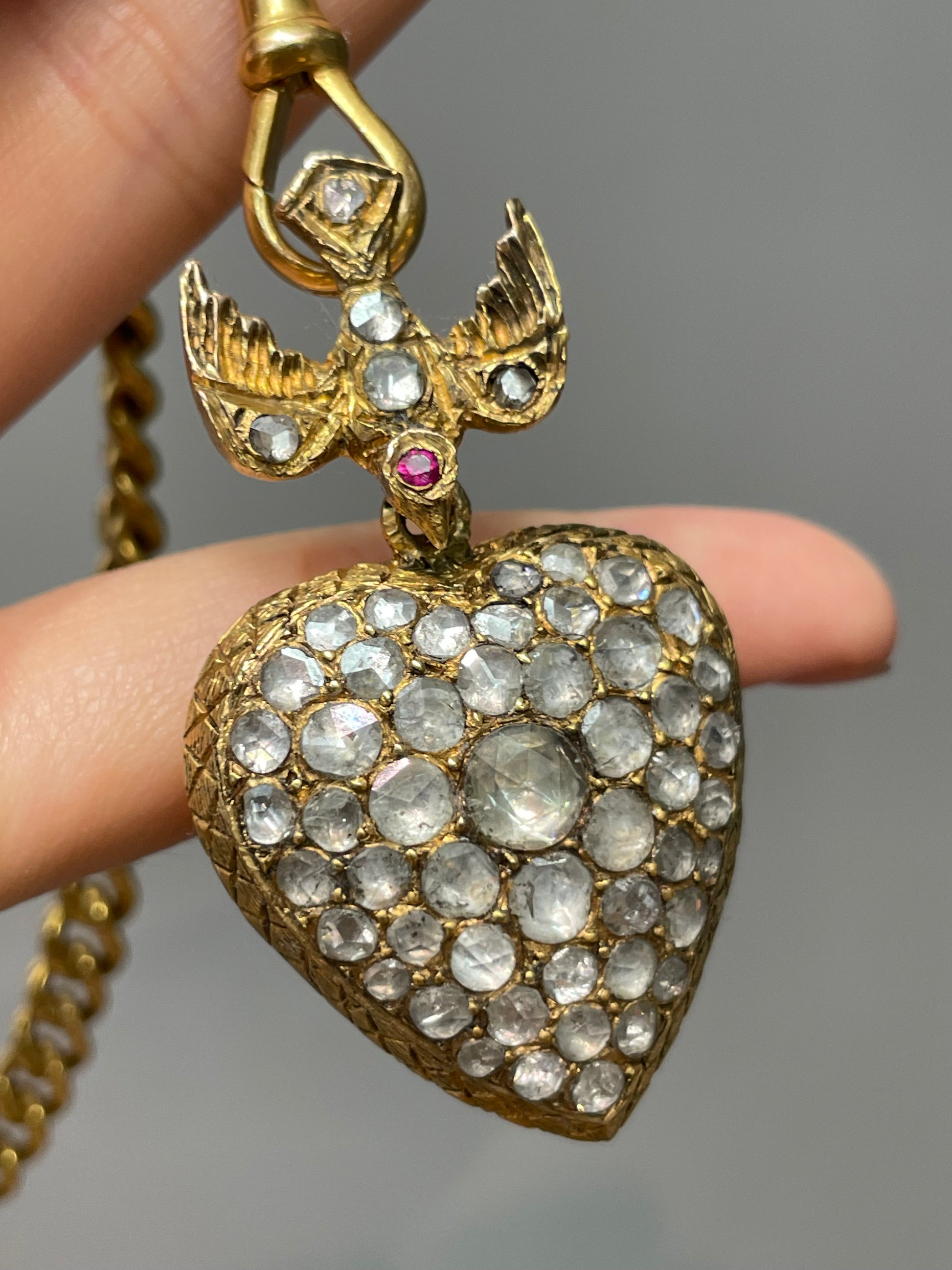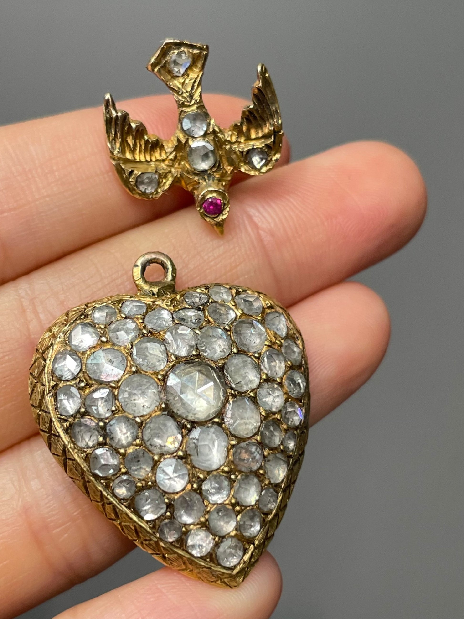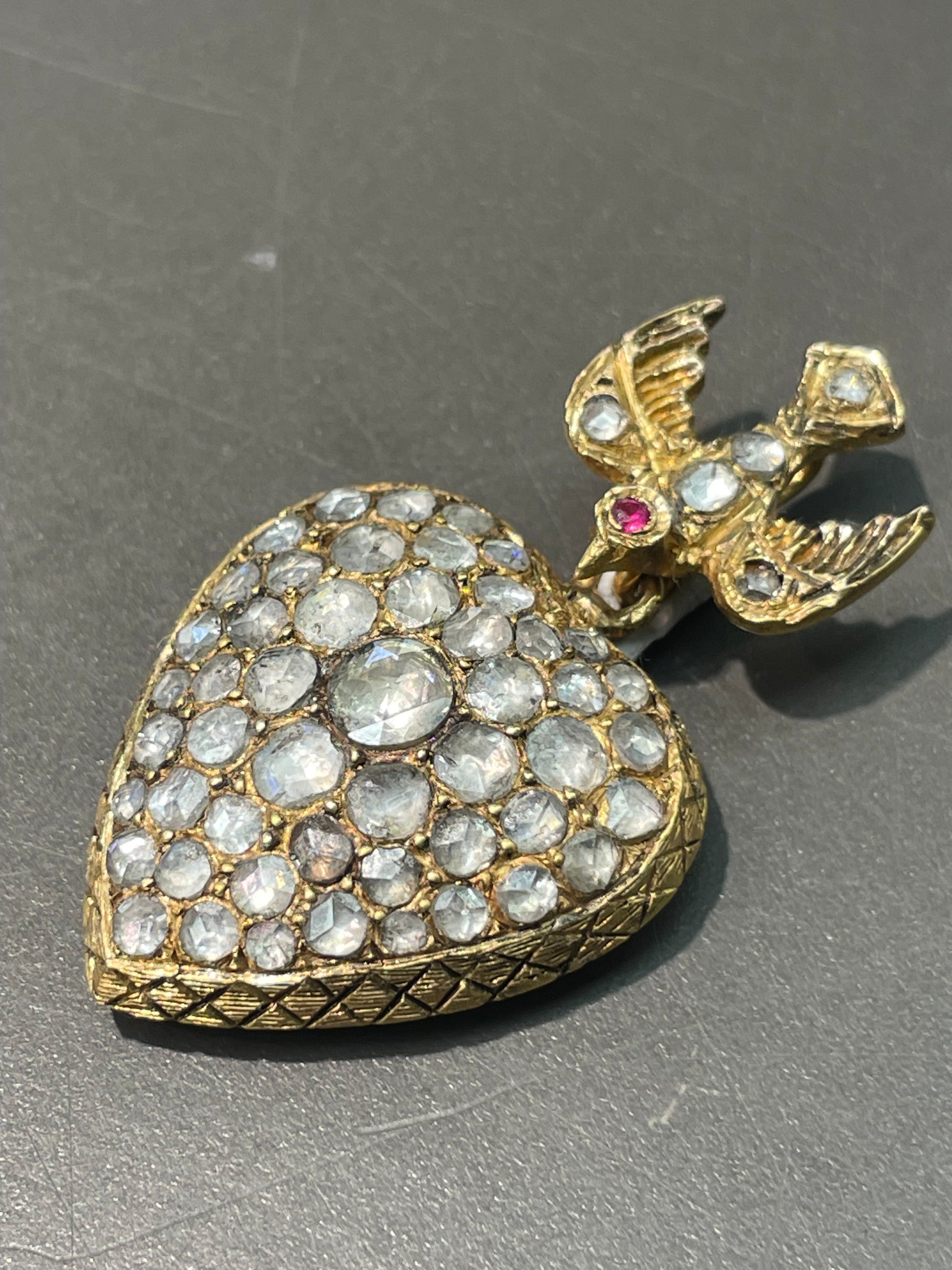 A magnificent antique 14K gold St. Esprit heart pendant crafted from 14K yellow gold featuring a graceful swallow in flight, descending toward a sweet, rounded heart—both lovingly set with glimmering foiled-back rose cut diamonds totaling an impressive 4.0 carats (SI clarity, H-J color).