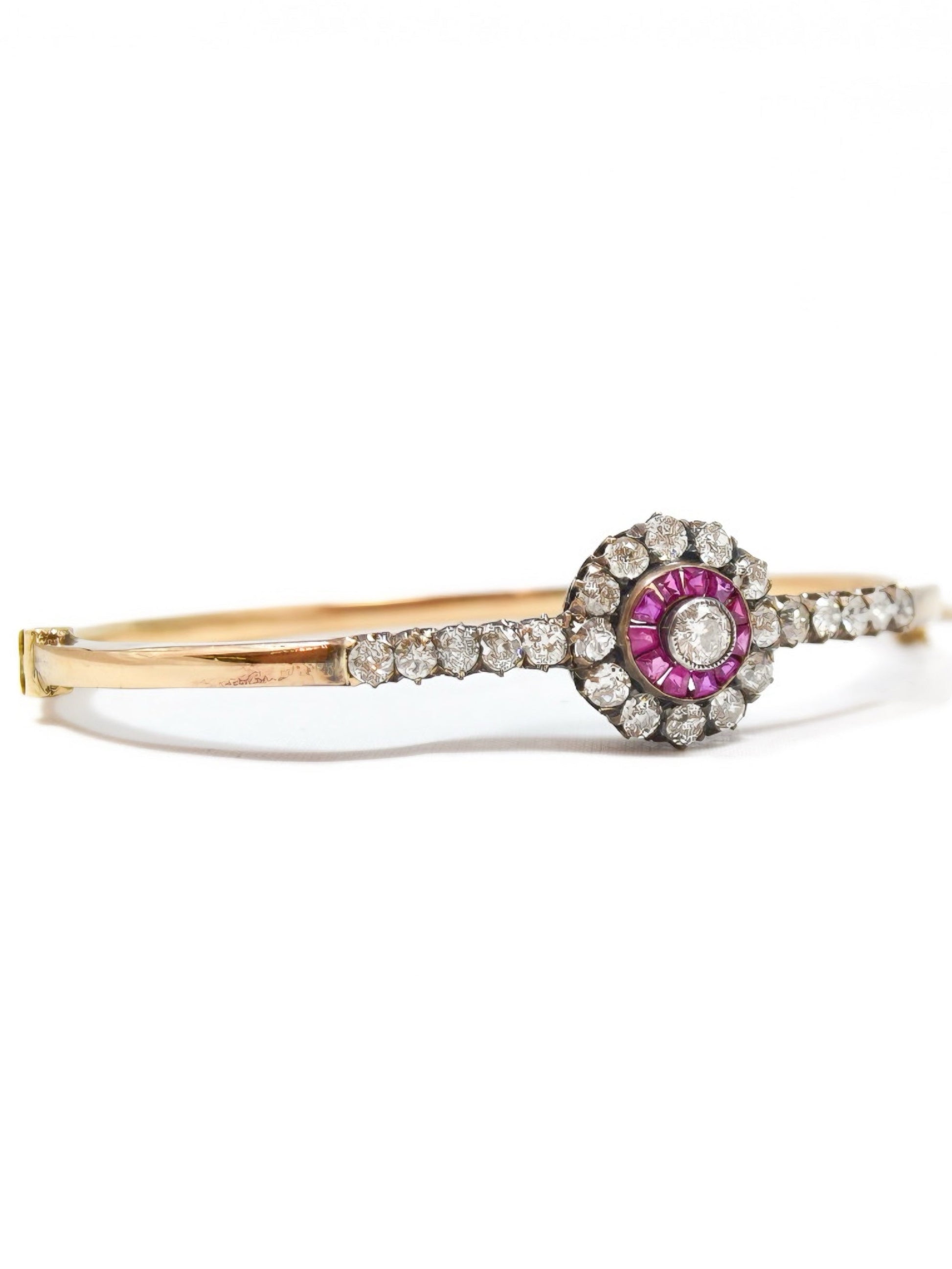 A striking antique bangle featuring a classic target design set with old mine-cut diamonds and vibrant rubies. At its center rests a circular old mine-cut diamond, surrounded by a halo of rich pink rubies and encircled by a cluster of old mine-cut diamonds.