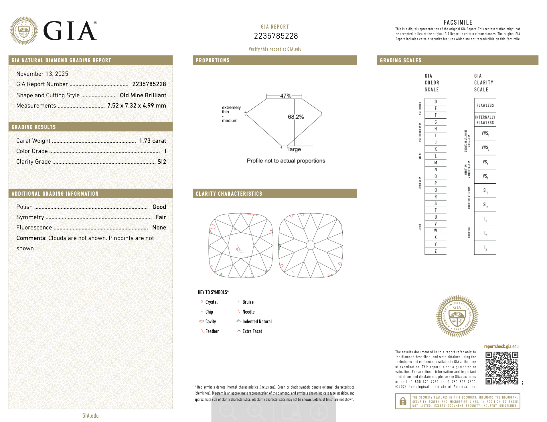 - Carat Weight of Center Diamond: 1.73 carats (SI clarity, I color) (7.5 mm by 7.5 mm)