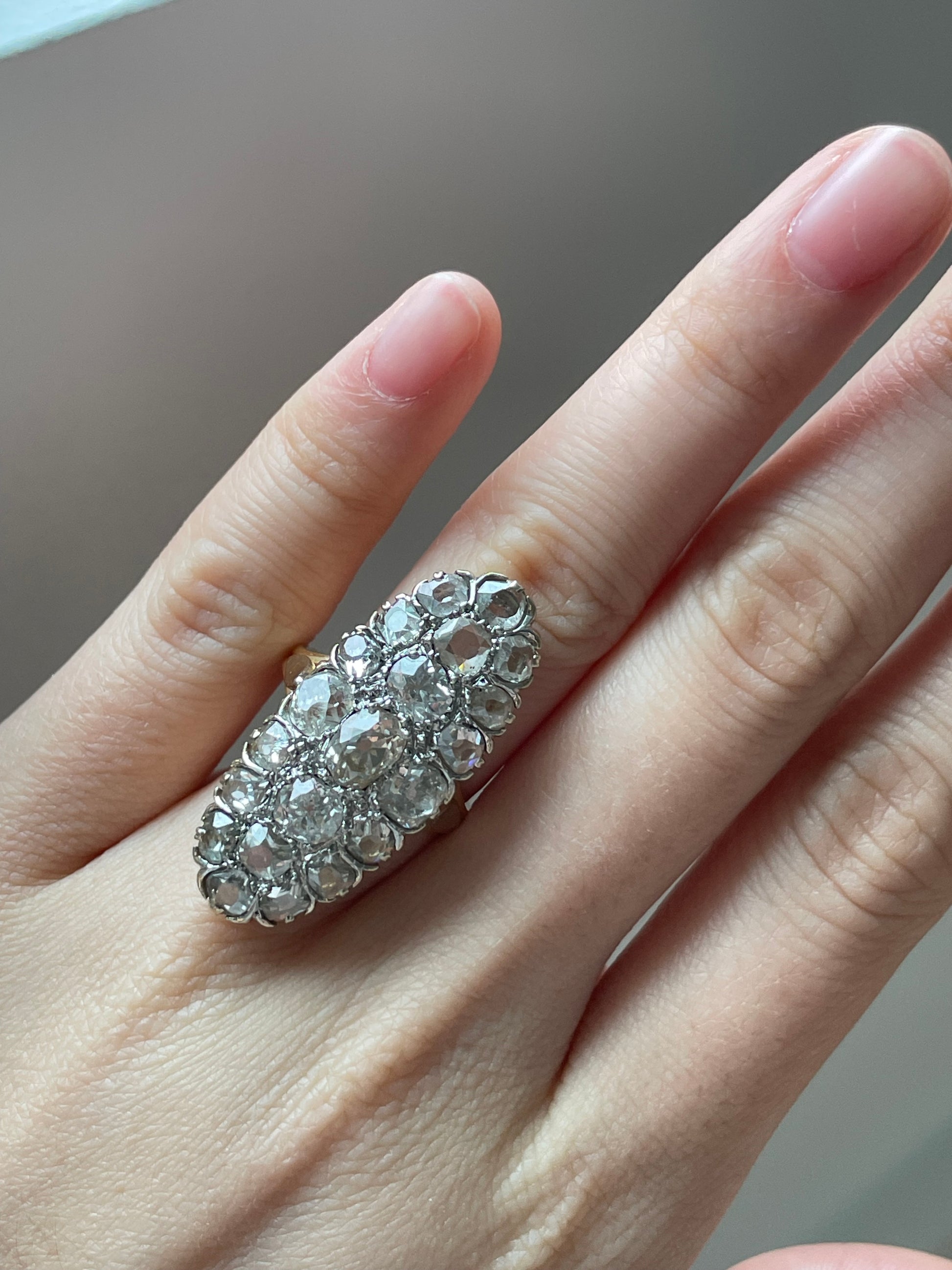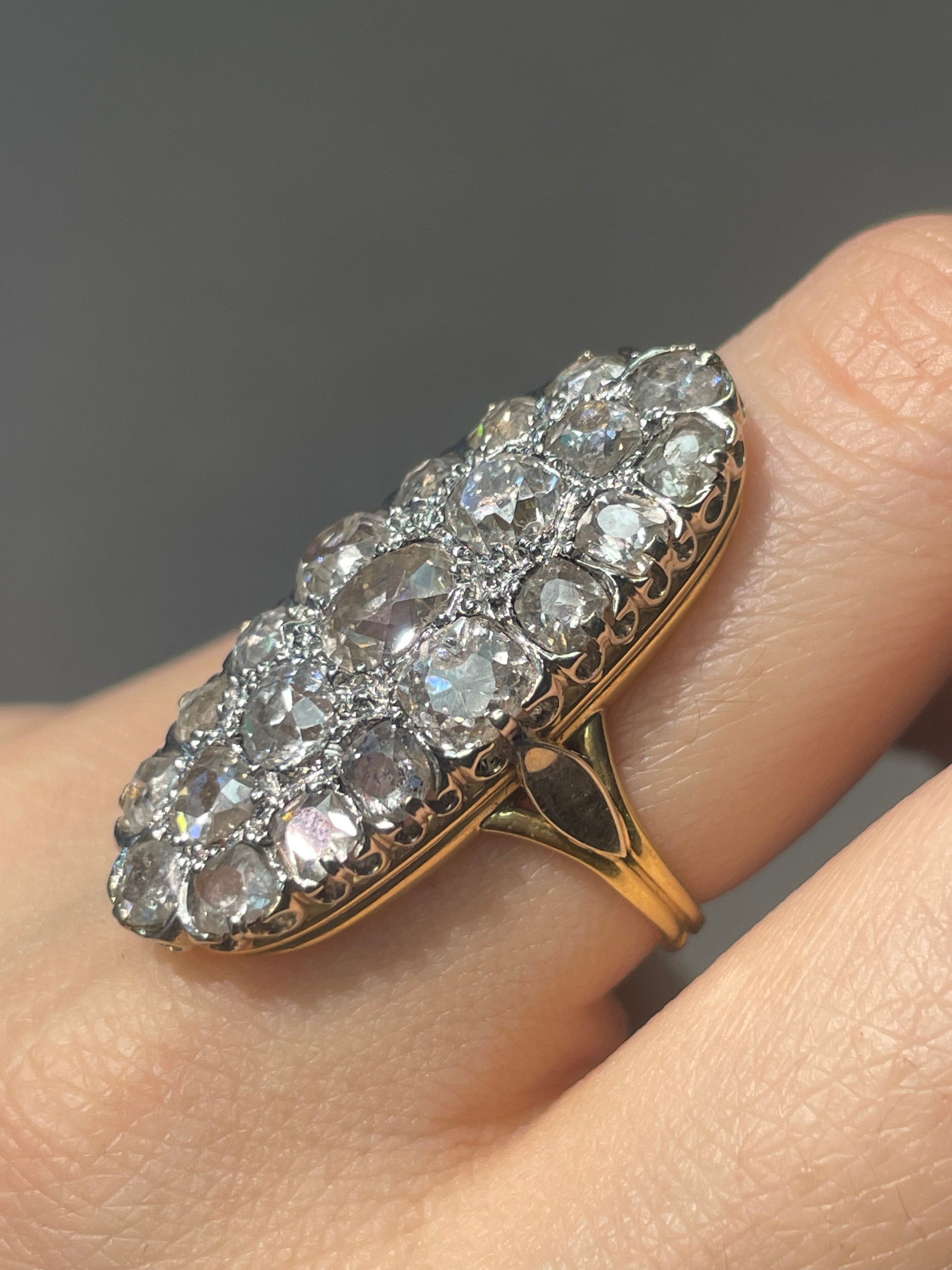Antique French 18K Yellow Gold 6.5 CTW Old Mine Cut Diamond Oval Cluster Statement Ring