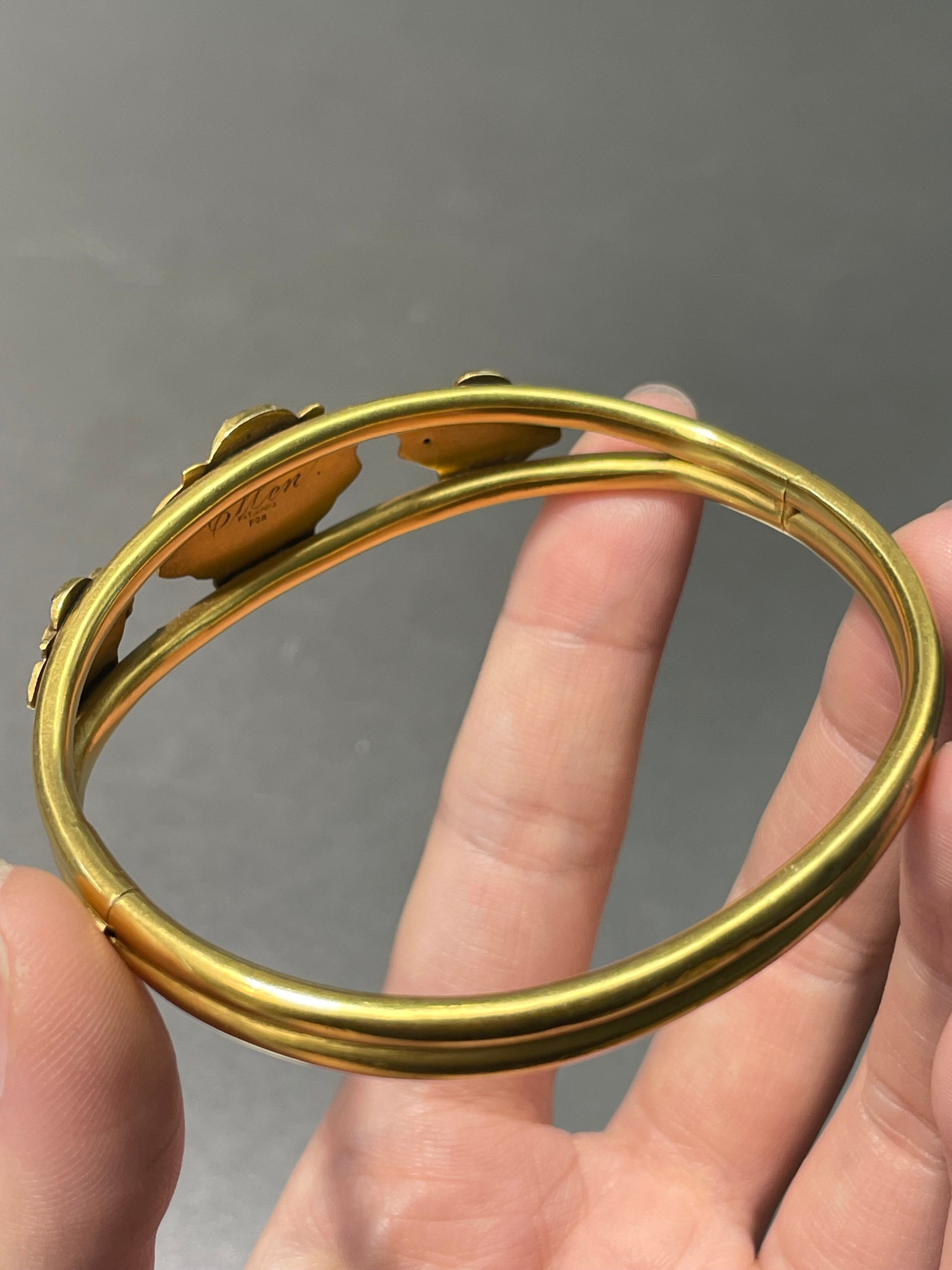 Un bracelet spectaculaire de l’époque victorienne magistralement confectionné en or 14 carats représentant trois adorables lions. Accentué de diamants blancs brillants et de grenats brillants. L'arrière de la tête de lion est signé « PAT.APPD » et « FOR » « Ellen ».