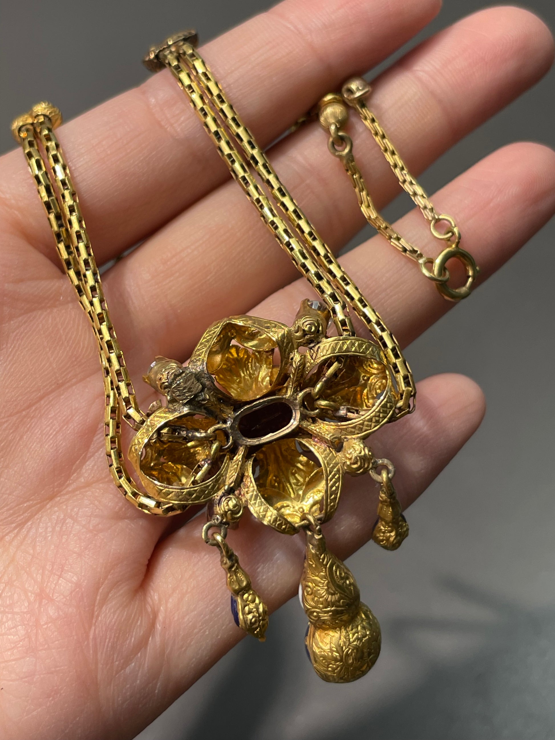 A stunning Victorian Etruscan-style necklace crafted in 22K gold centered with a pomegranate red garnet surrounded by seed pearls along with four sparkling brilliant white diamonds (I Clarity, J Color). It's ornately decorated with intricate scrolls of repoussé detailing along with three drop-shaped tassels, each adorned with white and royal blue enameling accents.