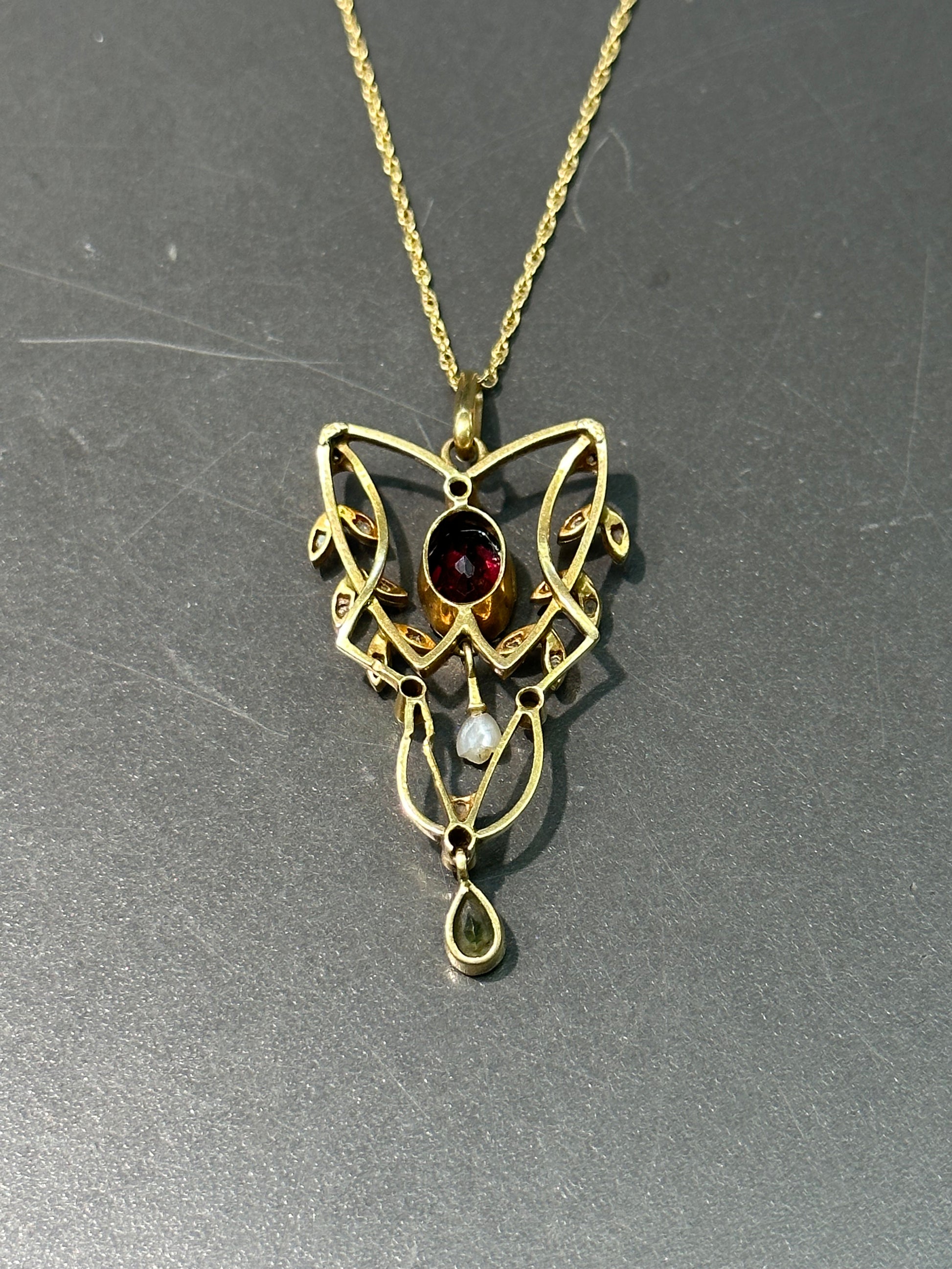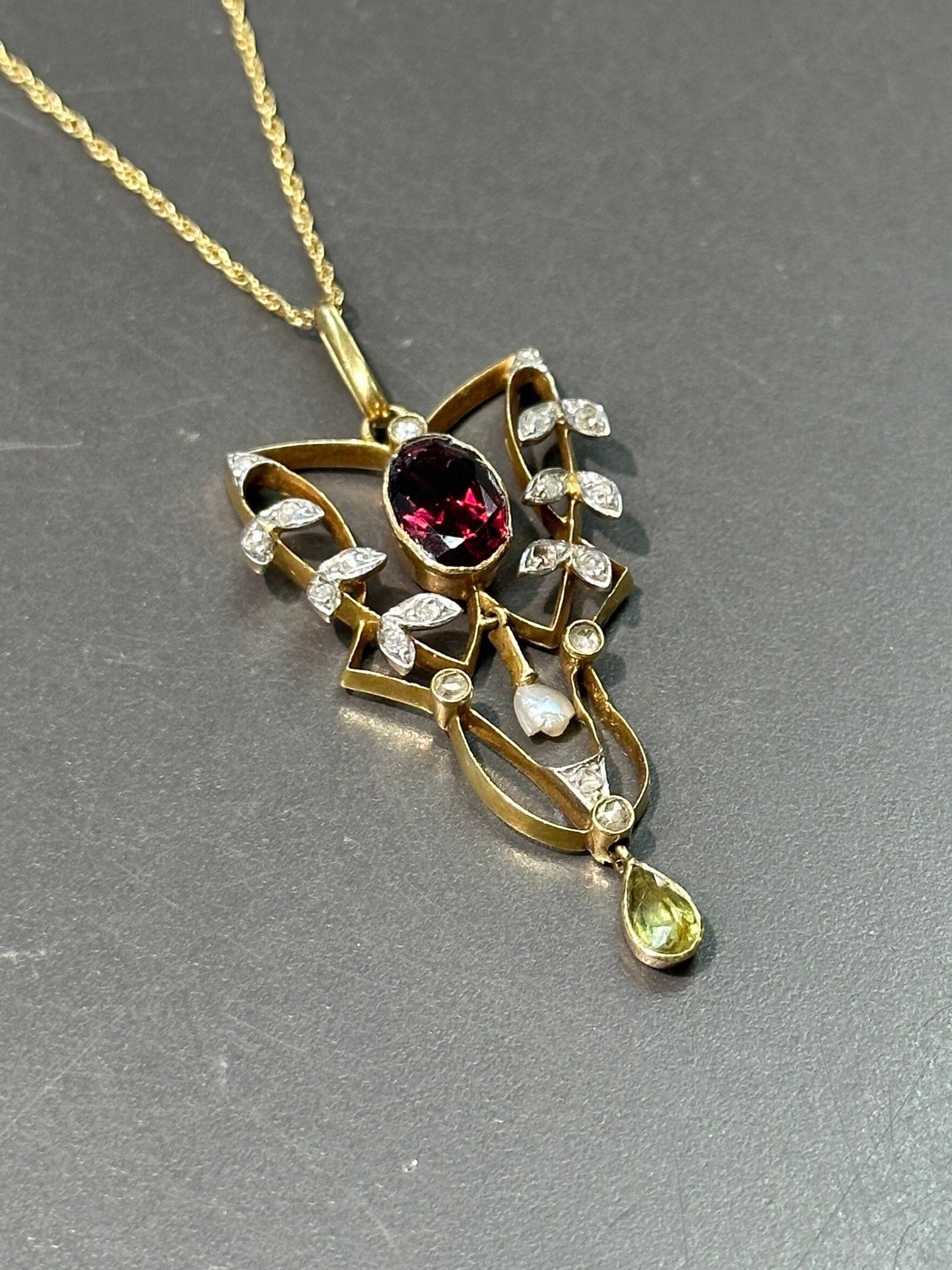 Art Déco 14K Or Lavaliere Grenat Péridot Diamant Graine Perle Pendentif