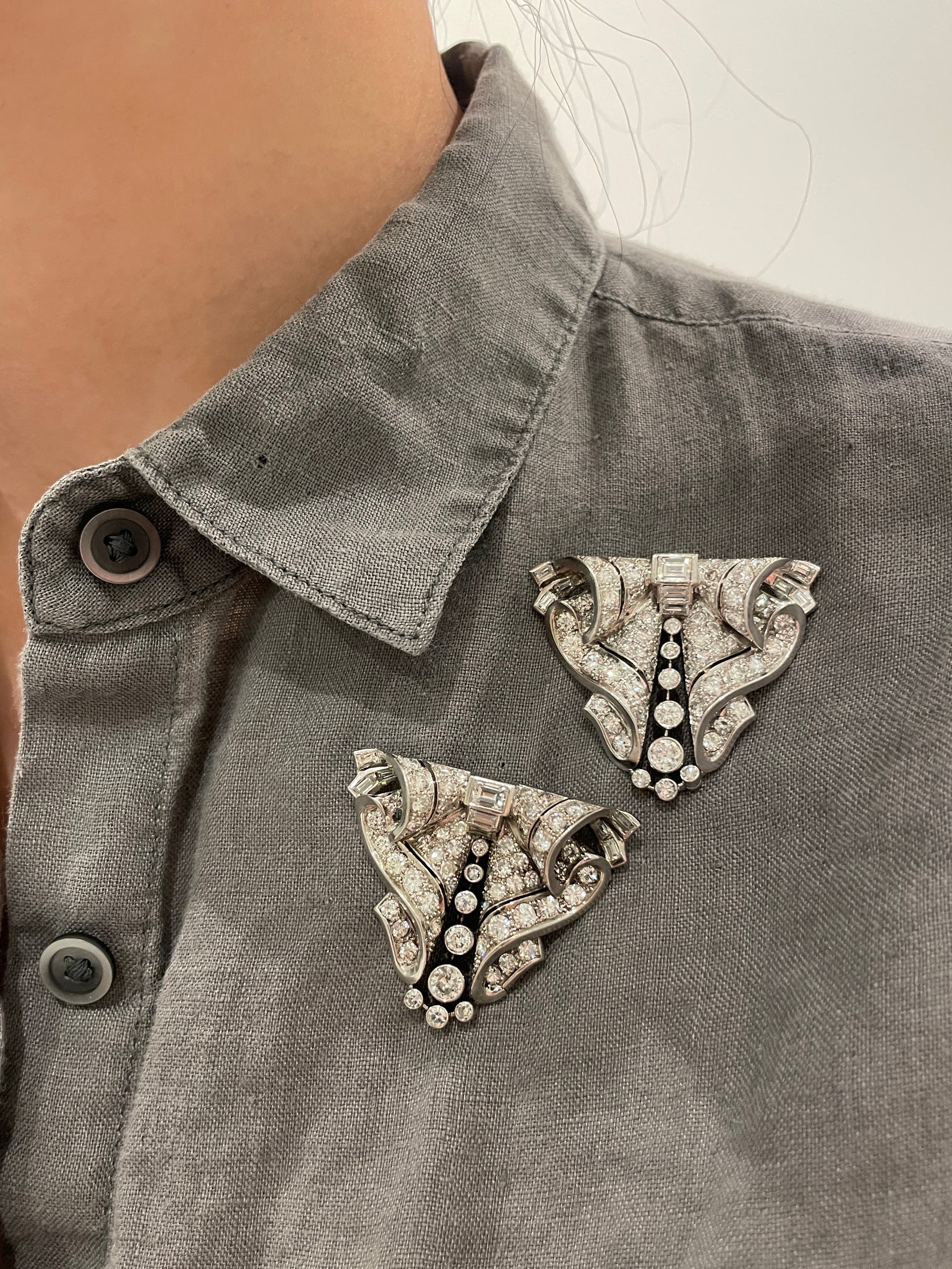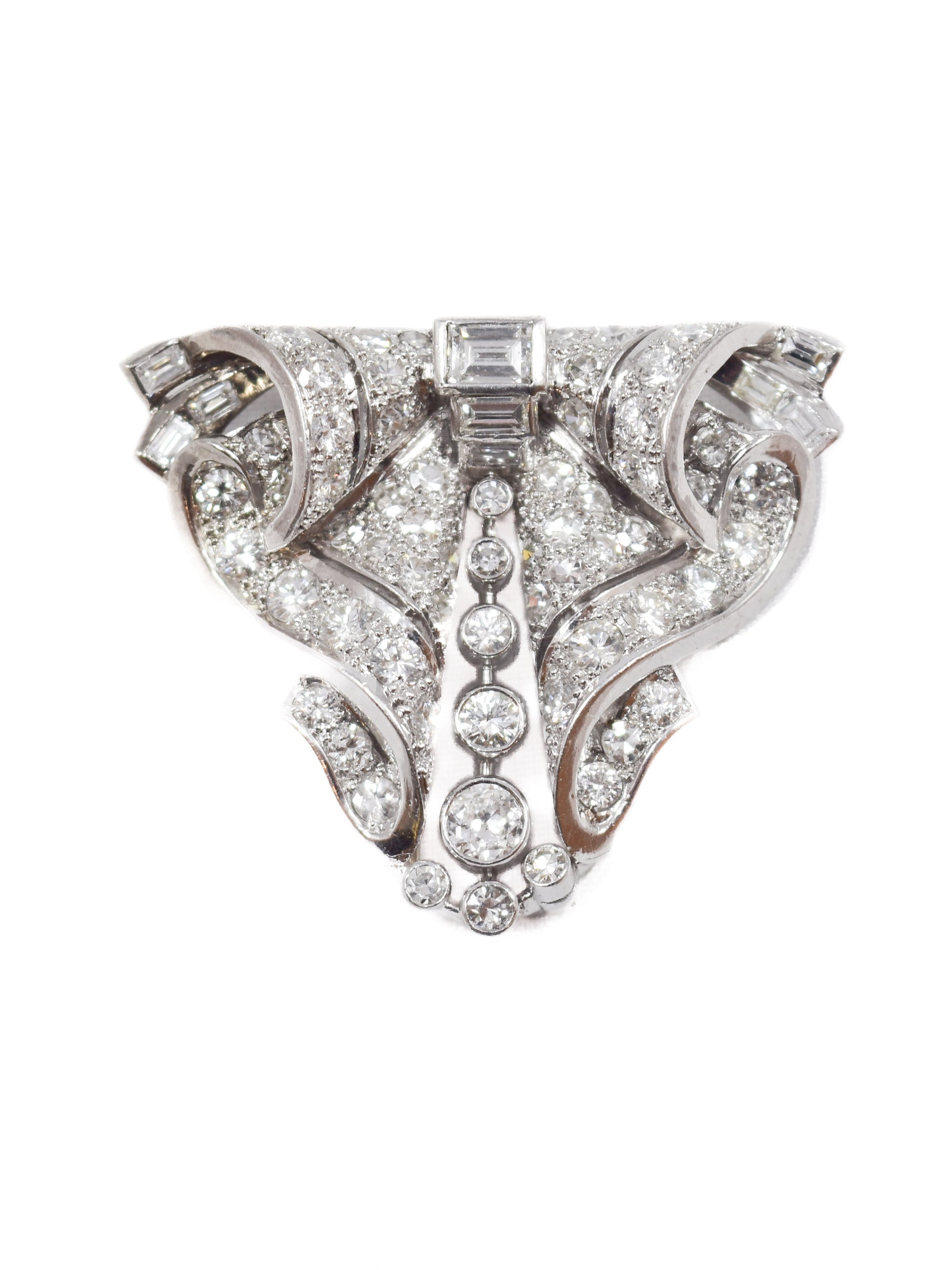 An impressive Art Deco diamond double-clip brooch featuring bold geometric lines, dazzling with approximately 12.38 carats of icy white round and straight baguette-cut diamonds. Bright, lively, and full of sparkle, the diamonds catch the light from every angle and truly steal the show. Designed to be worn as a full brooch or separated into two clips, it’s a versatile statement piece—perfect for special occasions, glamorous evenings, or whenever you feel like turning heads. Hand-fabricated in platinum with a 14K white gold pin mechanism.