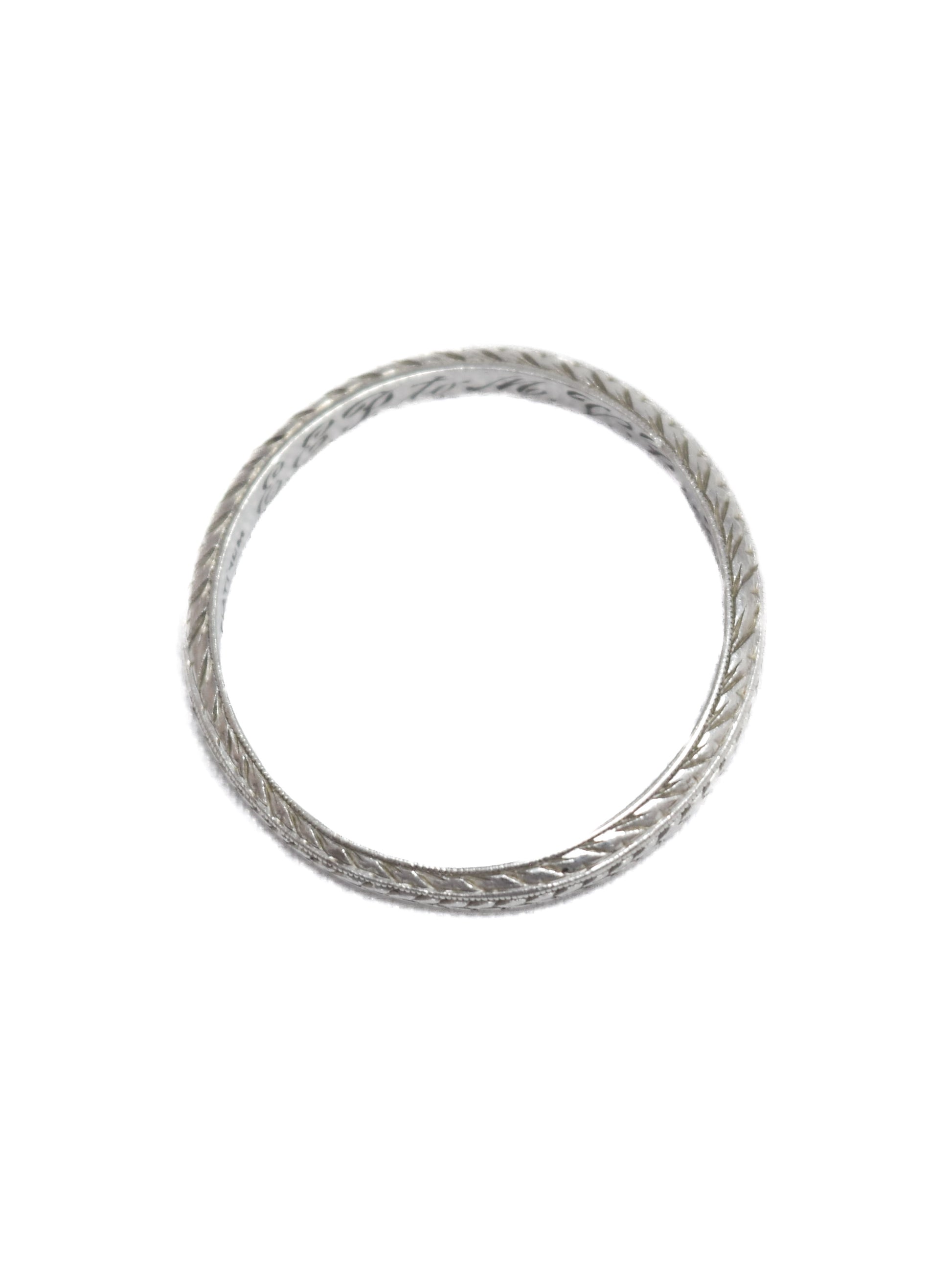 An Art Deco platinum band engraved with wheat motif fully around.