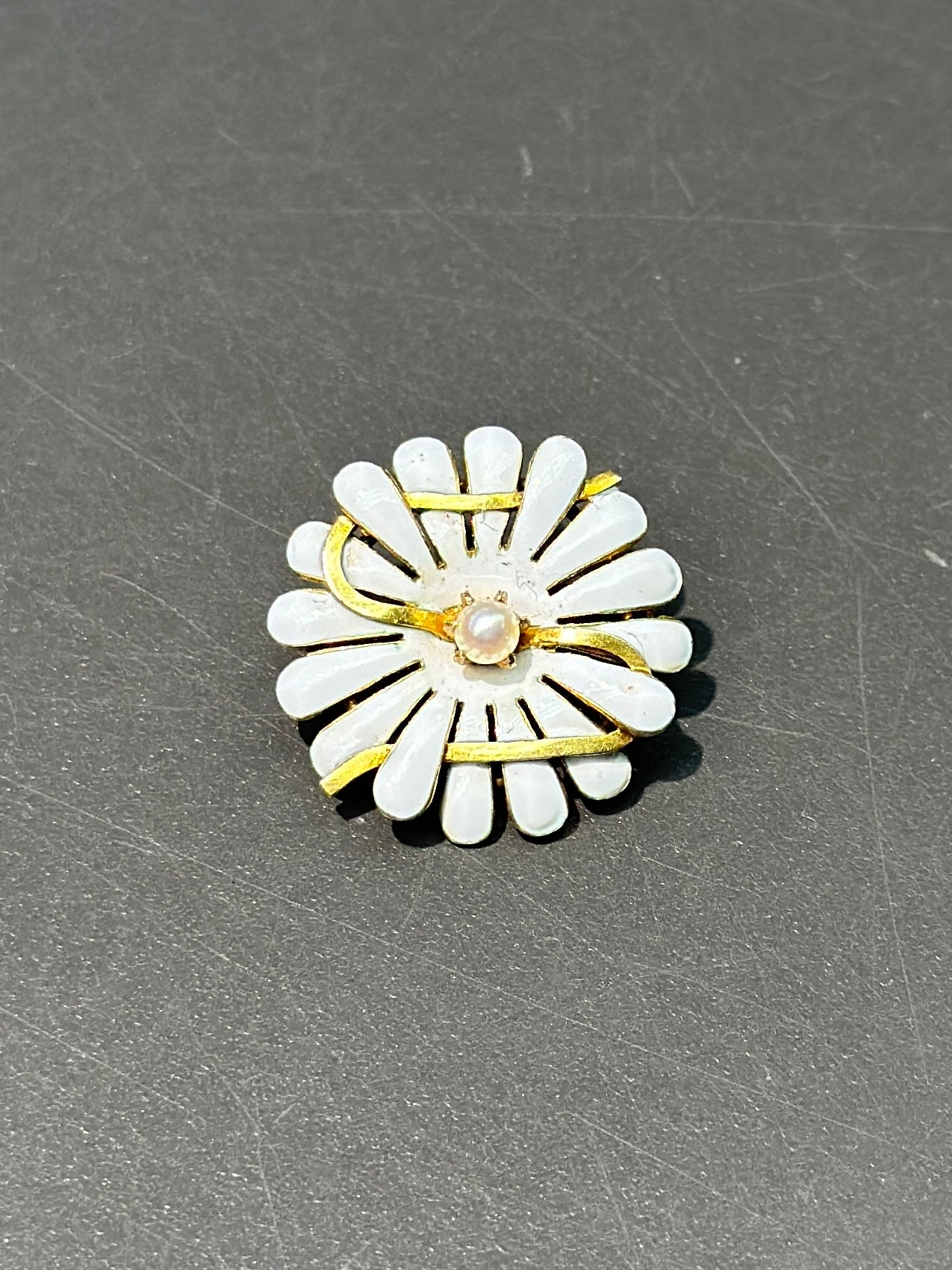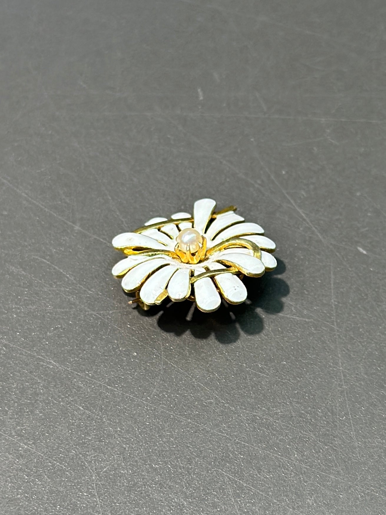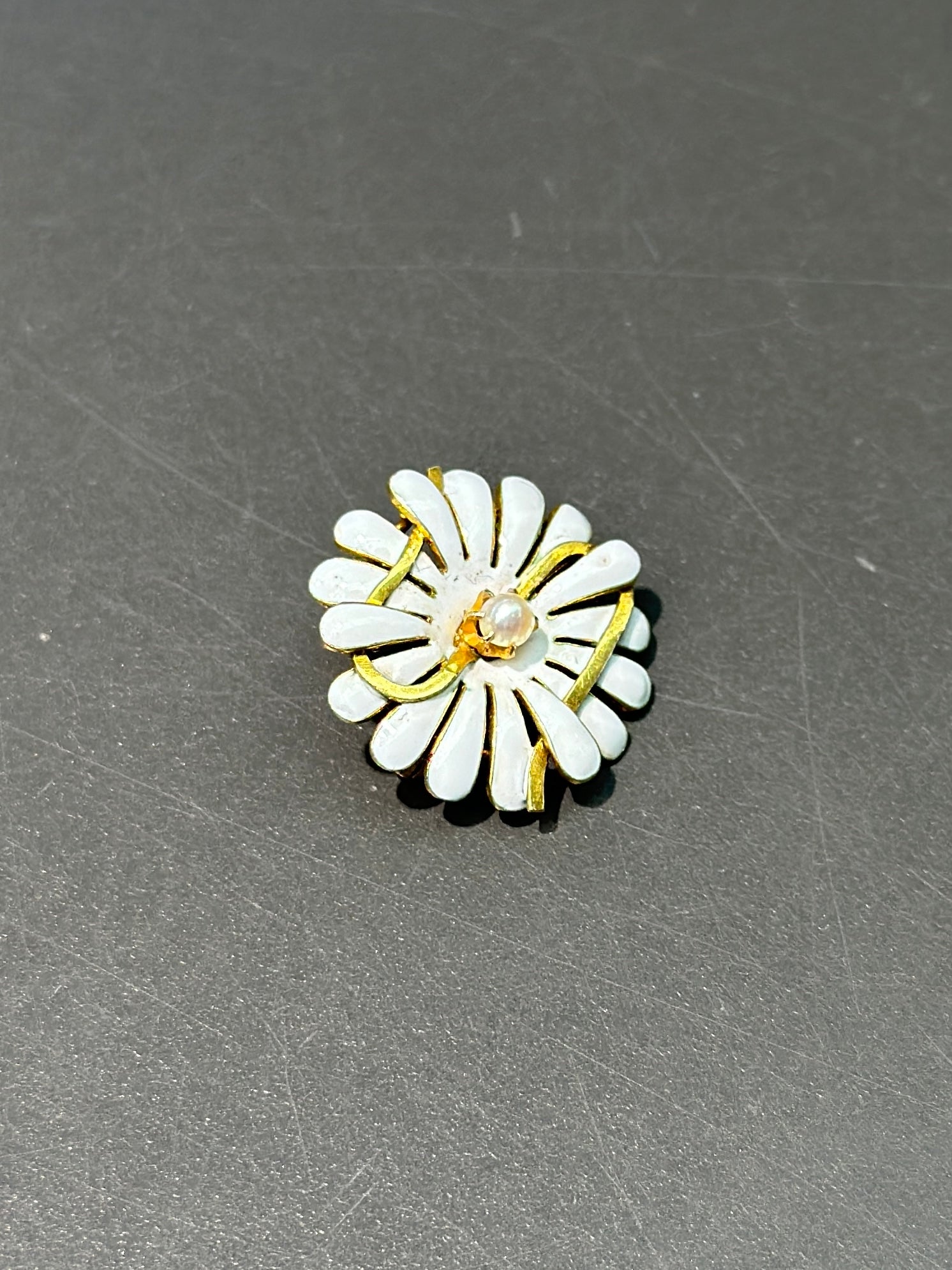 Broche Art Nouveau en émail marguerite blanche en or 14 carats