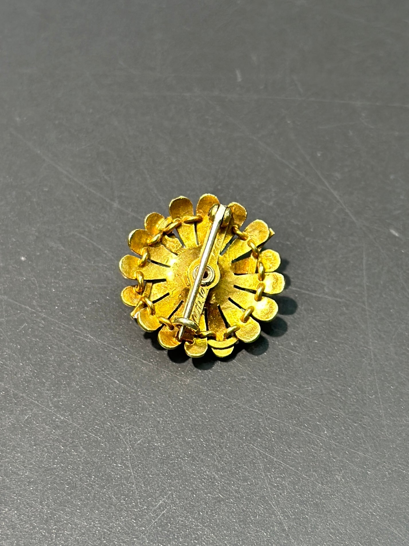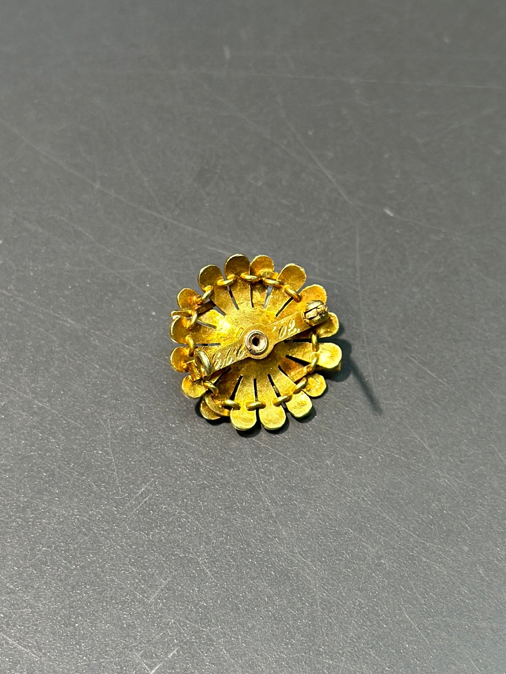 Datant de l'époque Art Nouveau, une jolie broche en forme de marguerite surmontée d'émail blanc et entourée d'un ruban jaune brillant. Fabriqué à la main en or 14 carats.