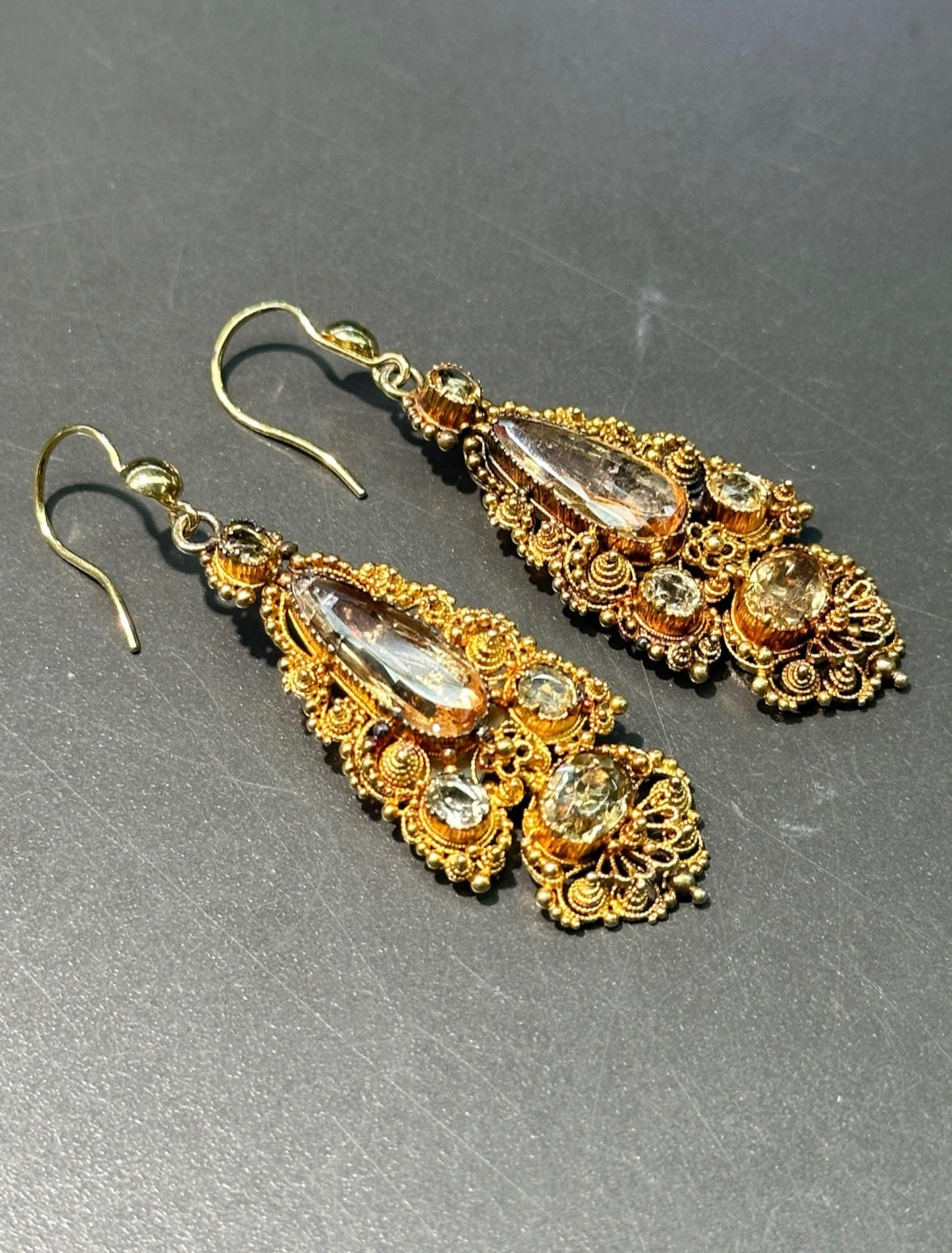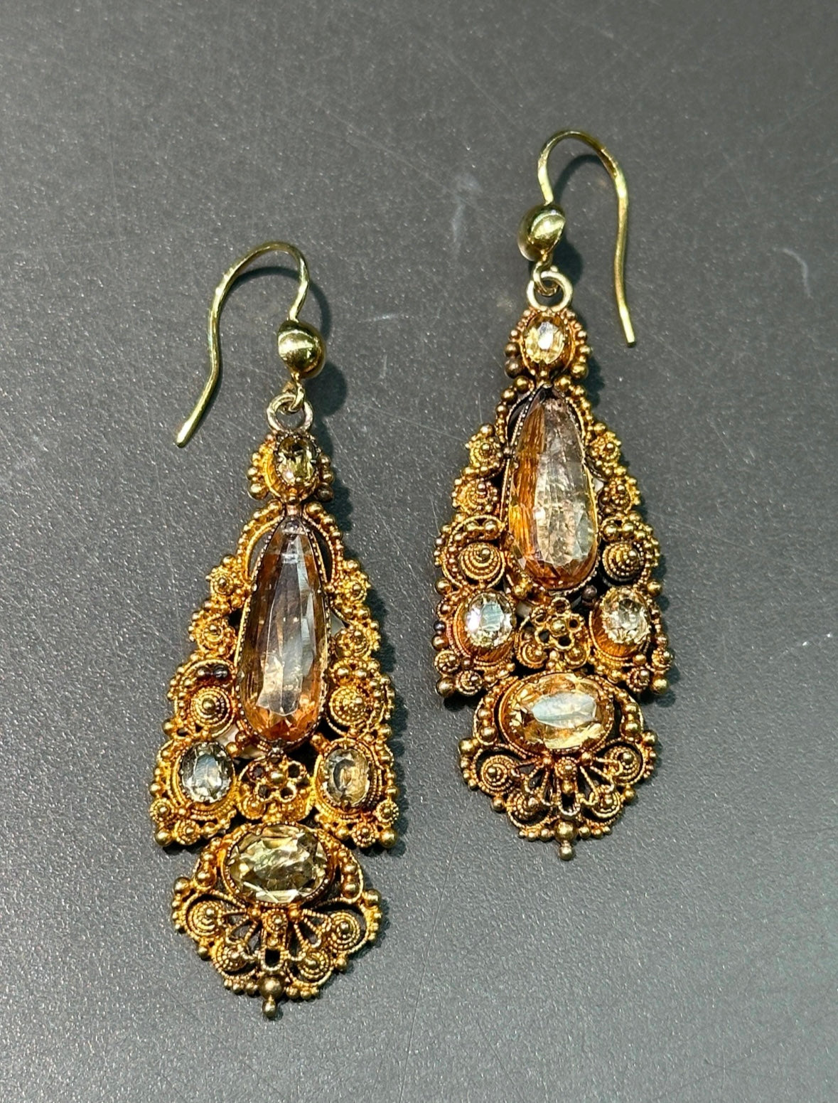 Dates back to the Georgian era, circa 1870’s, a stunning 14K gold foil backed faceted topaz drop earring decorated with elaborate scrolling and floral beadwork and wirework throughout.