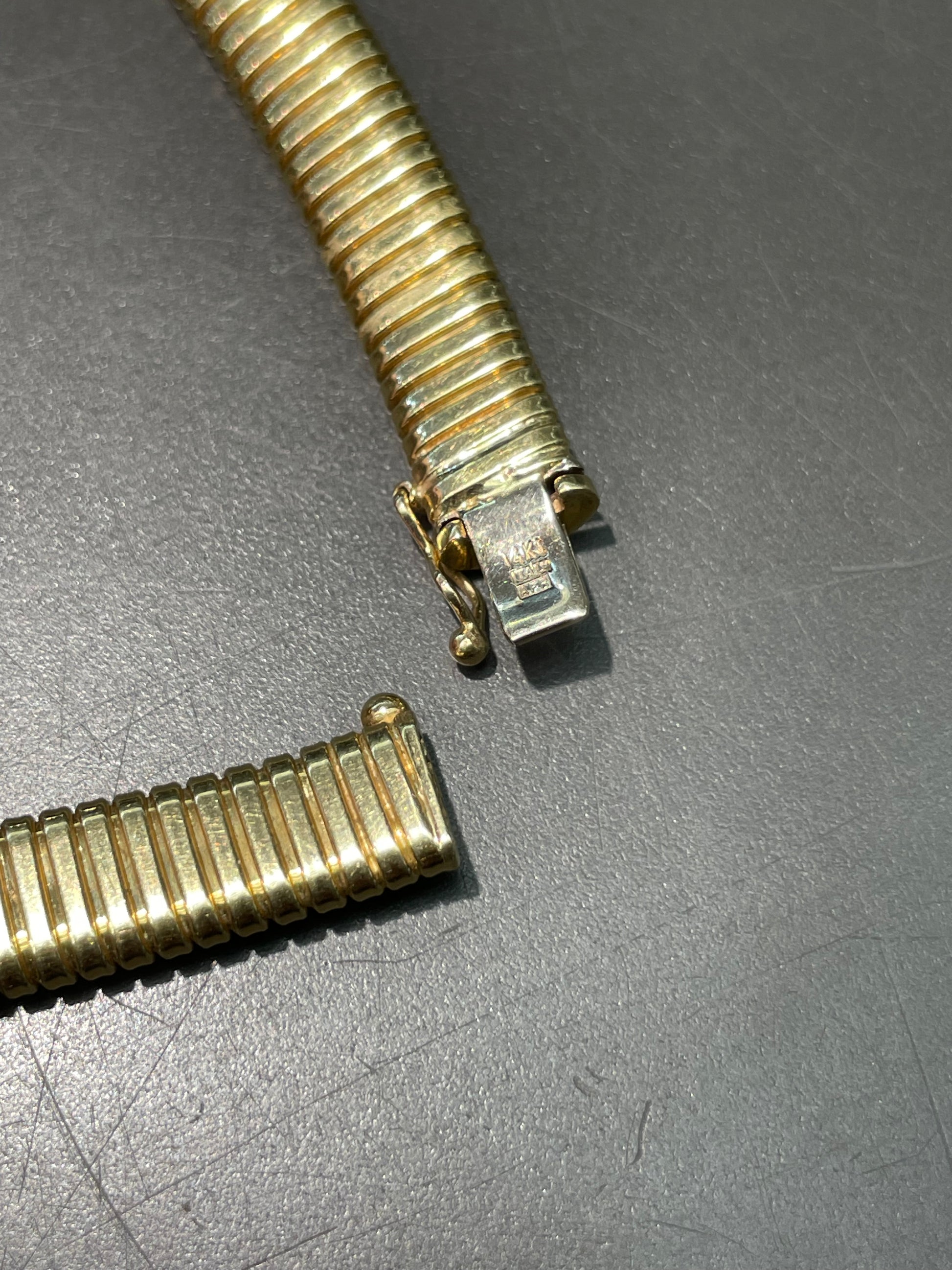 A retro 14K yellow gold semi-hollow tubogas chain necklace made of interlocking flexible links with a fun, springlike feel. The necklace graduates from 8.5 mm to 12.0 mm, fitting beautifully as a choker or doubled as a bracelet, and finished with a hidden double-tongue box clasp.