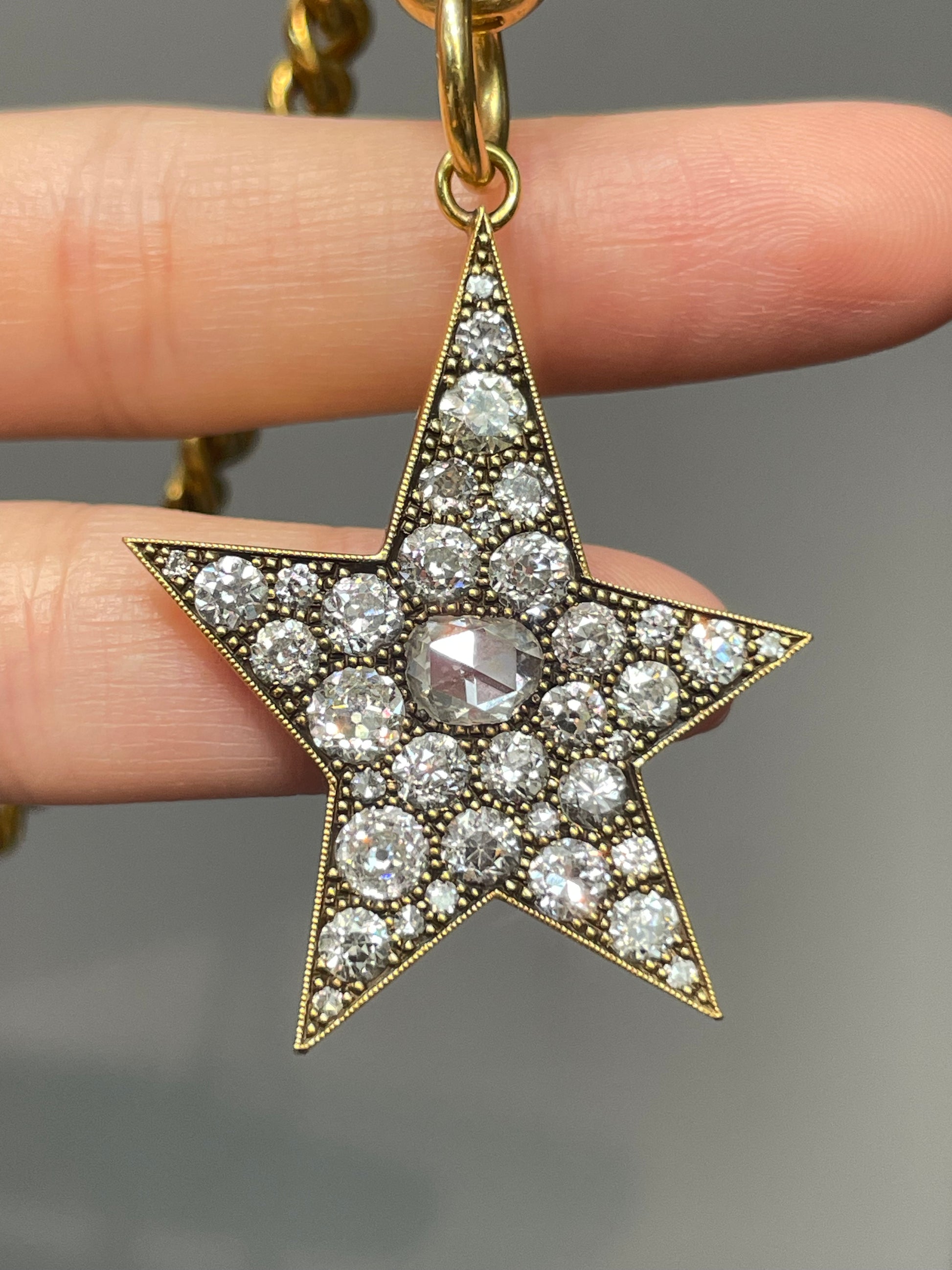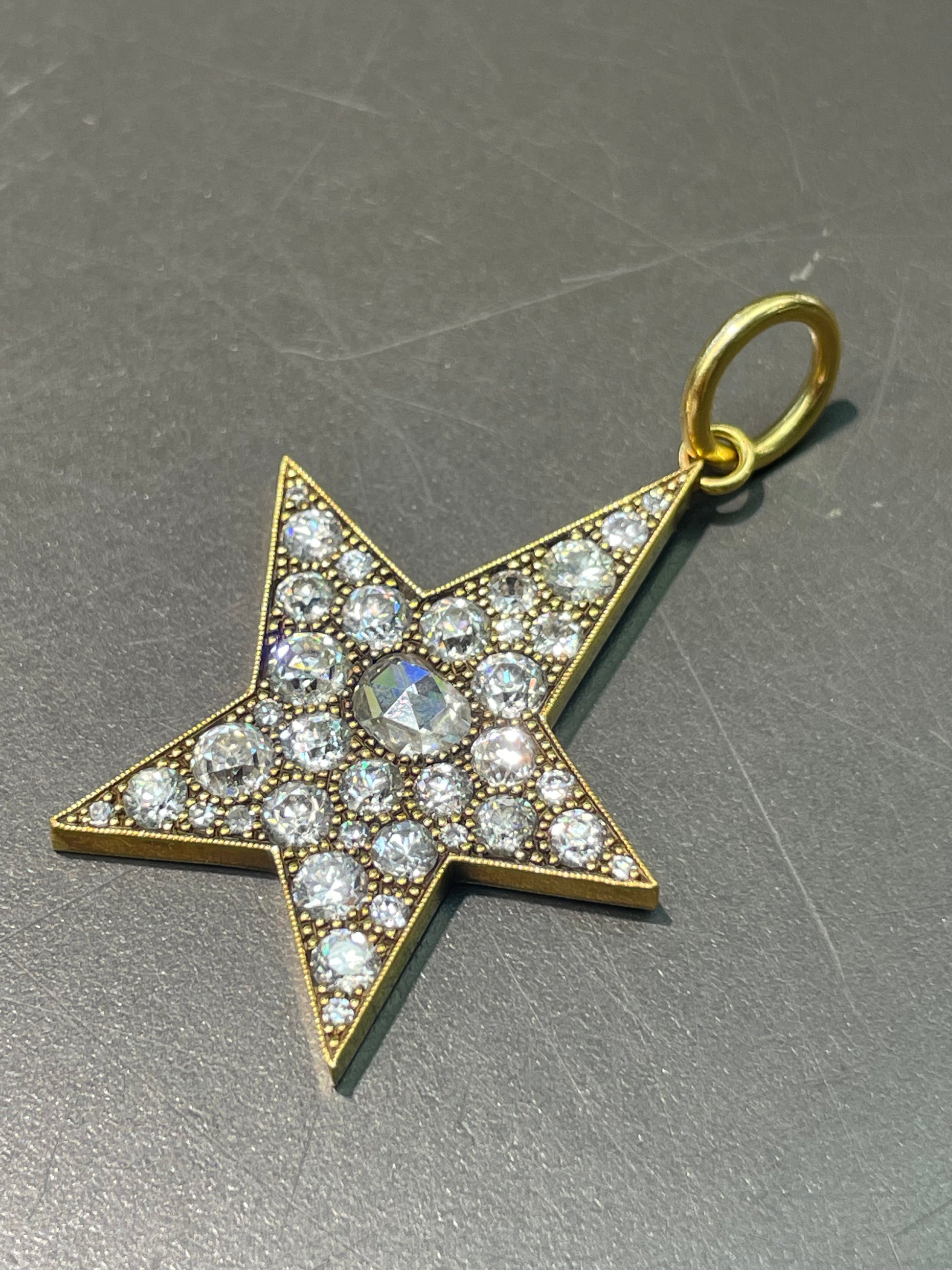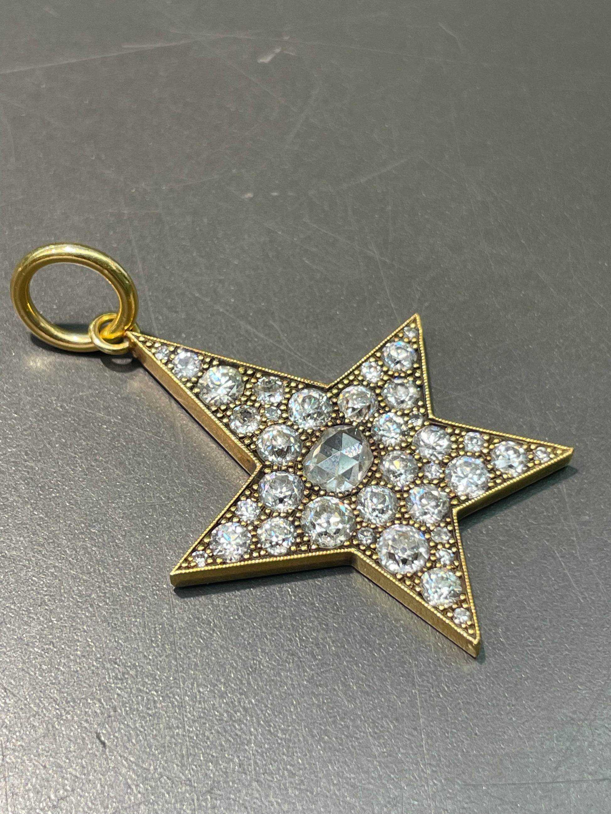 By Single Stone, the large 18K gold diamond Kinsley pendant cobblestone set with approximately 4.0 carats (G-H color and VS-SI clarity) of rose cut diamond and old mine cut diamonds in a handcrafted asymmetrical star setting.