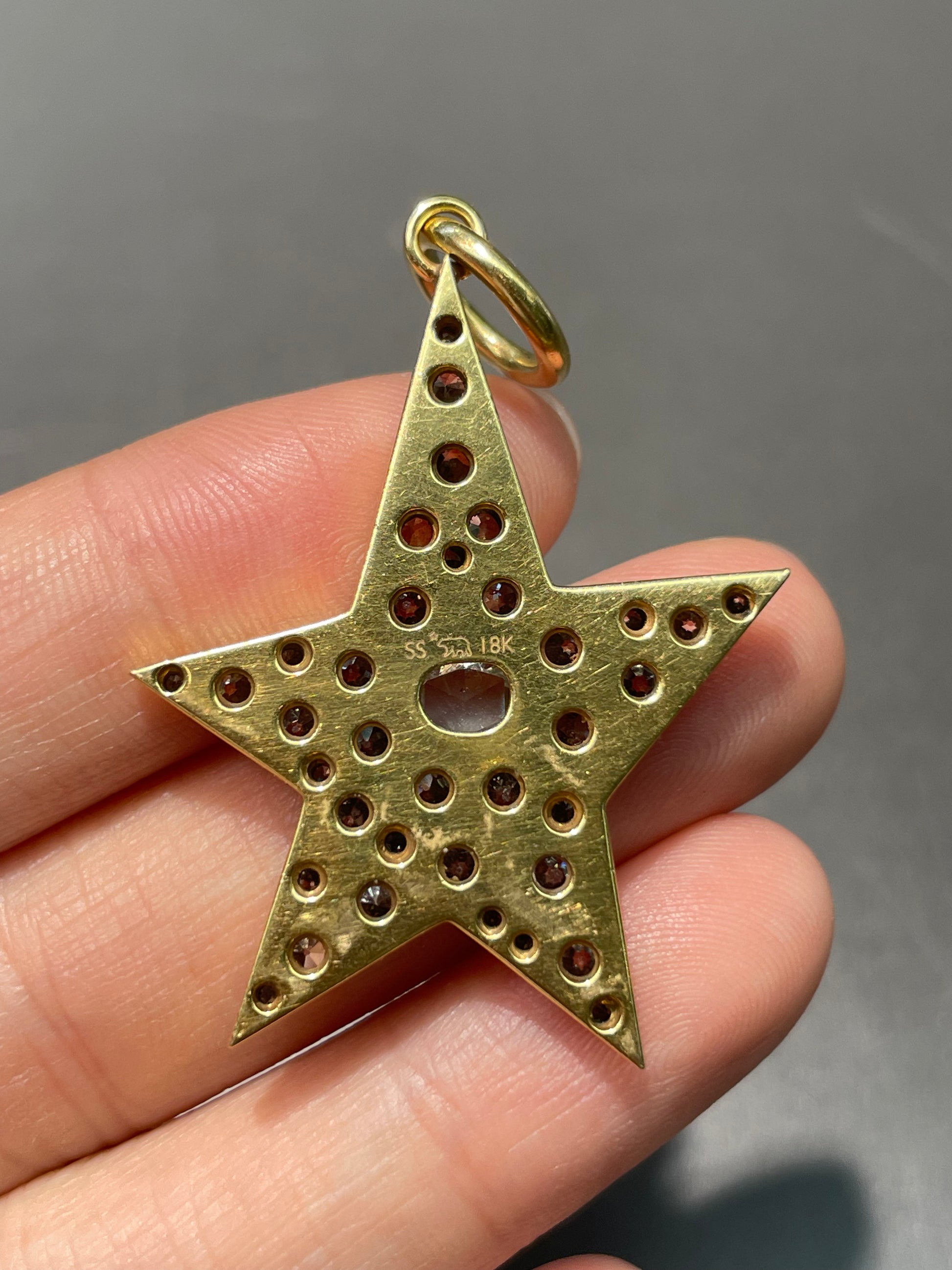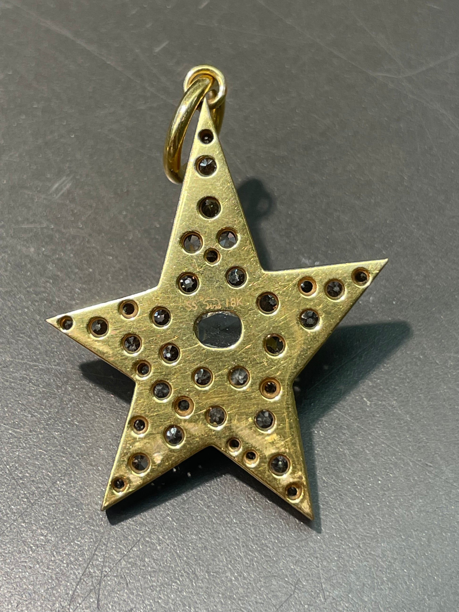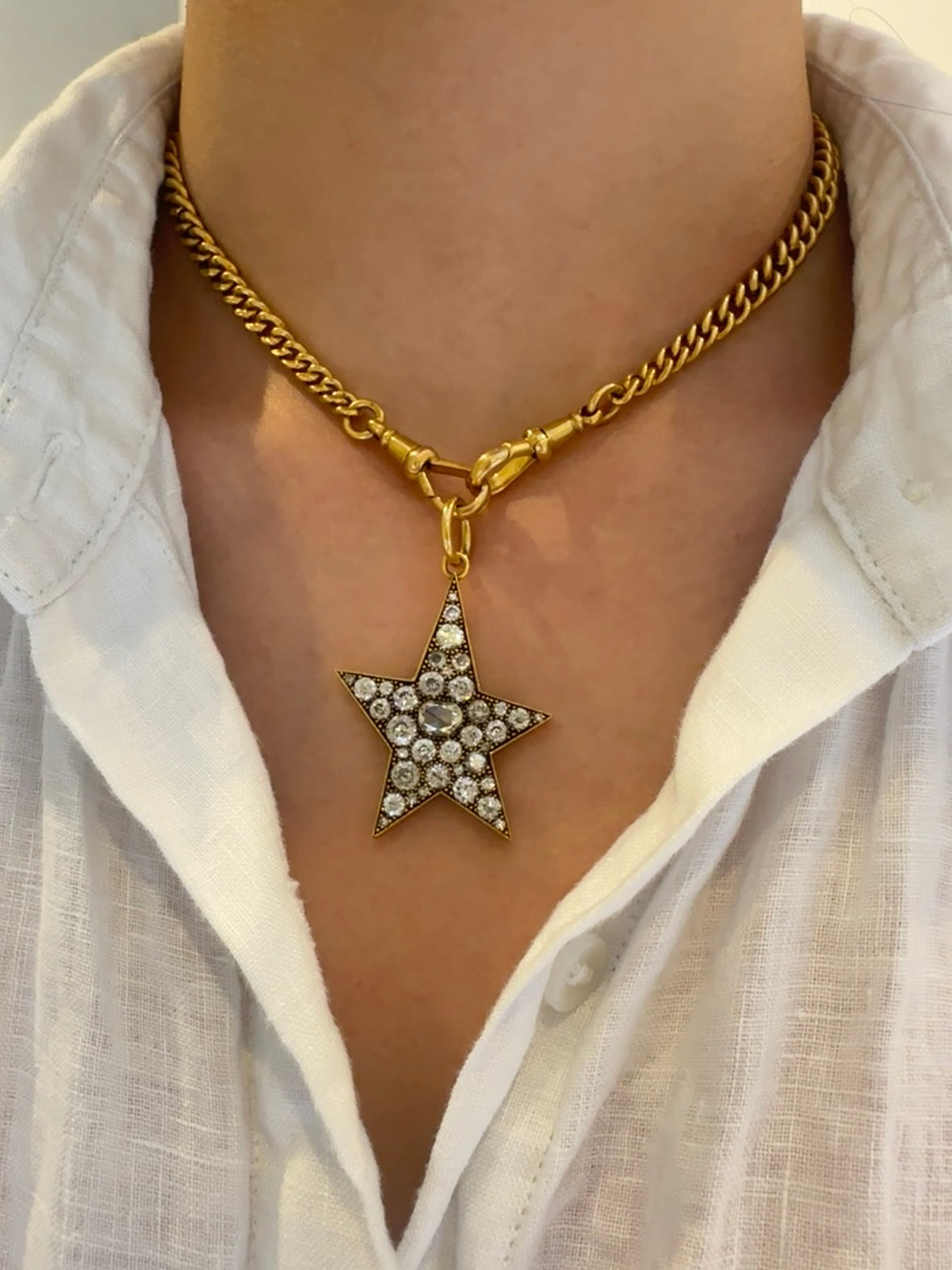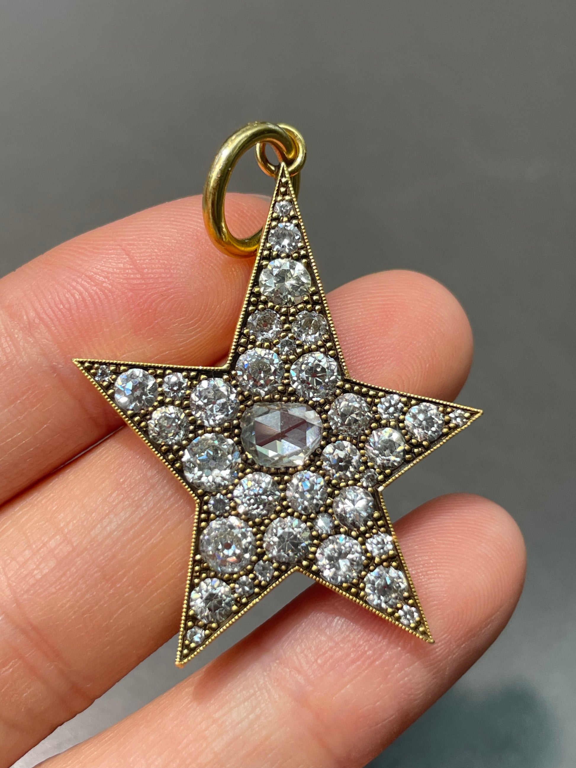 By Single Stone, the large 18K gold diamond Kinsley pendant cobblestone set with approximately 4.0 carats (G-H color and VS-SI clarity) of rose cut diamond and old mine cut diamonds in a handcrafted asymmetrical star setting.