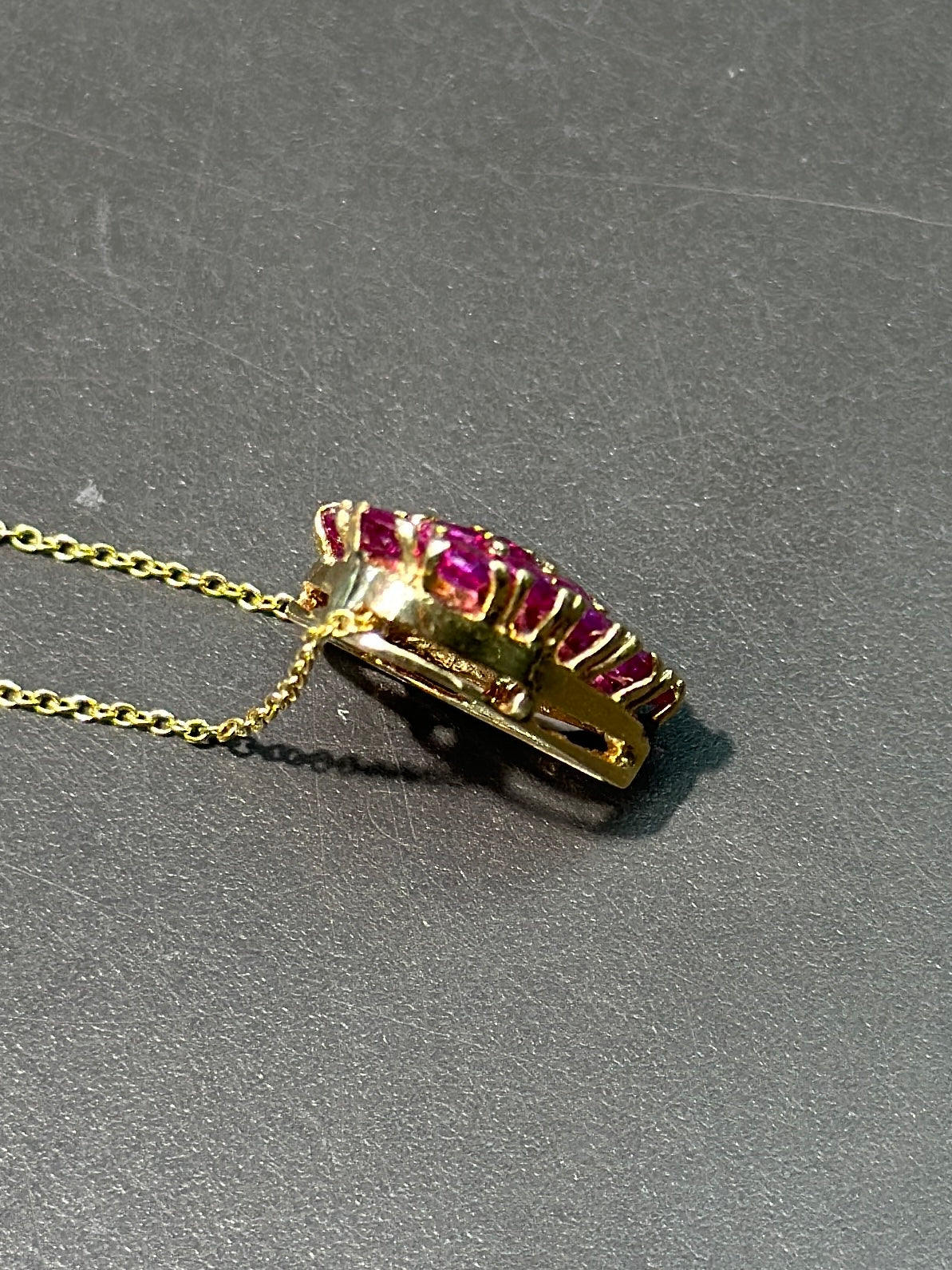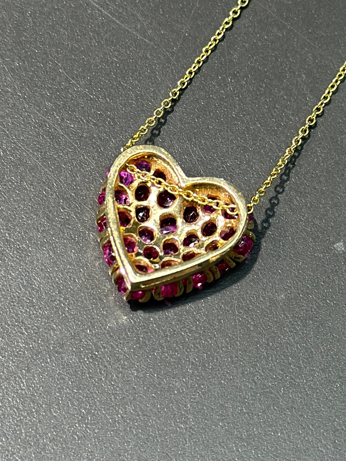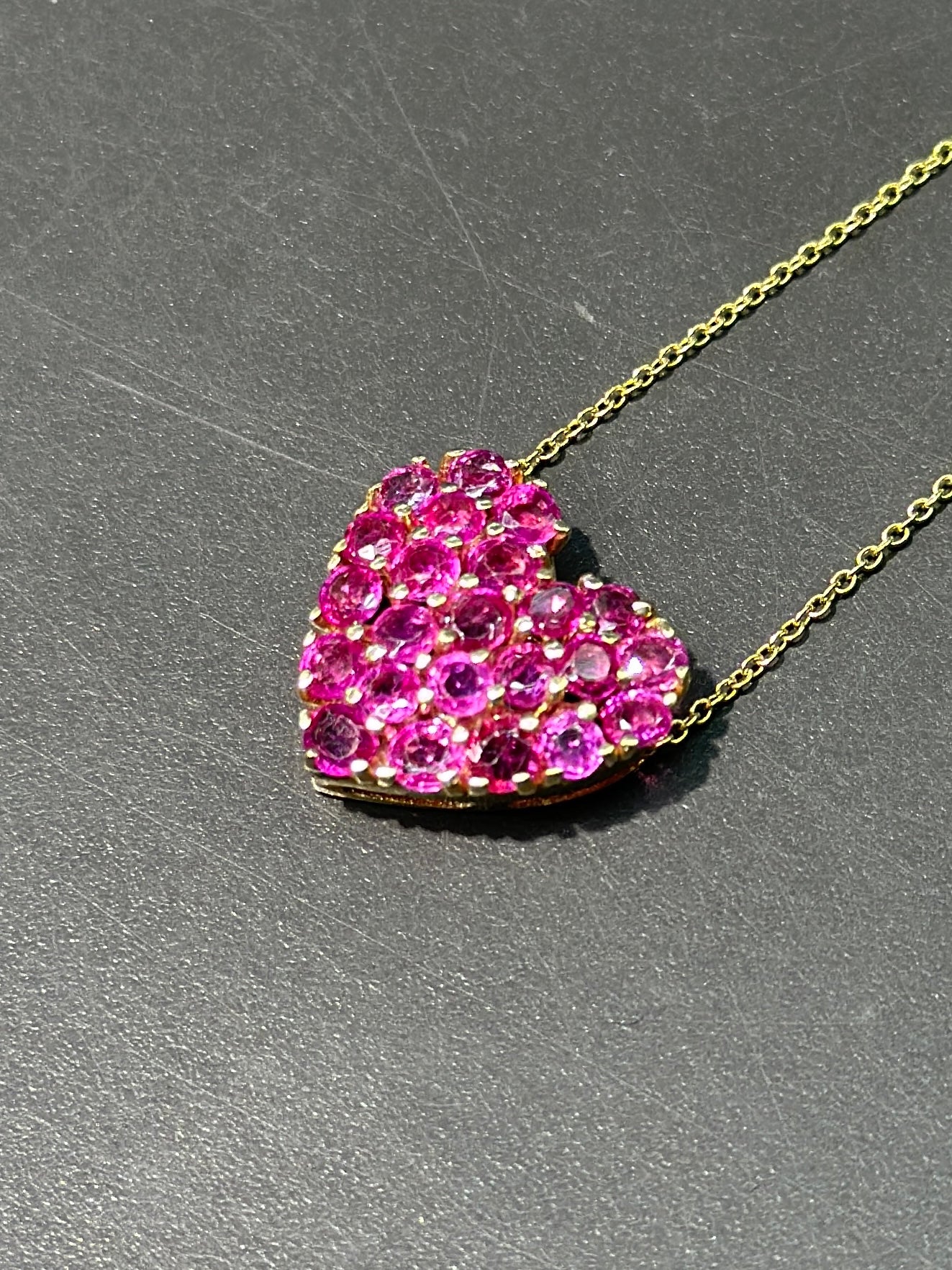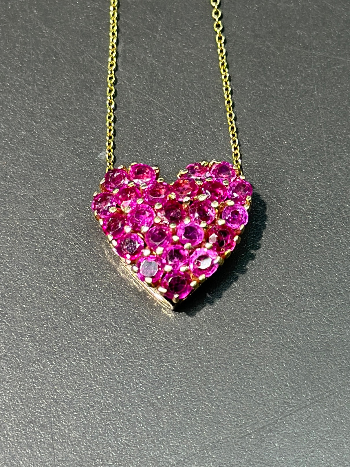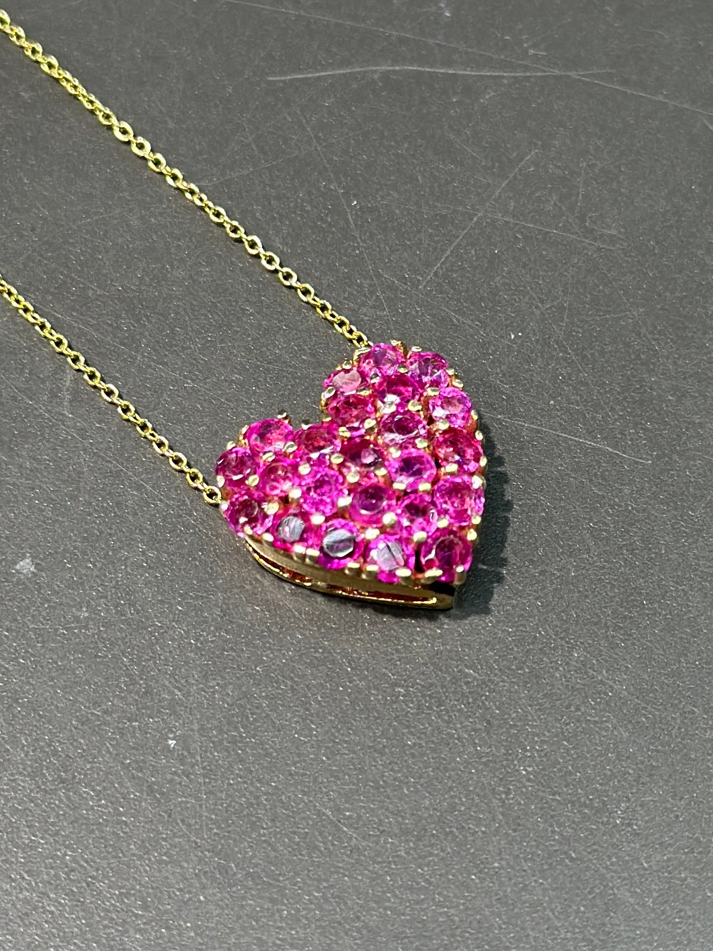Un pendentif spectaculaire en forme de cœur orné de 23 rubis roses étincelants qui scintillent et brillent ! Fabriqué en or 14 carats.