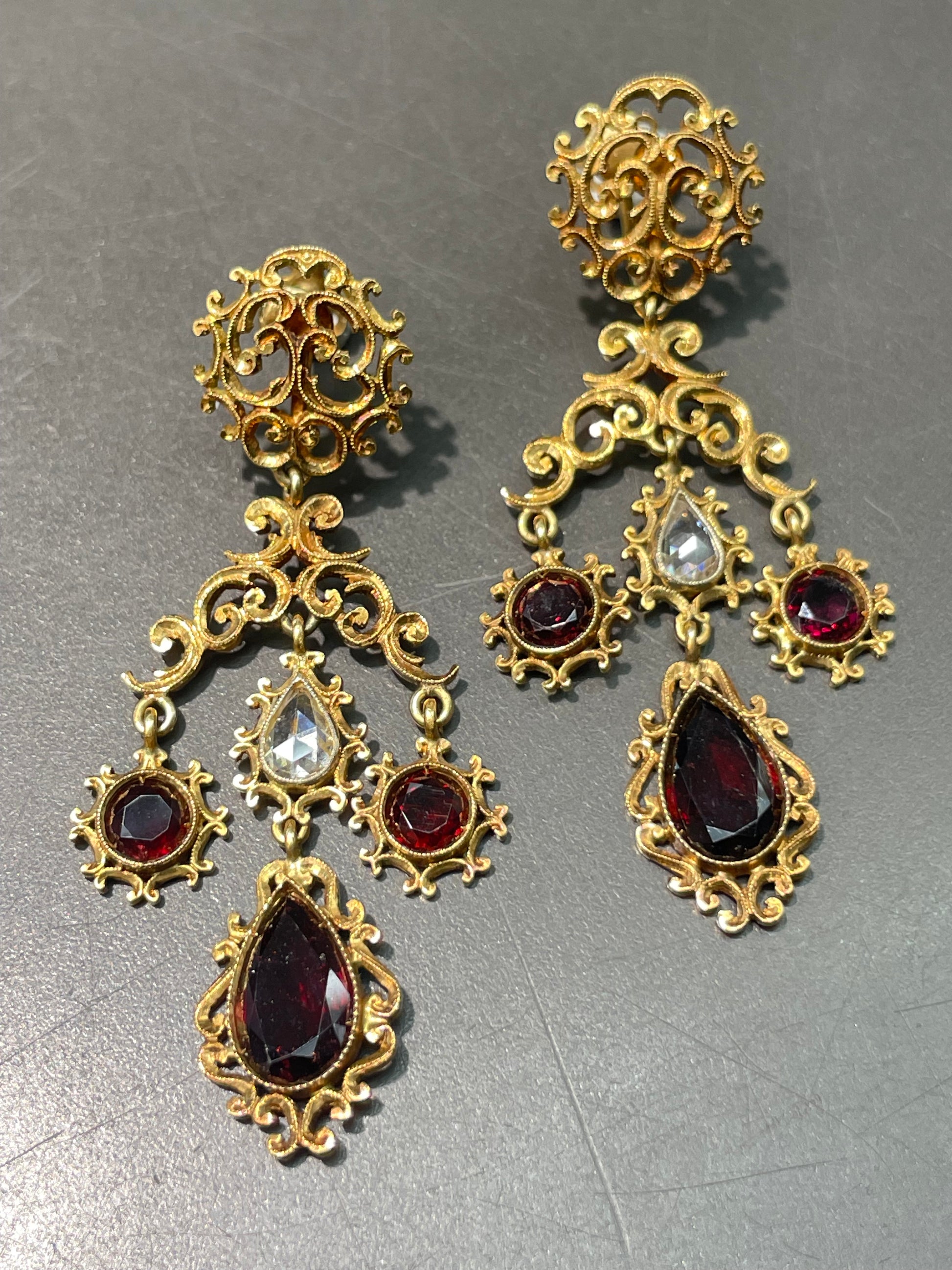 Skillfully handcrafted in warmly burnished 18K yellow gold, this exquisite pair of earring dates back to the Georgian era. It's ornated with curvaceous openwork detailing throughout and set with drops of scintillating drop shape rose cut diamonds totaling 1.3 carats along with glistening cabernet-red colored faceted garnets.