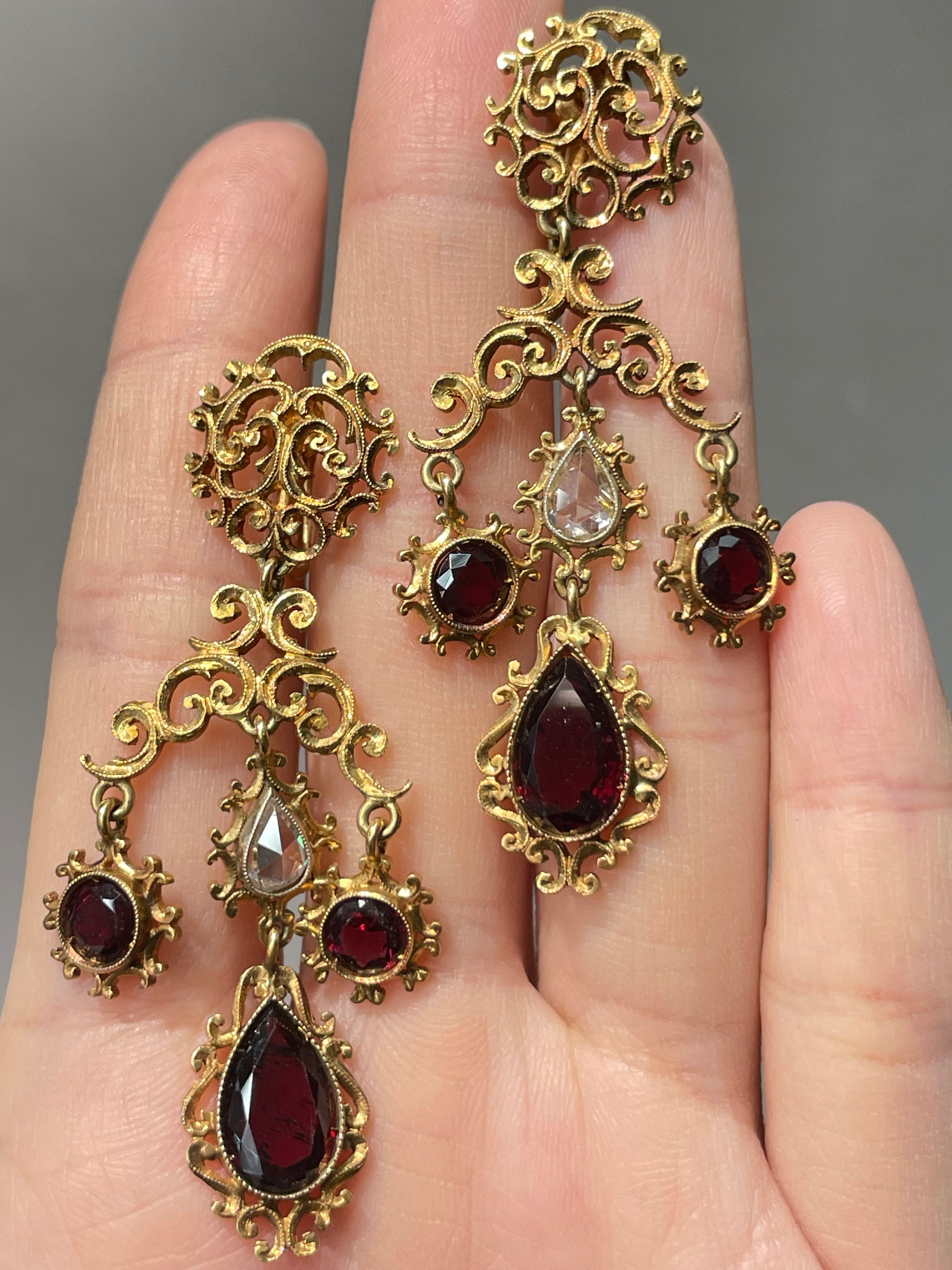 Georgian 18K Gold Rose Cut Diamond Garnet Drop Chandelier Earring