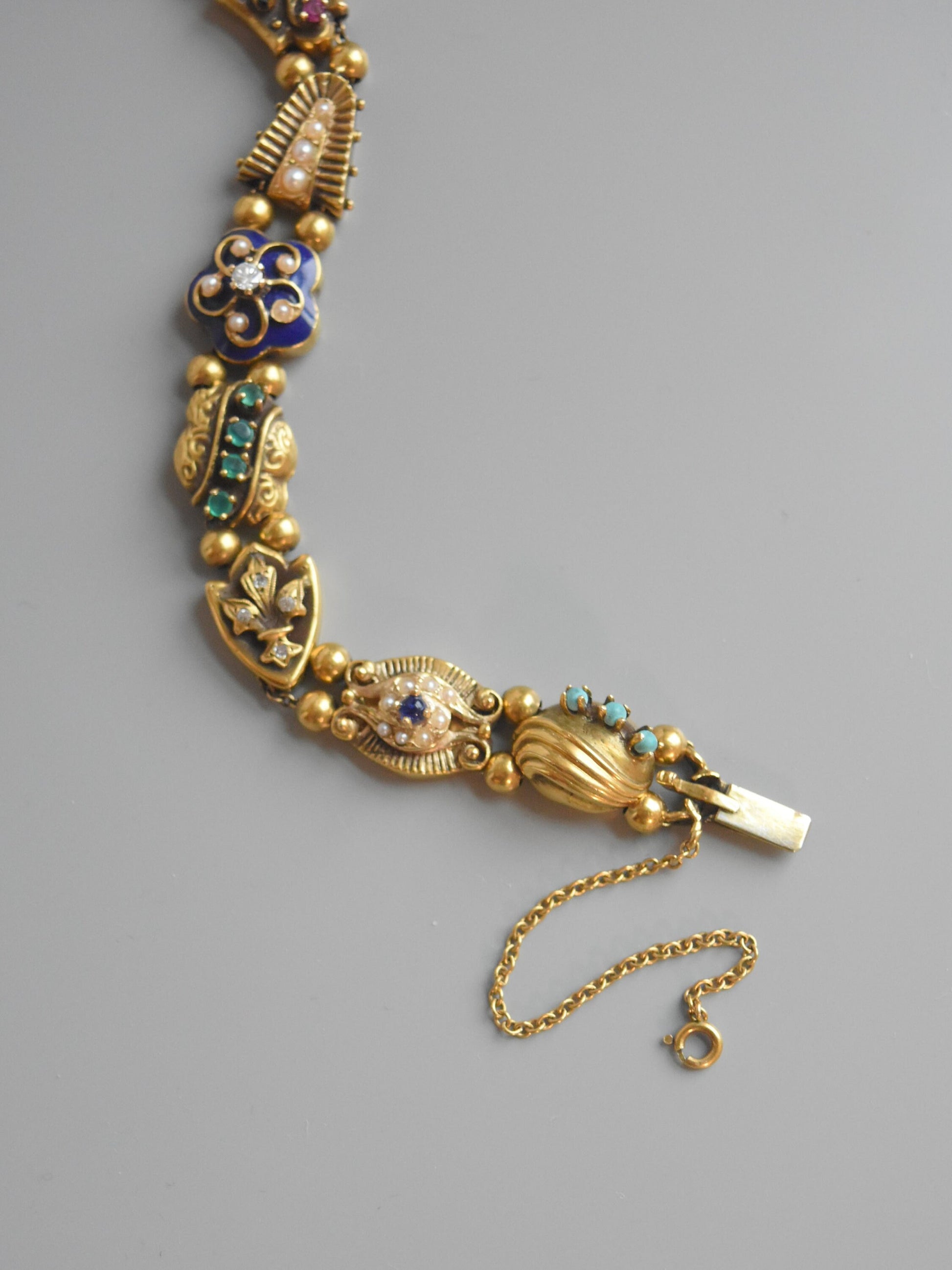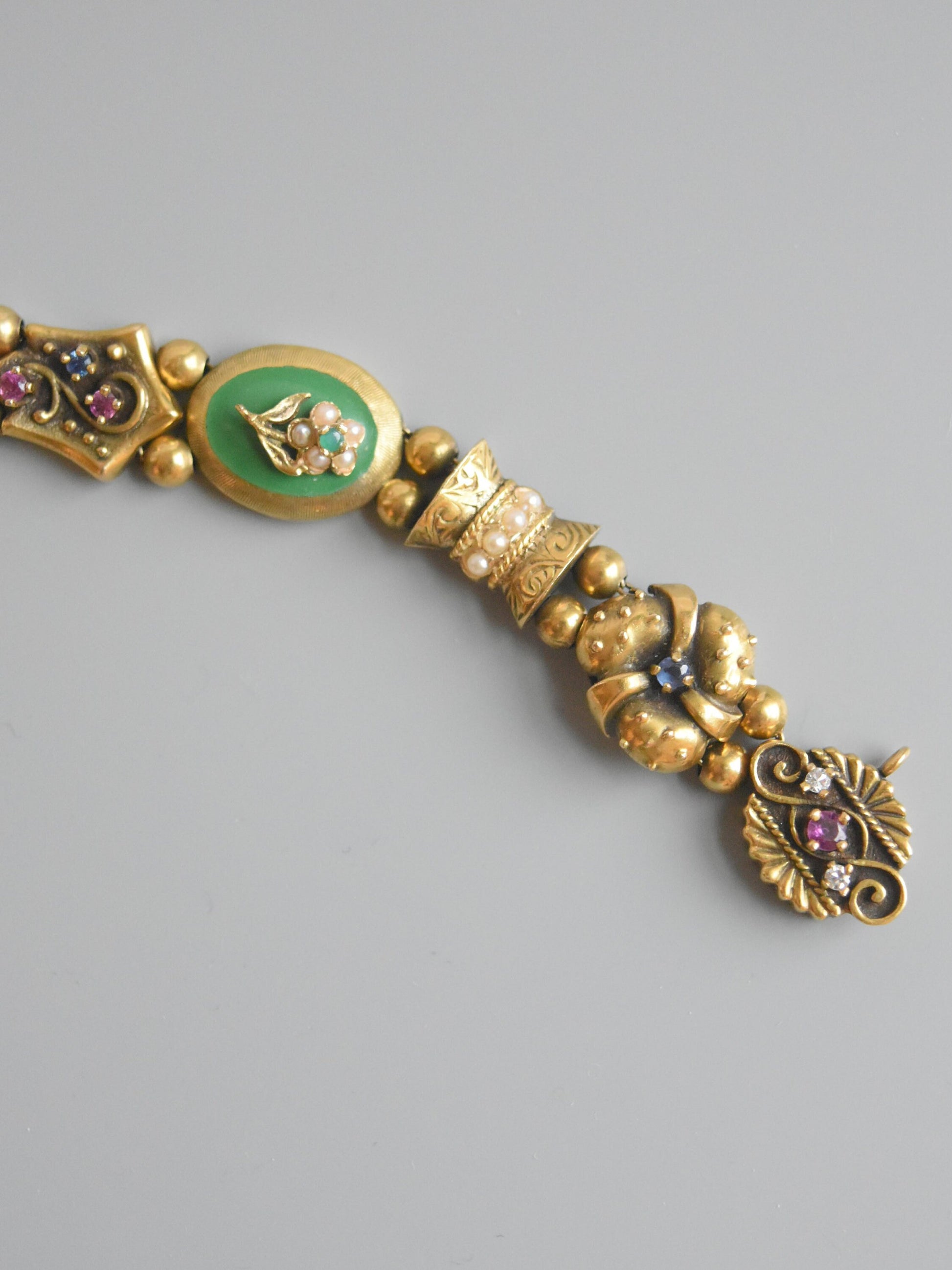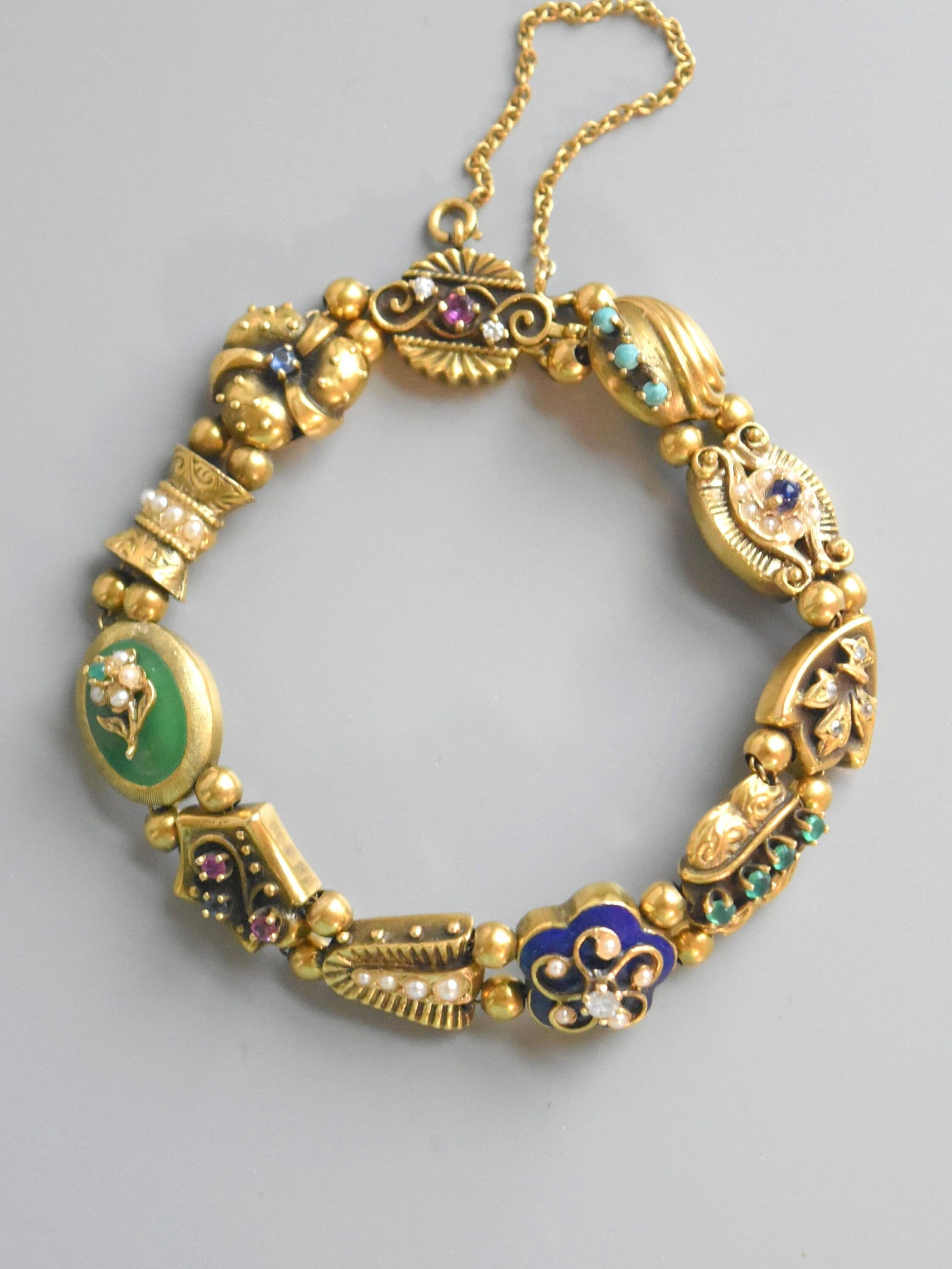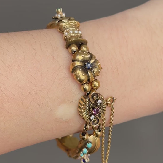 Datant des années 1930, un bracelet fantaisiste doté de breloques coulissantes uniques en leur genre. Chaque breloque est minutieusement conçue avec son propre design distinctif, des pierres précieuses à sa forme. Certains charms sont finis avec une touche d'émaillage et sertis de rubis, saphirs, émeraudes et diamants vibrants. Fabriqué avec art en or 14 carats, mesure 6,5 pouces, 33,6 grammes. Ce serait un bracelet amusant pour ajouter une touche de couleur à une pile de tous les jours !