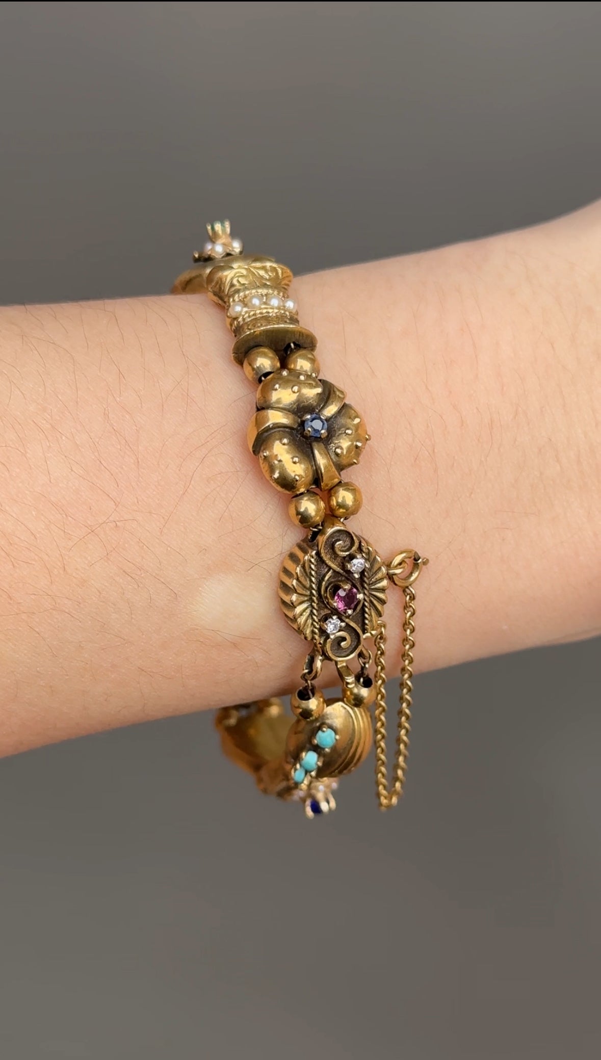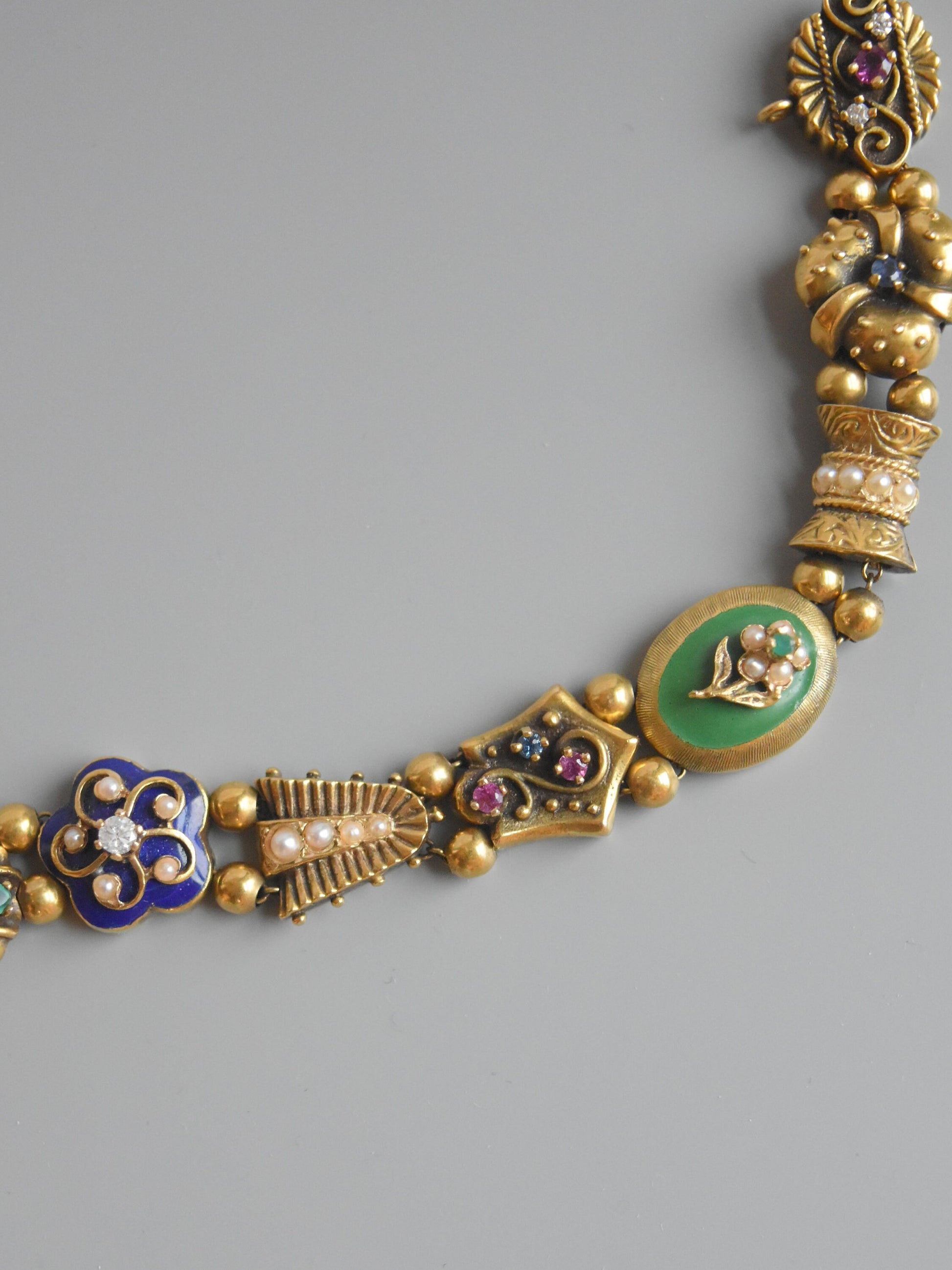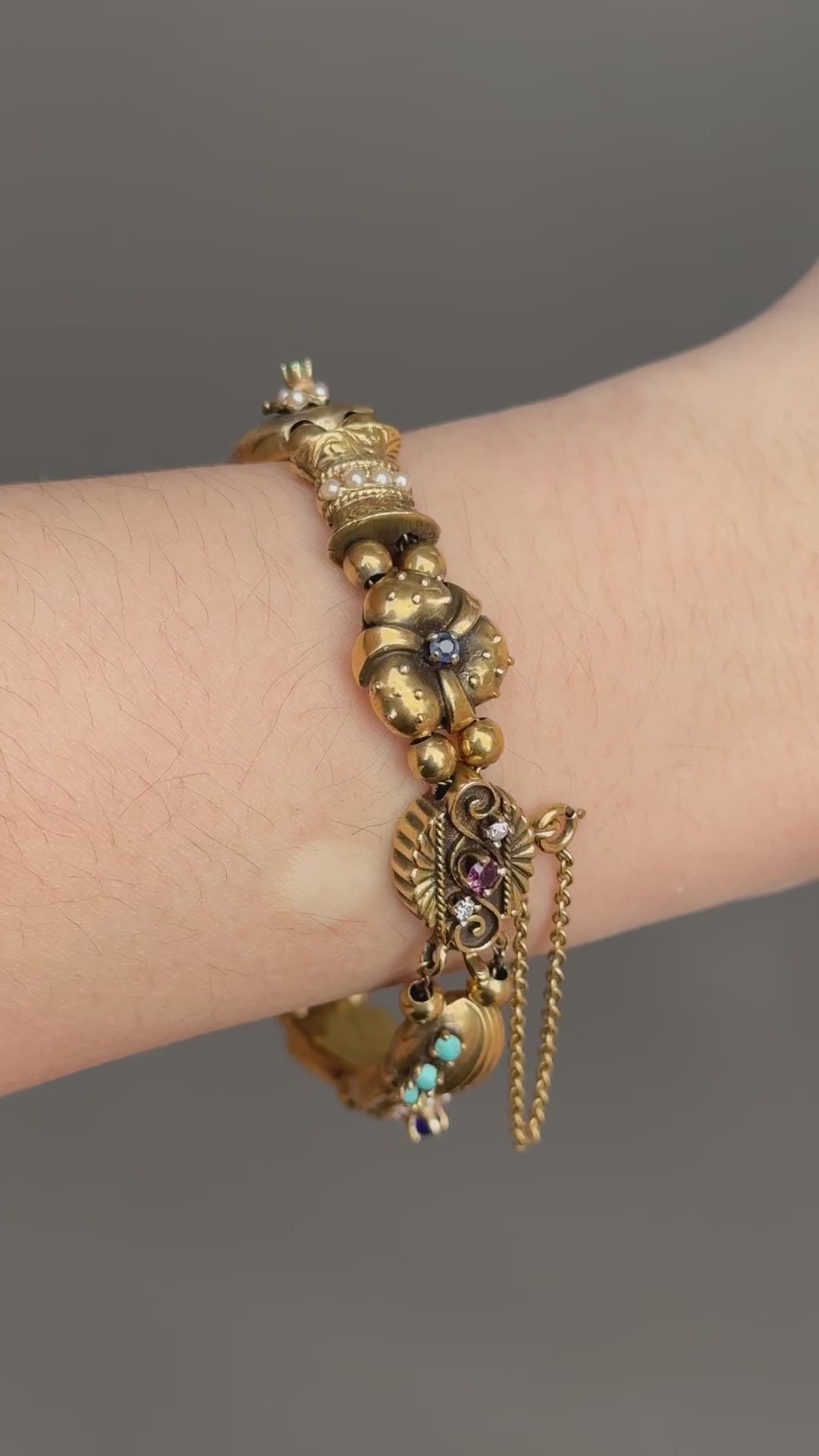 Datant des années 1930, un bracelet fantaisiste doté de breloques coulissantes uniques en leur genre. Chaque breloque est minutieusement conçue avec son propre design distinctif, des pierres précieuses à sa forme. Certains charms sont finis avec une touche d'émaillage et sertis de rubis, saphirs, émeraudes et diamants vibrants. Fabriqué avec art en or 14 carats, mesure 6,5 pouces, 33,6 grammes. Ce serait un bracelet amusant pour ajouter une touche de couleur à une pile de tous les jours !