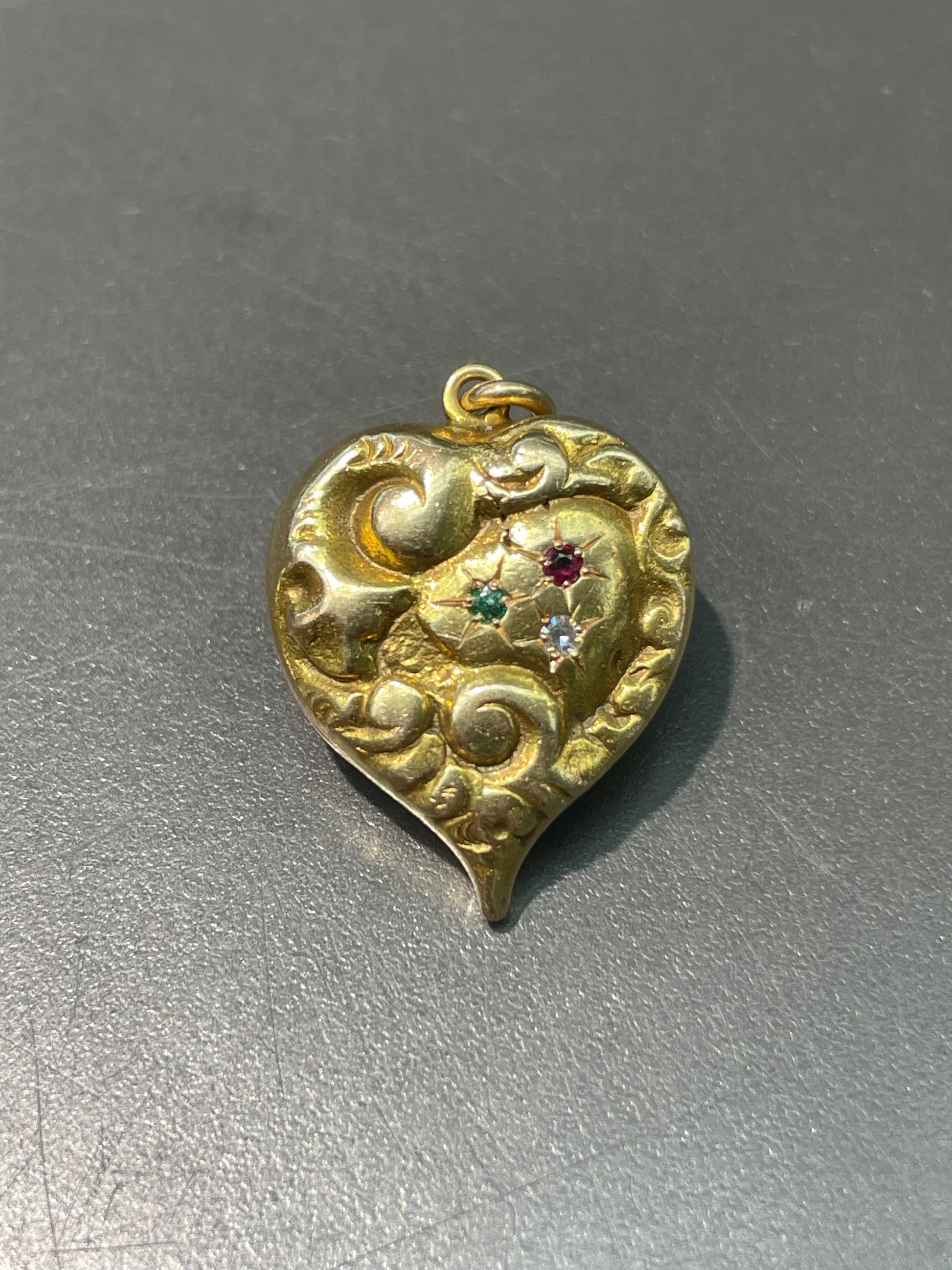 A lovely Victorian 14K gold heart pendant adorned with intricate repoussé scrollwork on both sides along with a starburst motif set with diamonds, rubies, and emeralds.