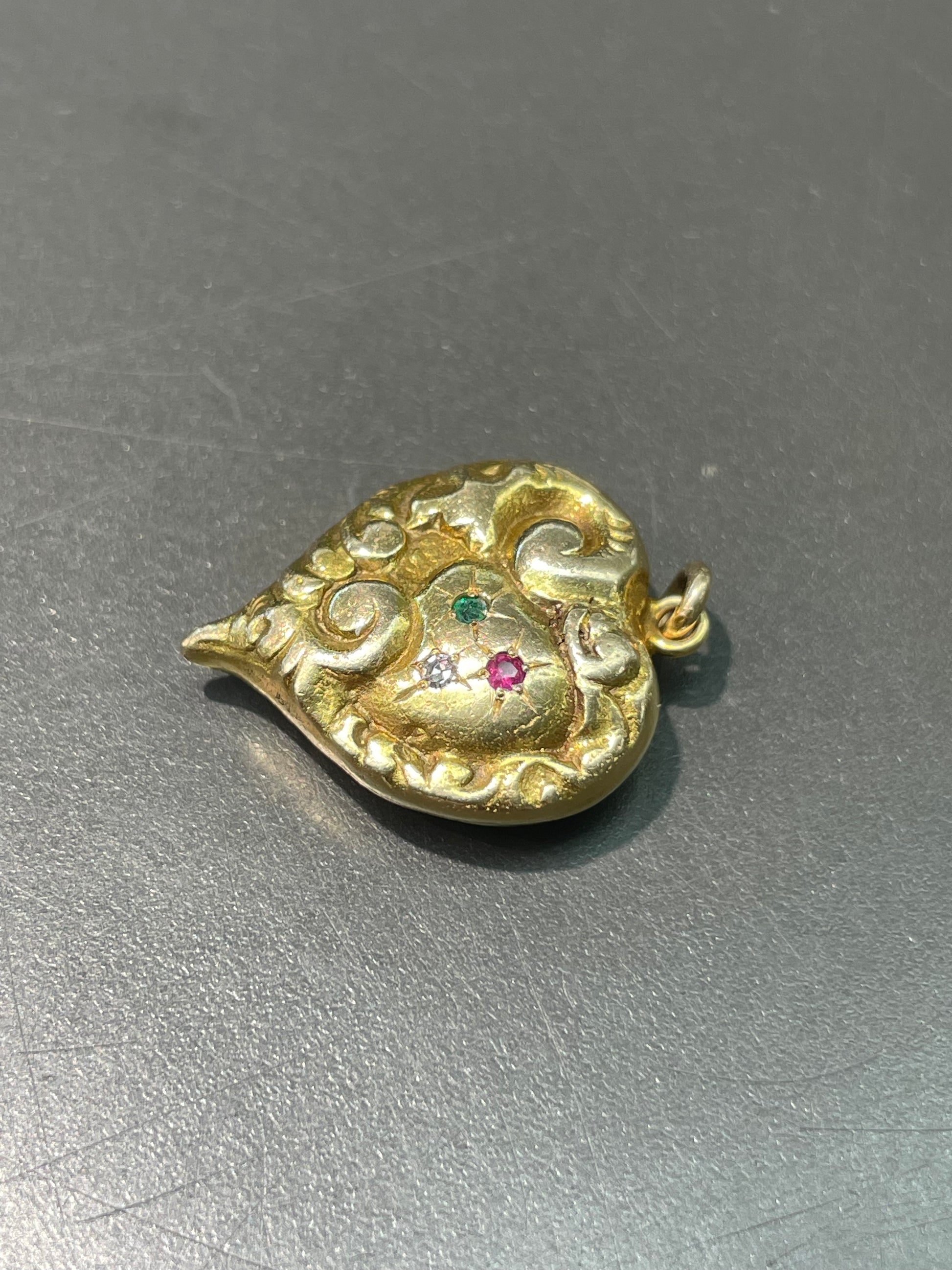 Victorian 14K Yellow Gold Ruby Emerald Diamond Repousse Scrolling Heart Pendant