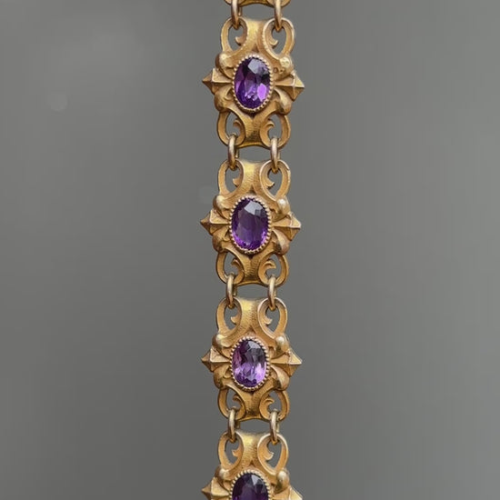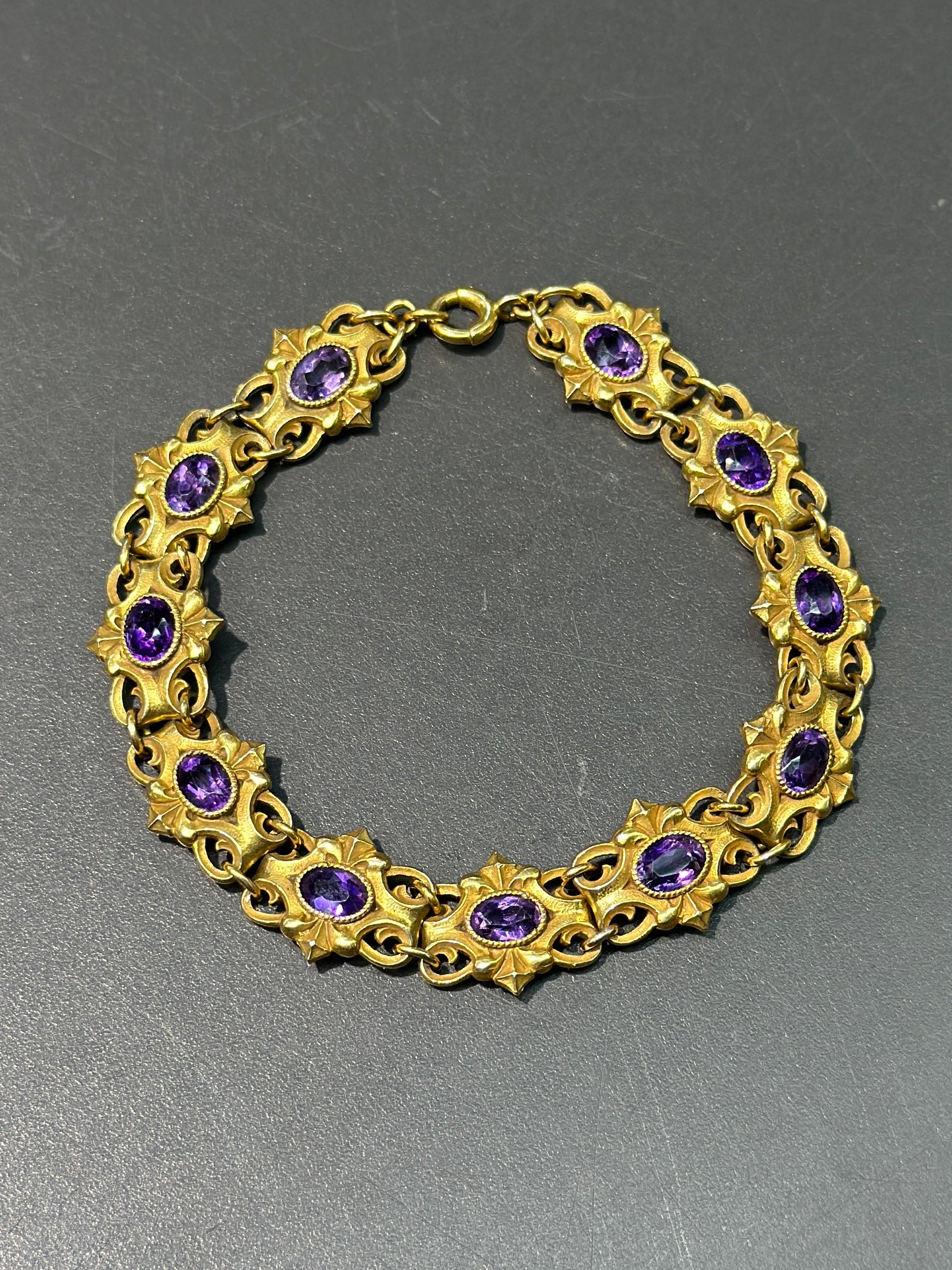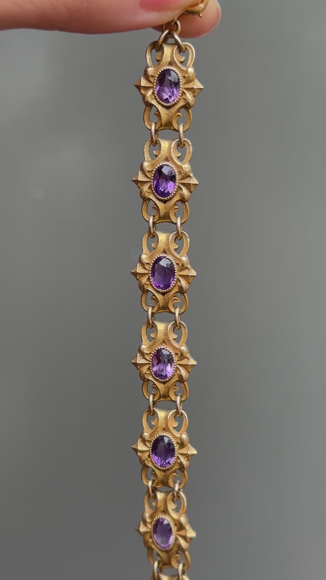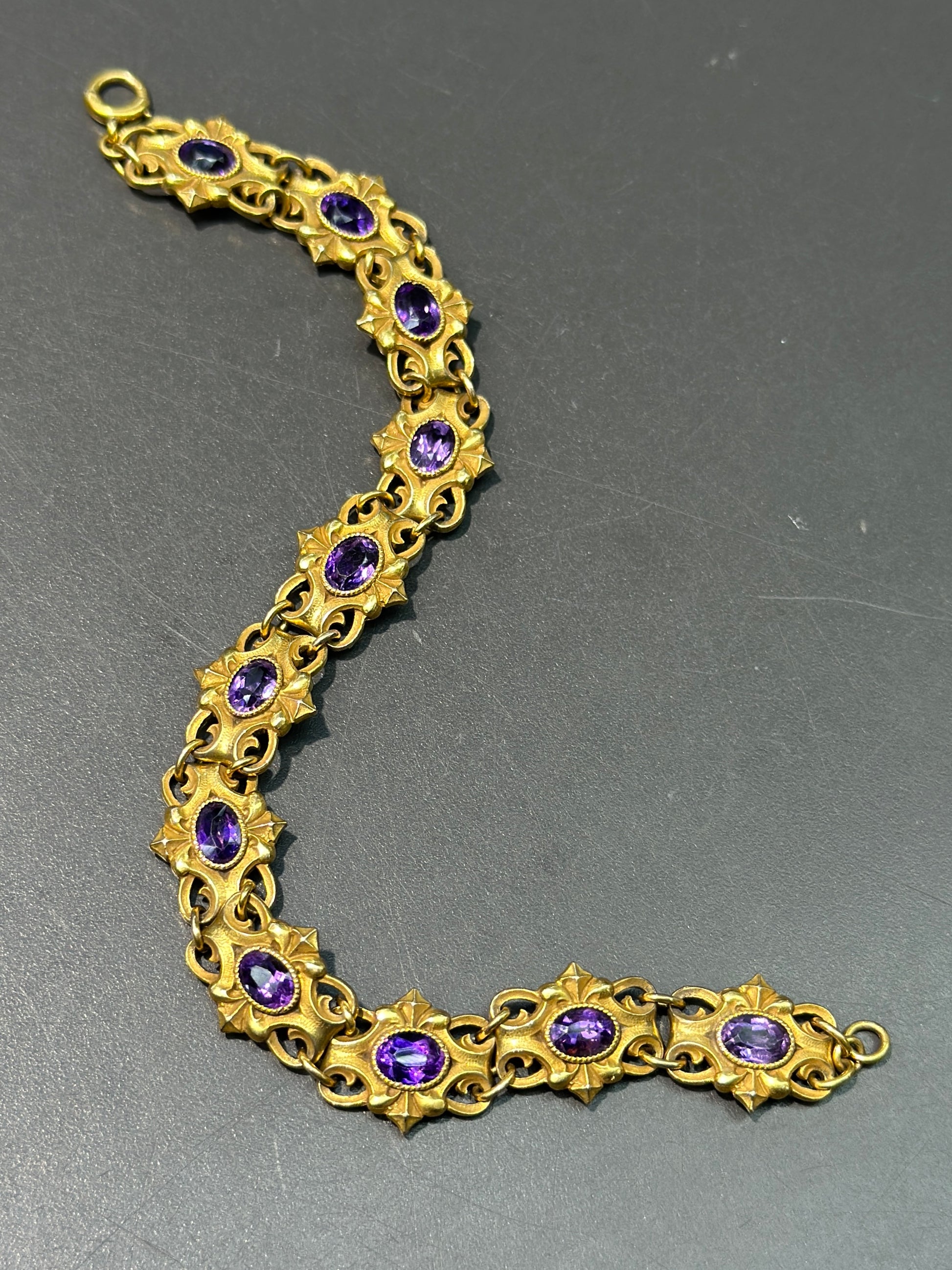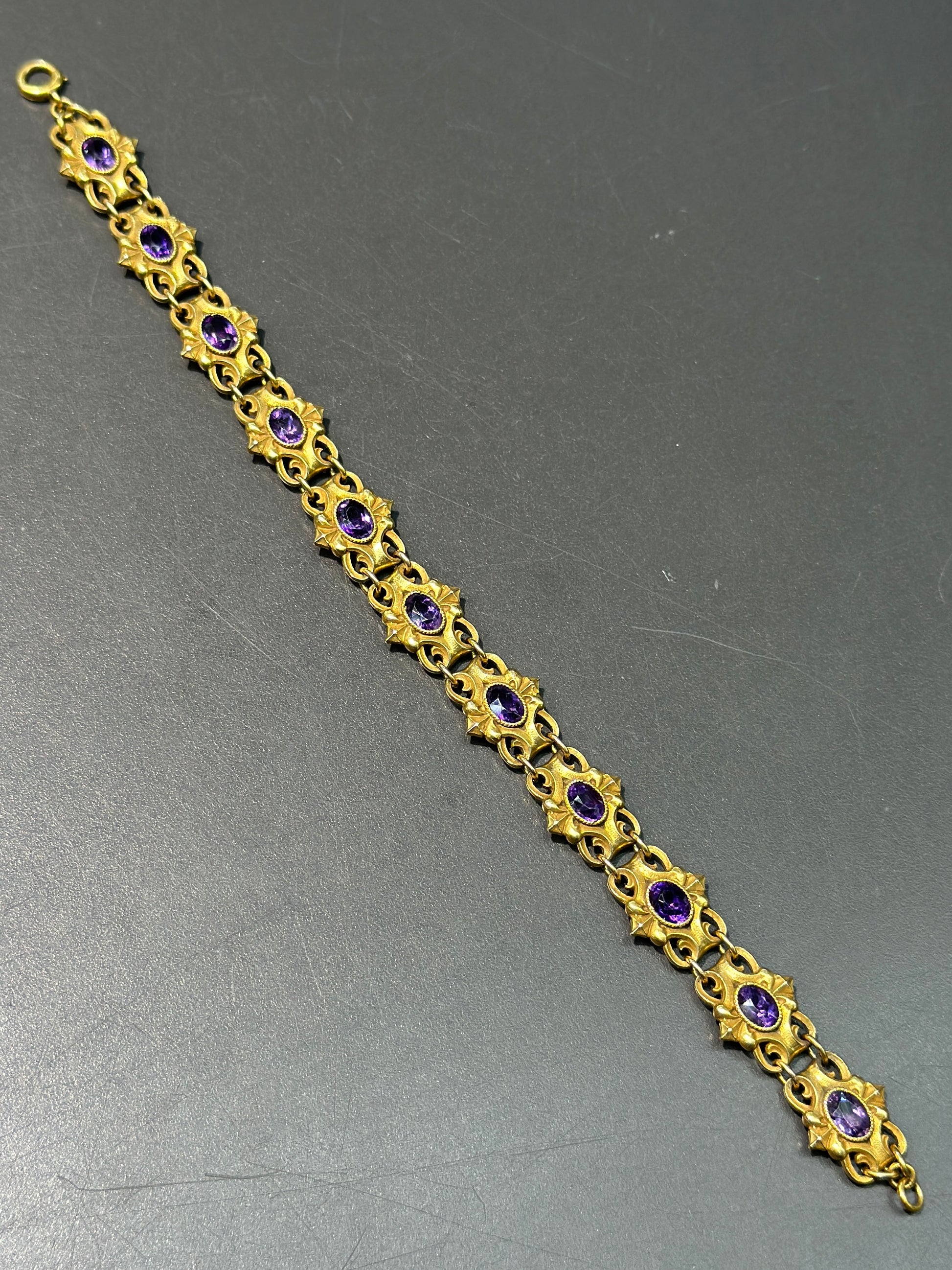 Datant de l'époque Art Nouveau, un bracelet saisissant magnifiquement fabriqué en or satiné 14 carats avec des détails méticuleux sur chaque maillon. Orné de 11 améthystes violet foncé vibrantes.
