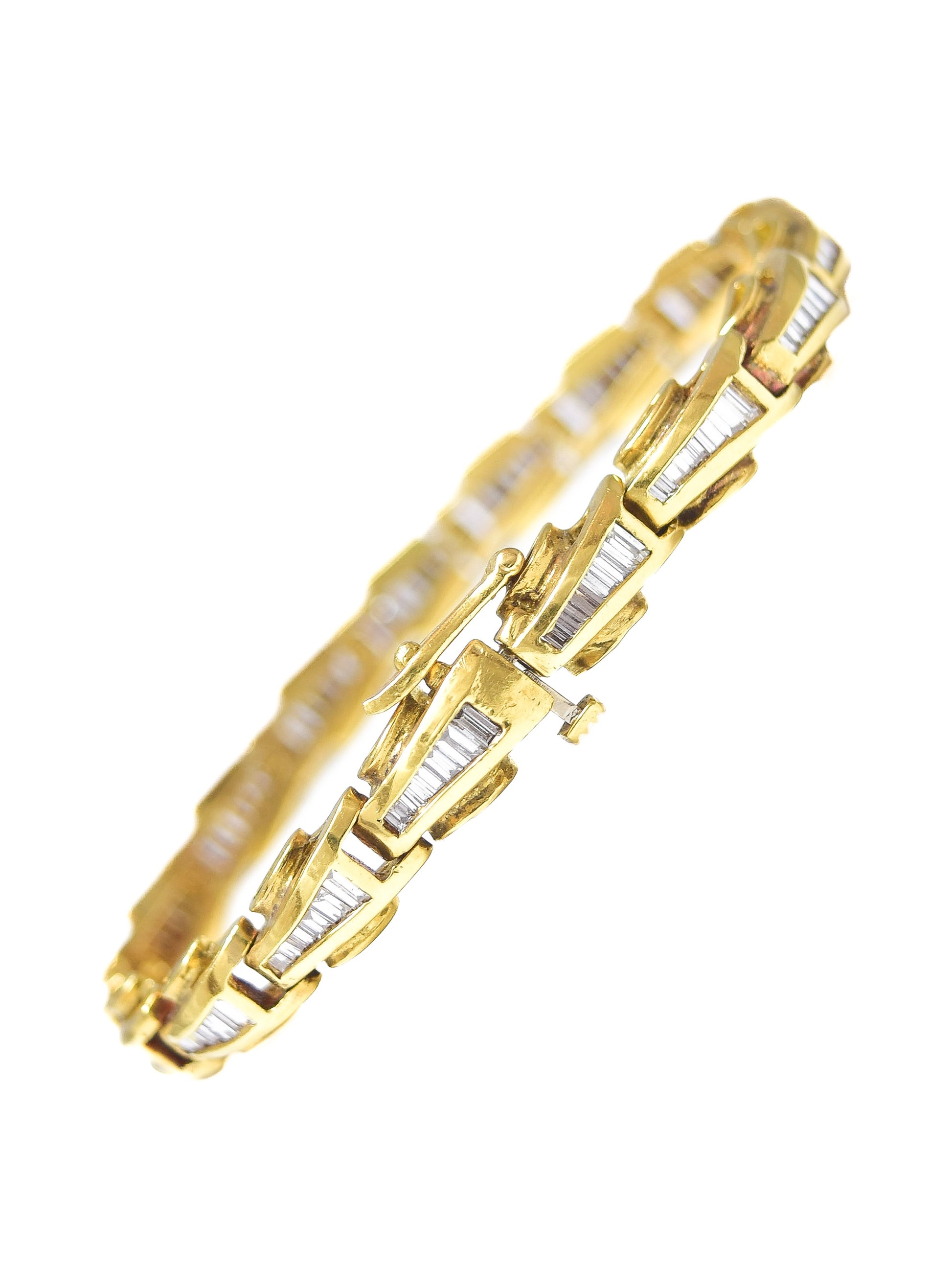 A vintage 18K gold tennis bracelet lined with graduated baguette cut diamonds.