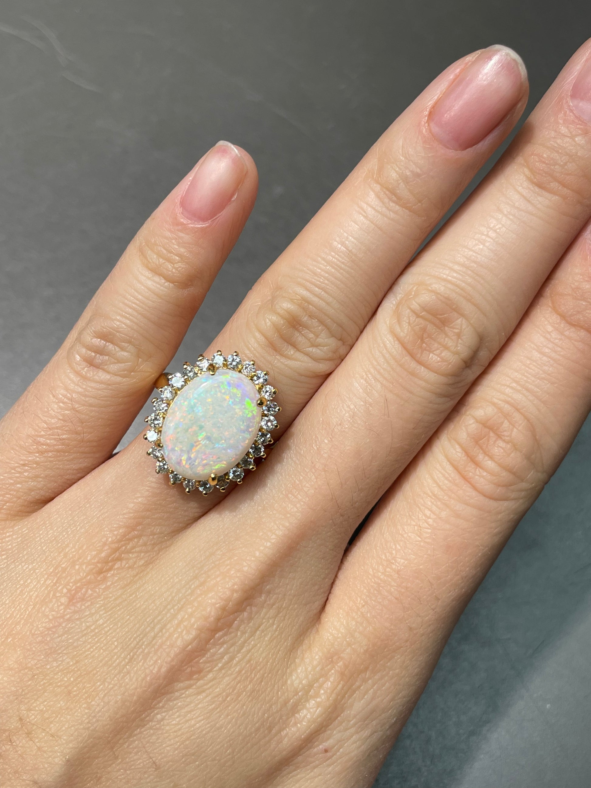 A vintage 14K gold opal and diamond halo ring centered with a luminous cabochon cut opal with a stunning color of play. Surrounded by 24 round brilliant cut diamonds totaling approximately 0.45 carats, graded H-I color and VS-SI clarity.