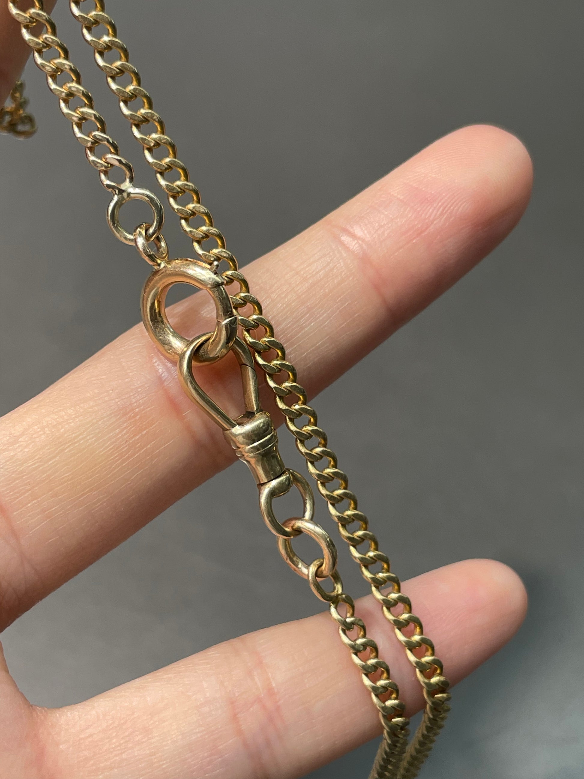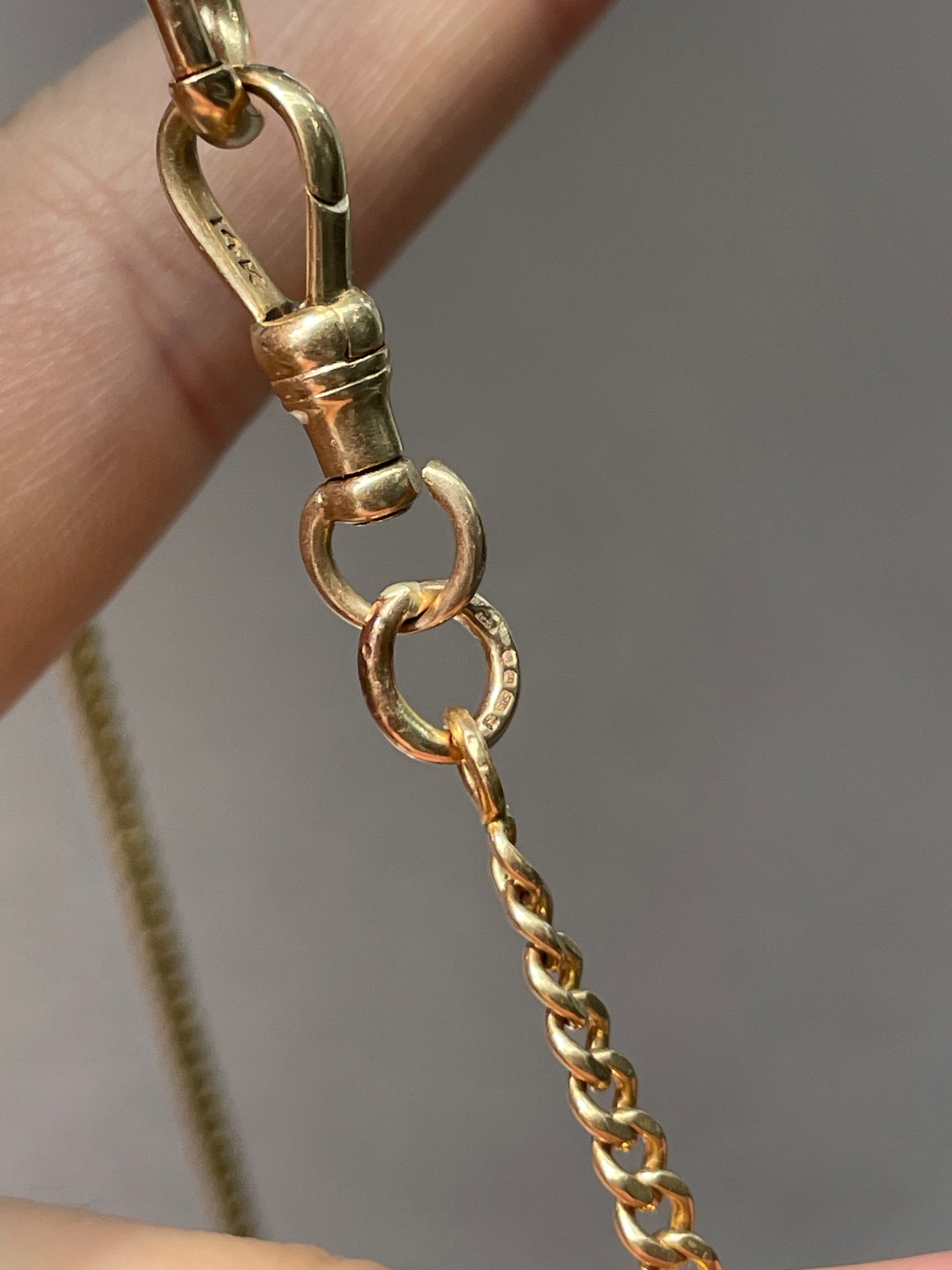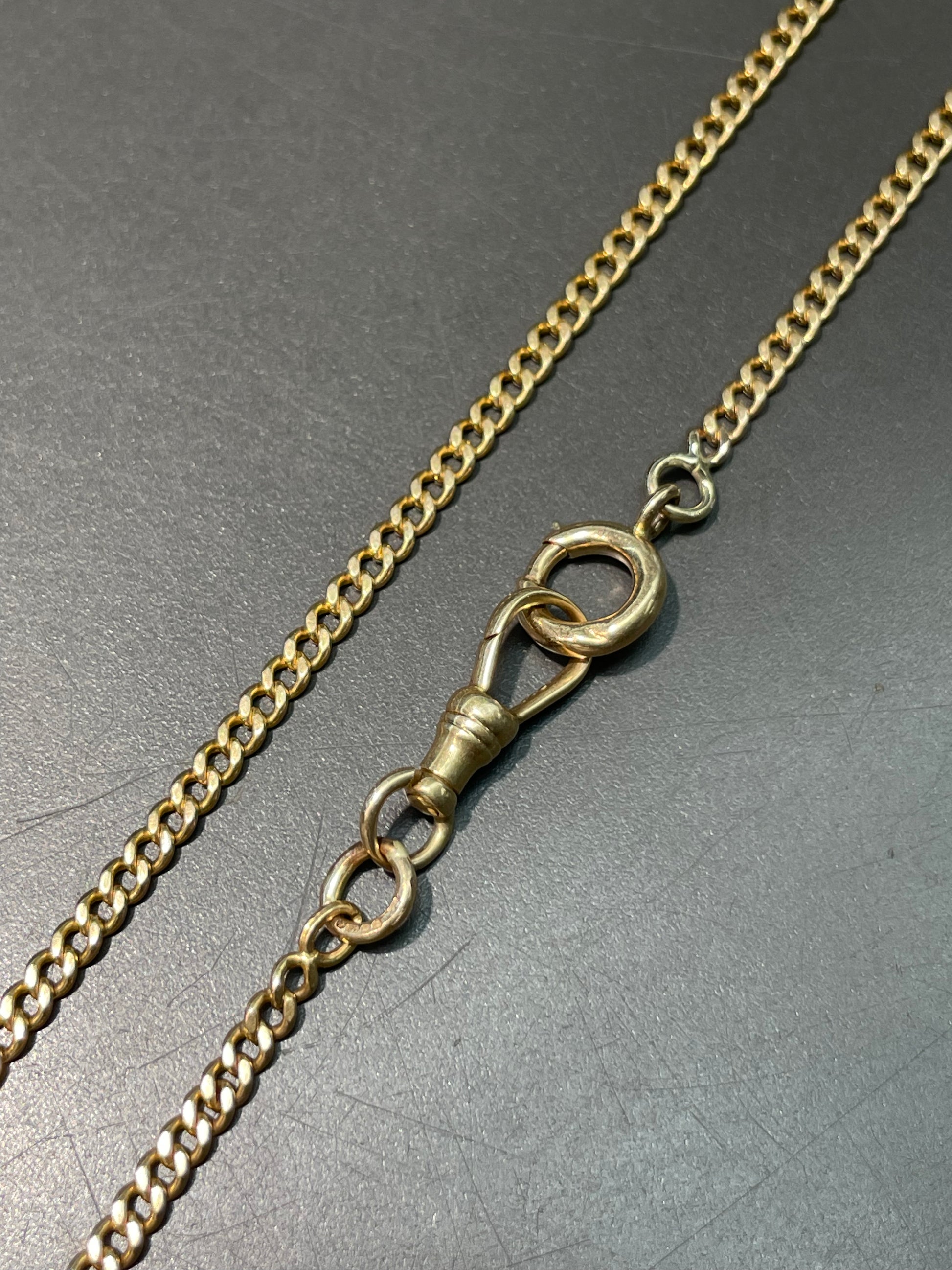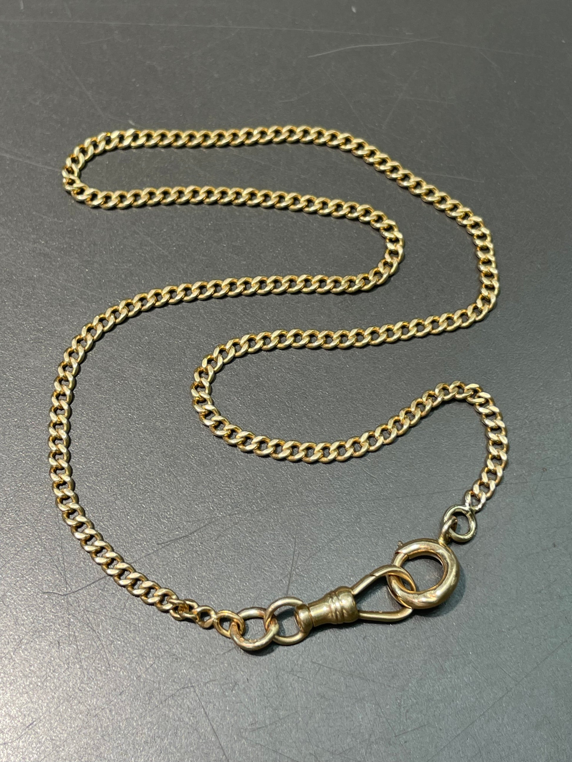A vintage 14K yellow gold curb link watch chain secured with a dog clip and bolt. UK office assay marks on hoop.