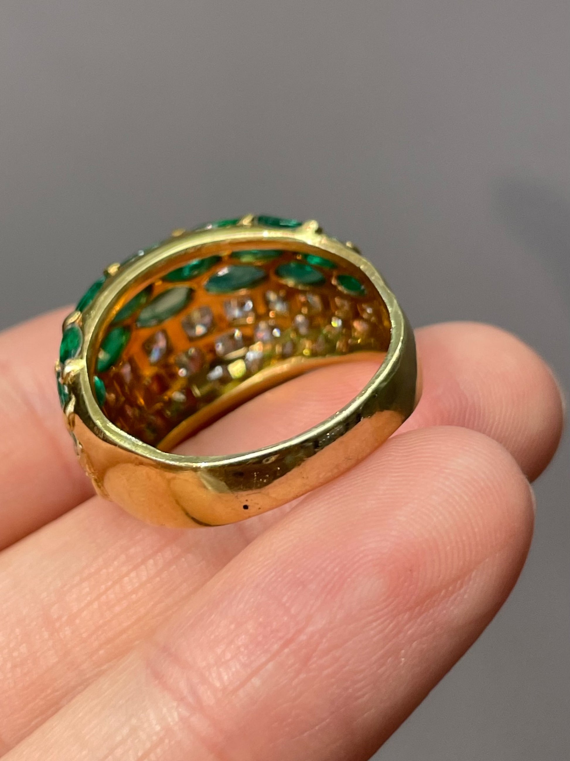A fabulous vintage 18K yellow gold bombe ring pave set with sparkling white brilliant cut diamonds totaling 1.57 carats (VS clarity, G-H color) on one side and luscious vibrant green marquise emeralds on the other, creating a captivating play of sparkle and color.