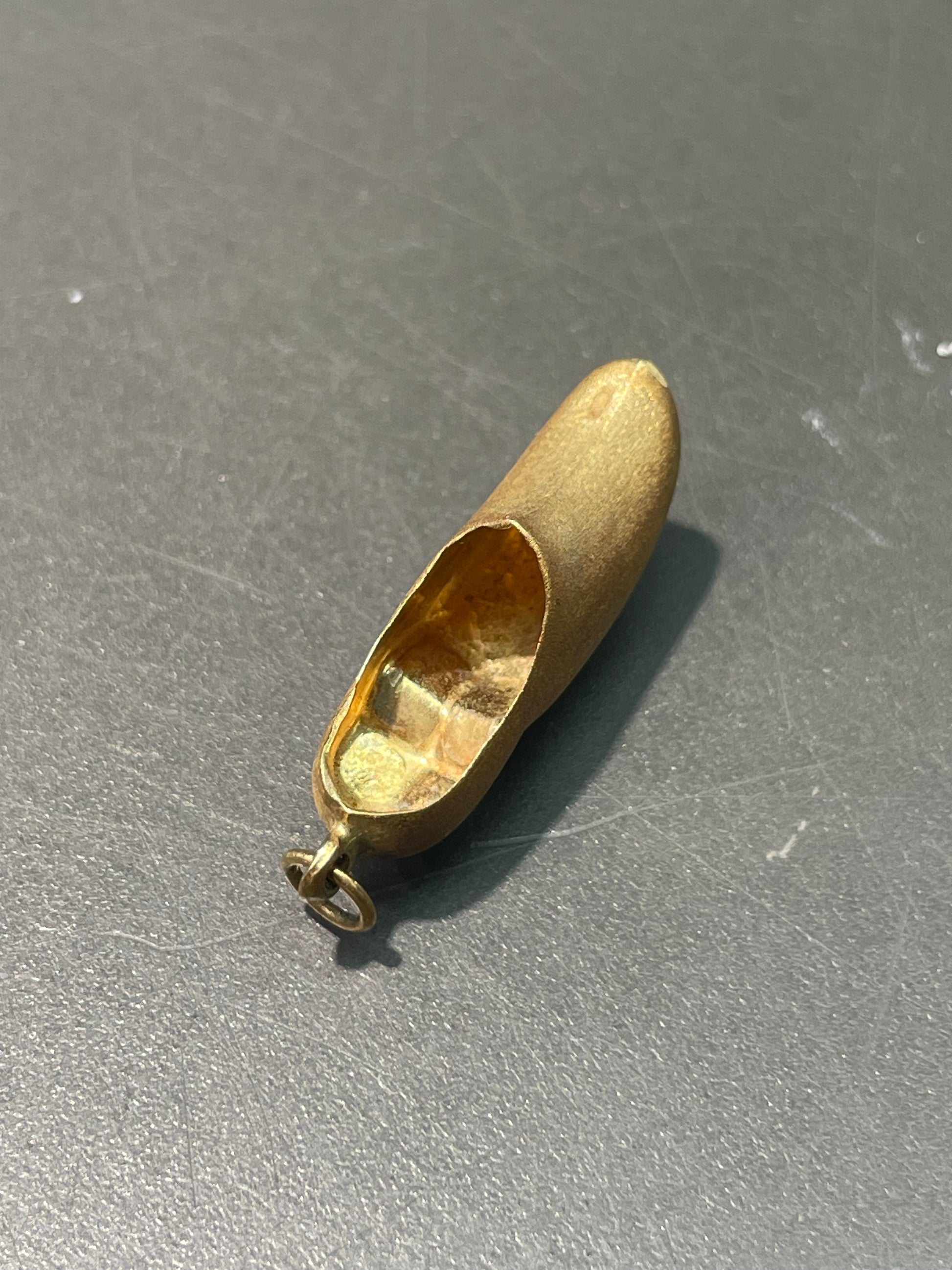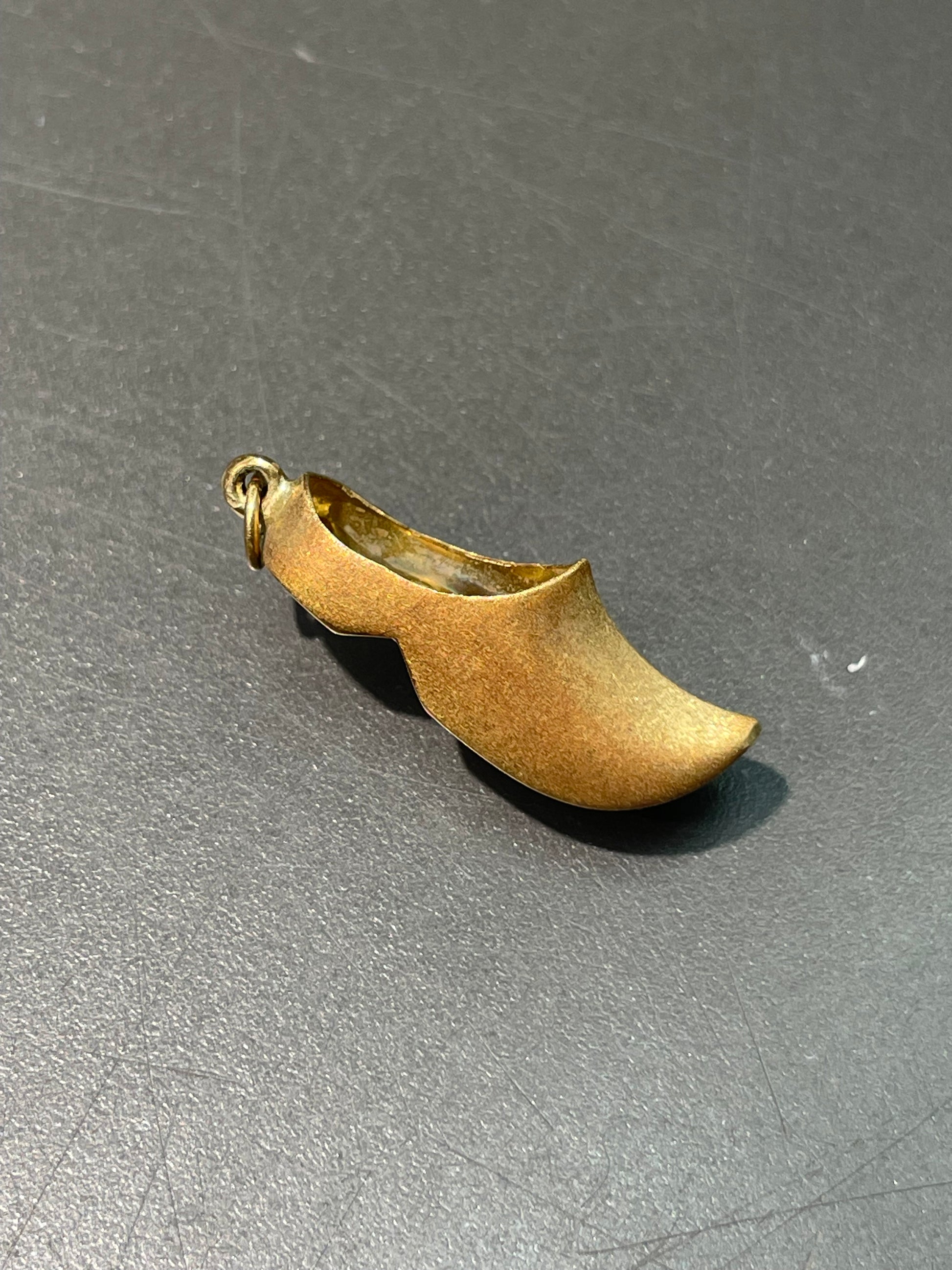 A charming vintage 14K yellow gold Dutch clog pendant, crafted with brushed gold detailing and perfect for adding a playful, travel-inspired touch to any chain or charm bracelet.
