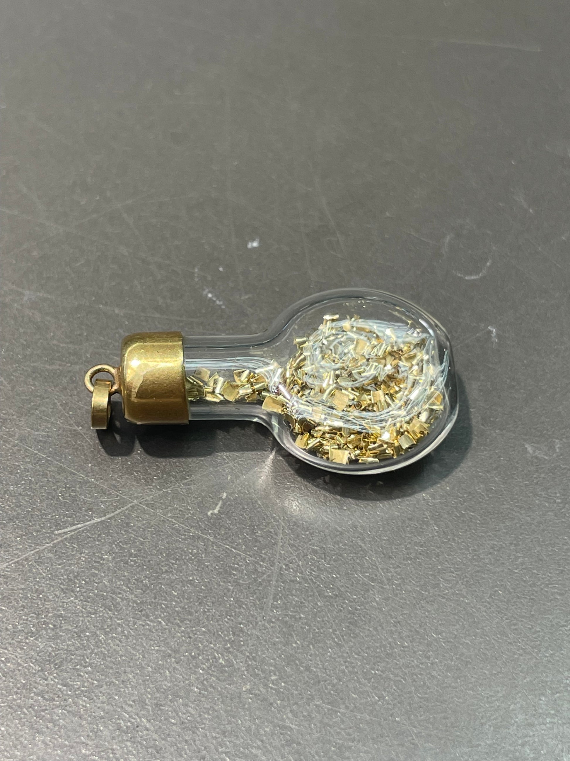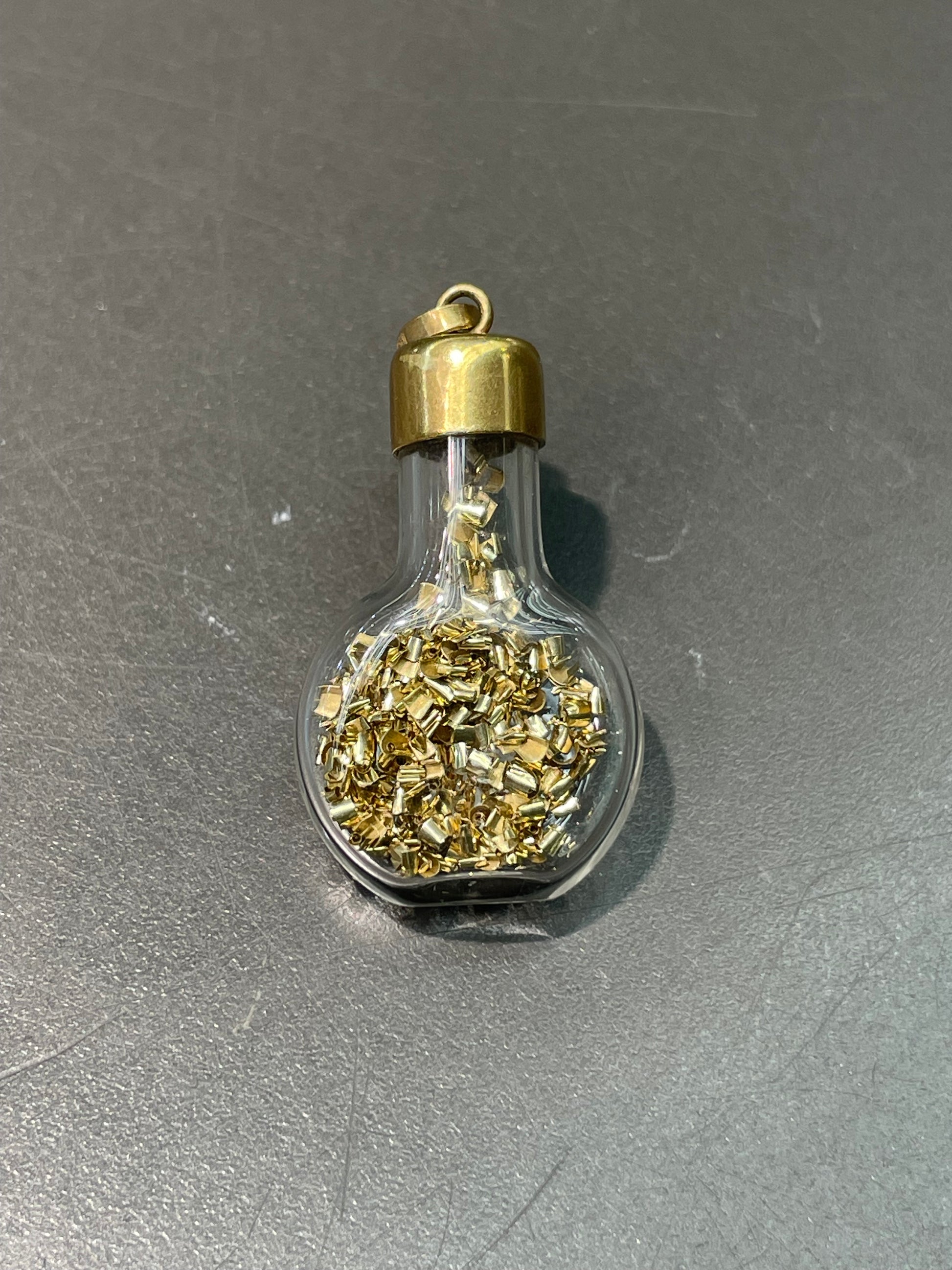 A utterly cool bottle charm filled with 14K yellow gold shavings inside.