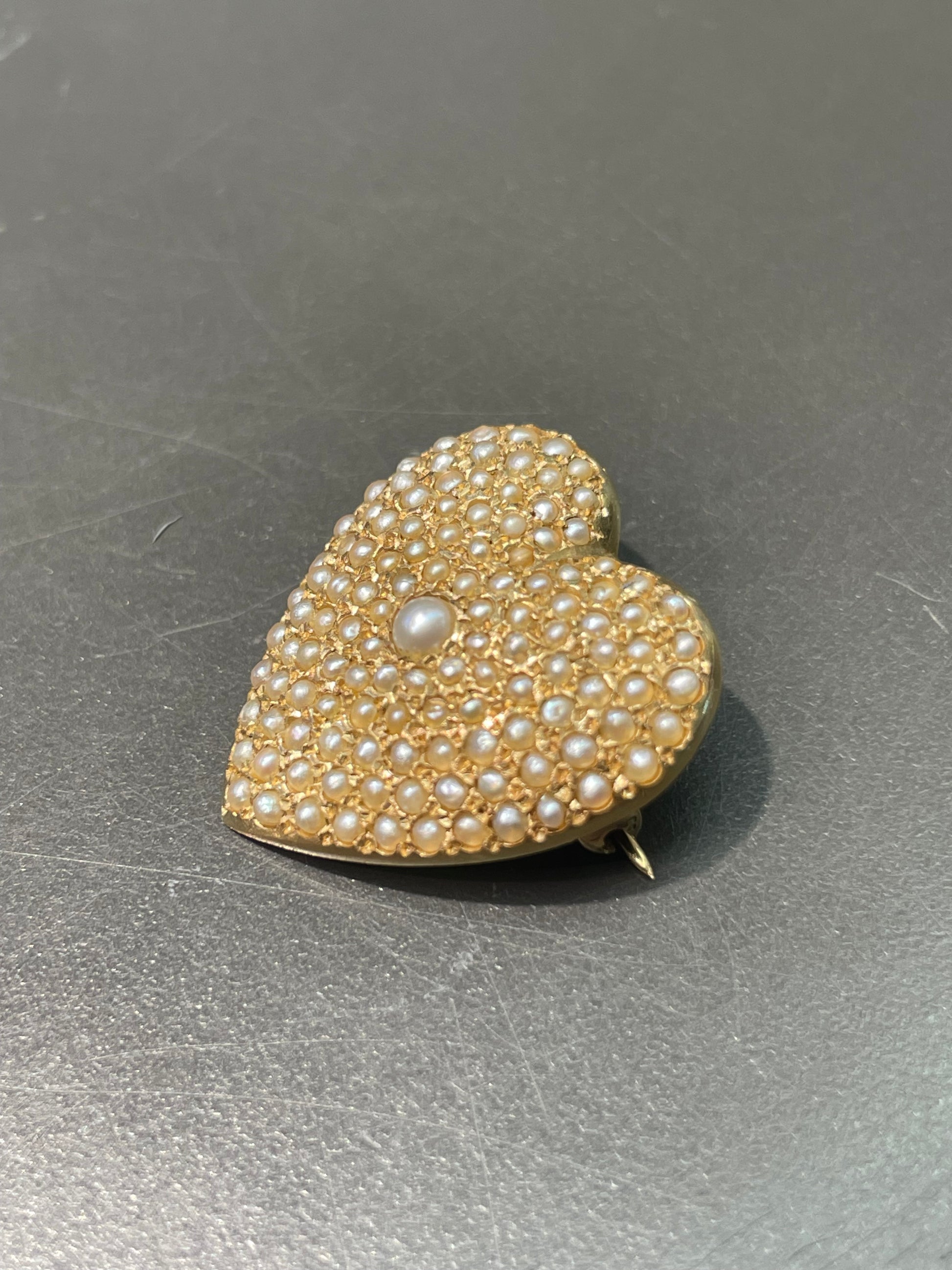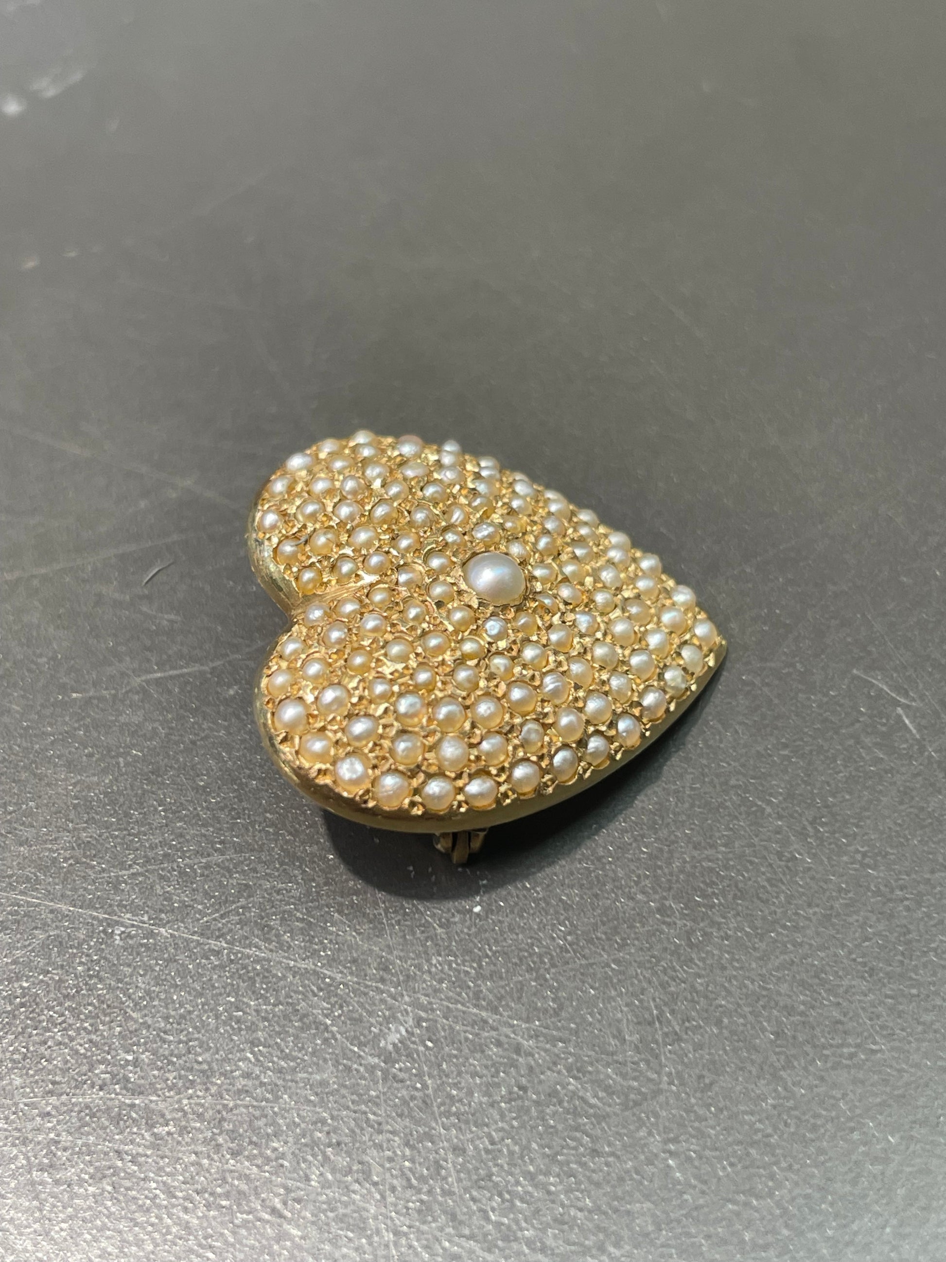 A charming vintage 14K gold puffed heart brooch pavé set with tiny seed pearls.