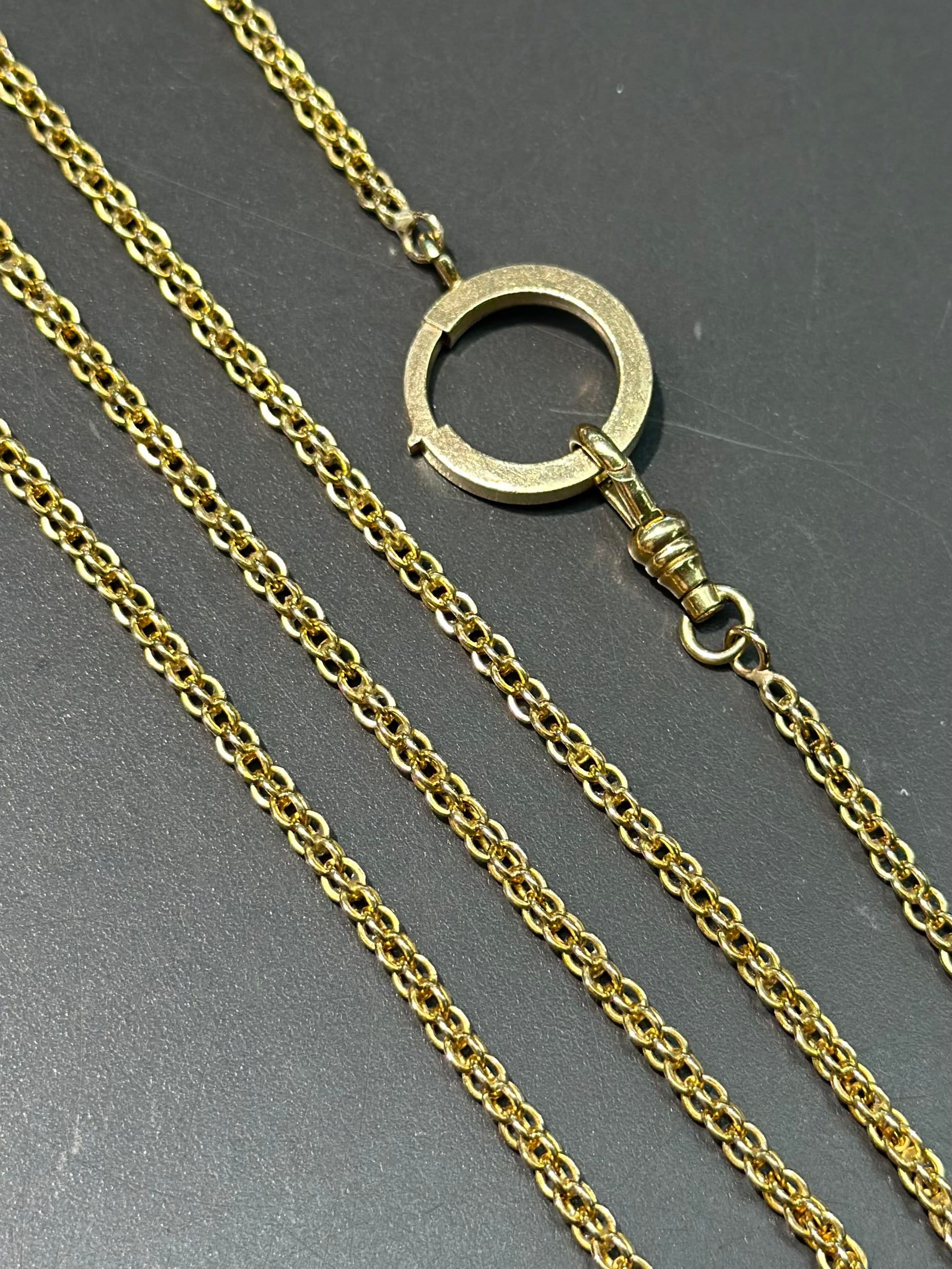 A fabulous watch chain crafted in a gleaming 15K gold, finished off with a 14K gold large spring clasp measuring 17.0 mm and a 14K gold dog clip.
