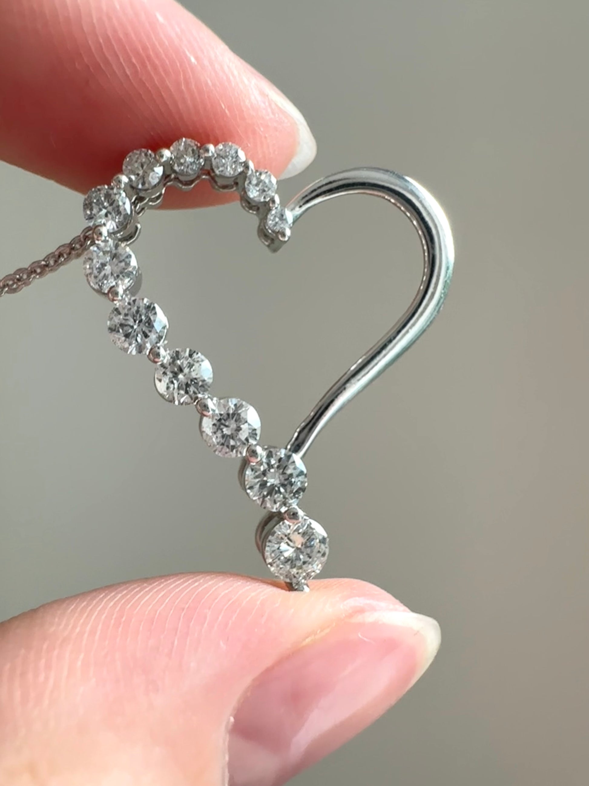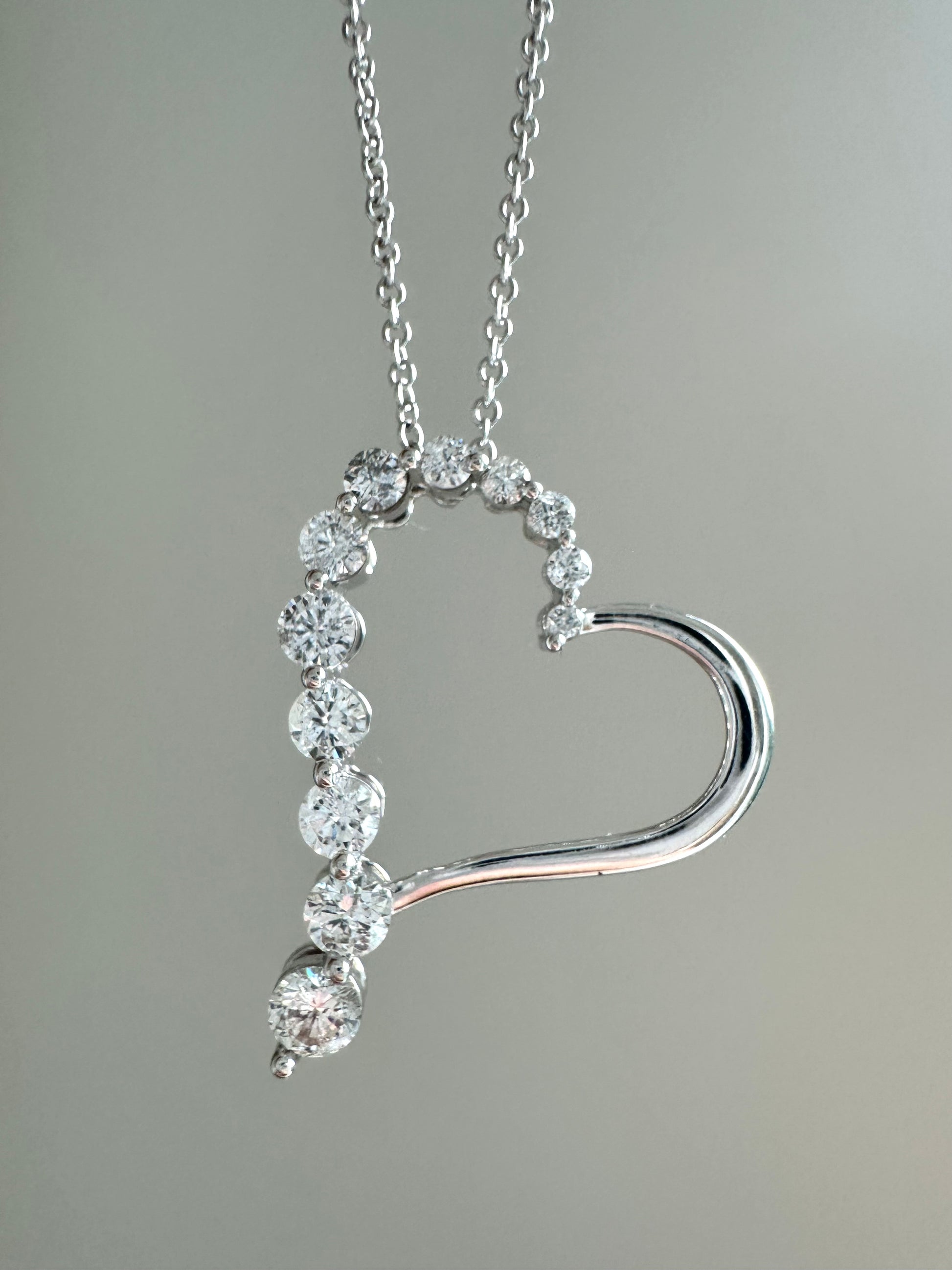 A timeless sparkling open heart pendant crafted in 14K gold set with 0.9 carats of scintillating white brilliant cut diamonds, and is SI clarity, G color. The pendant measures 1.0 inch in length by 0.85 inch in width.