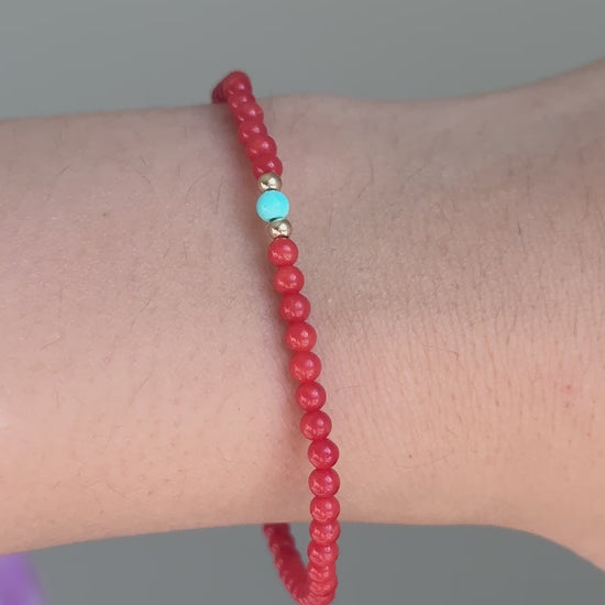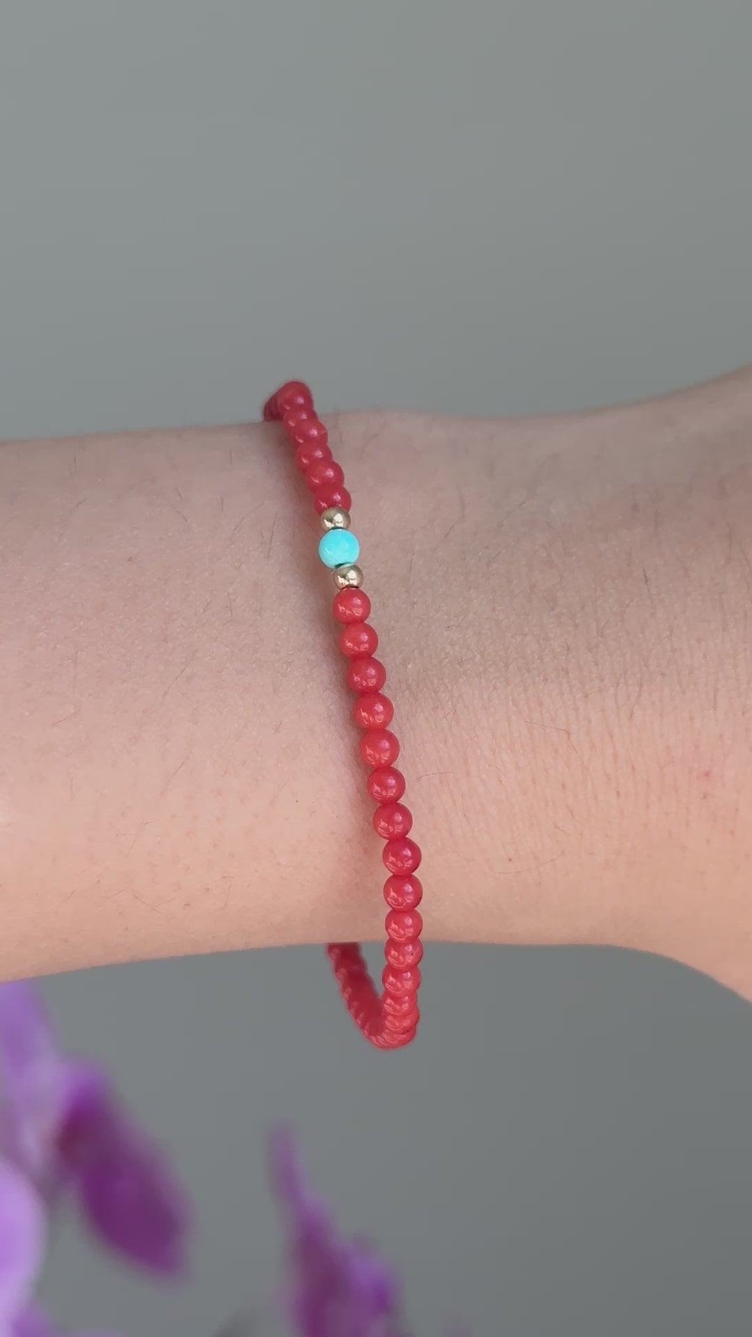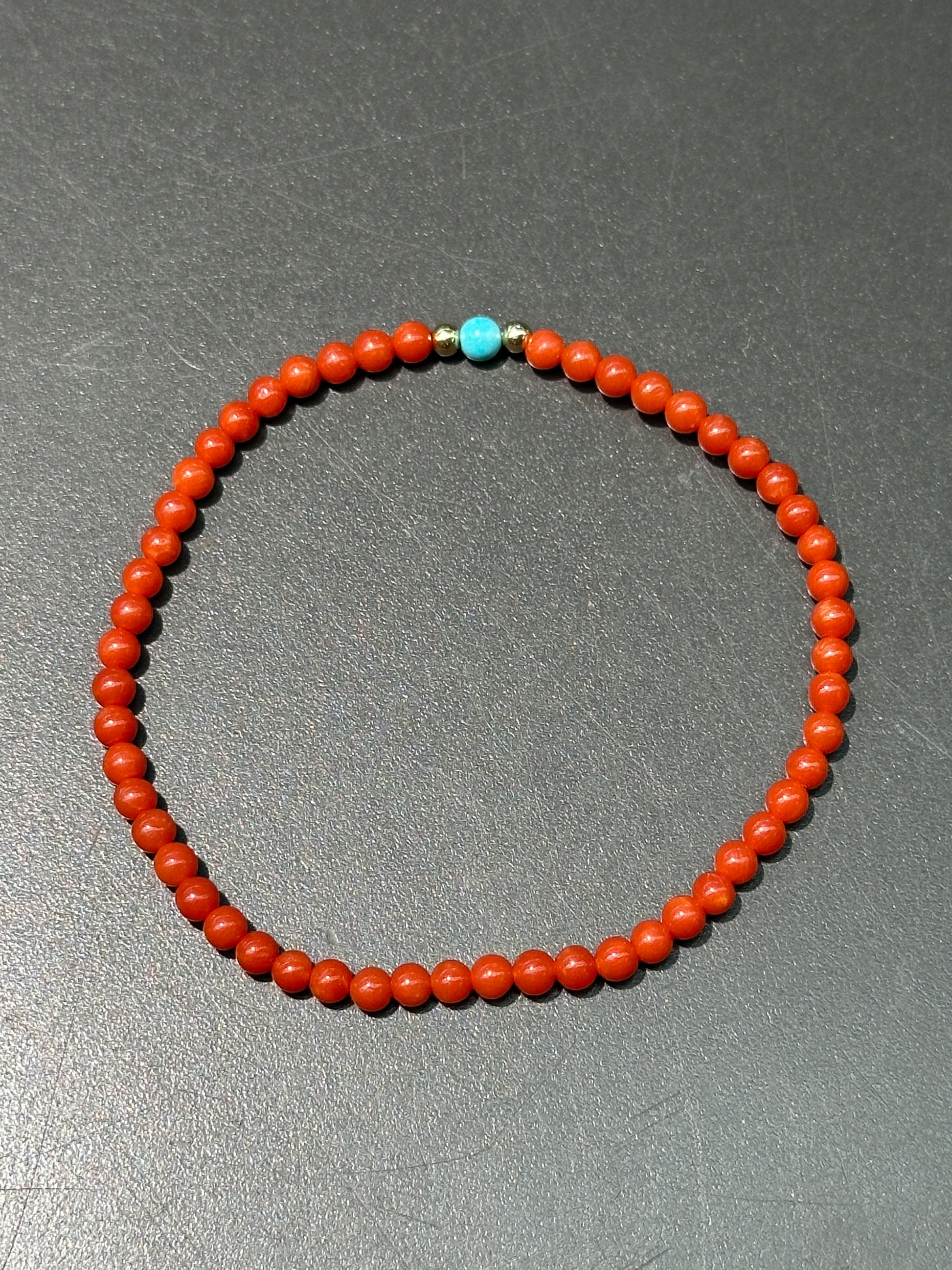 A 3.5 mm natural sardine coral bead bracelet accented with two 14K gold beads and a robin-egg blue turquoise in the center on a elastic string made for easy wear over the wrist.