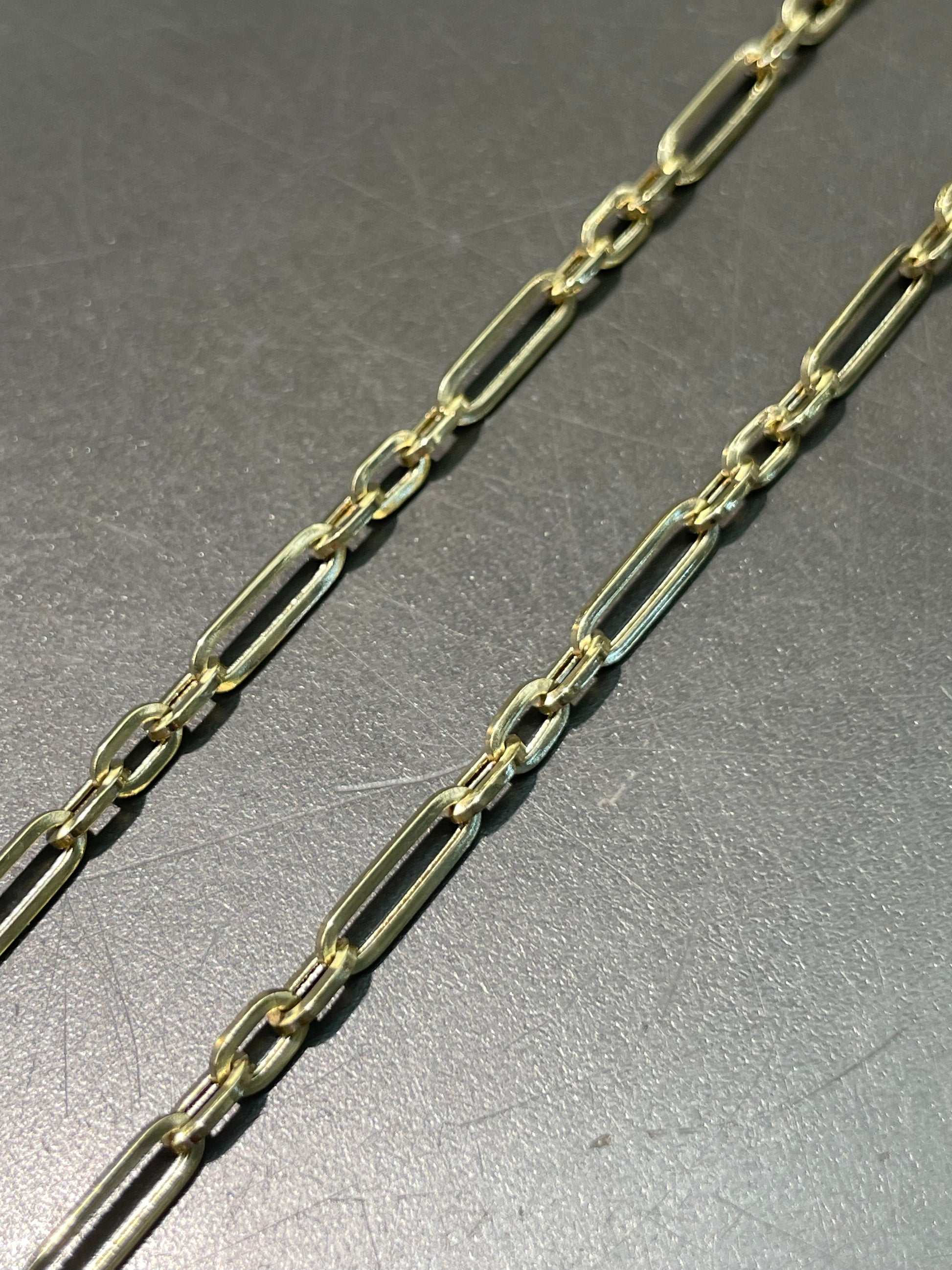 A 14K gold hollow chain link featuring rectangular paper clip chain.