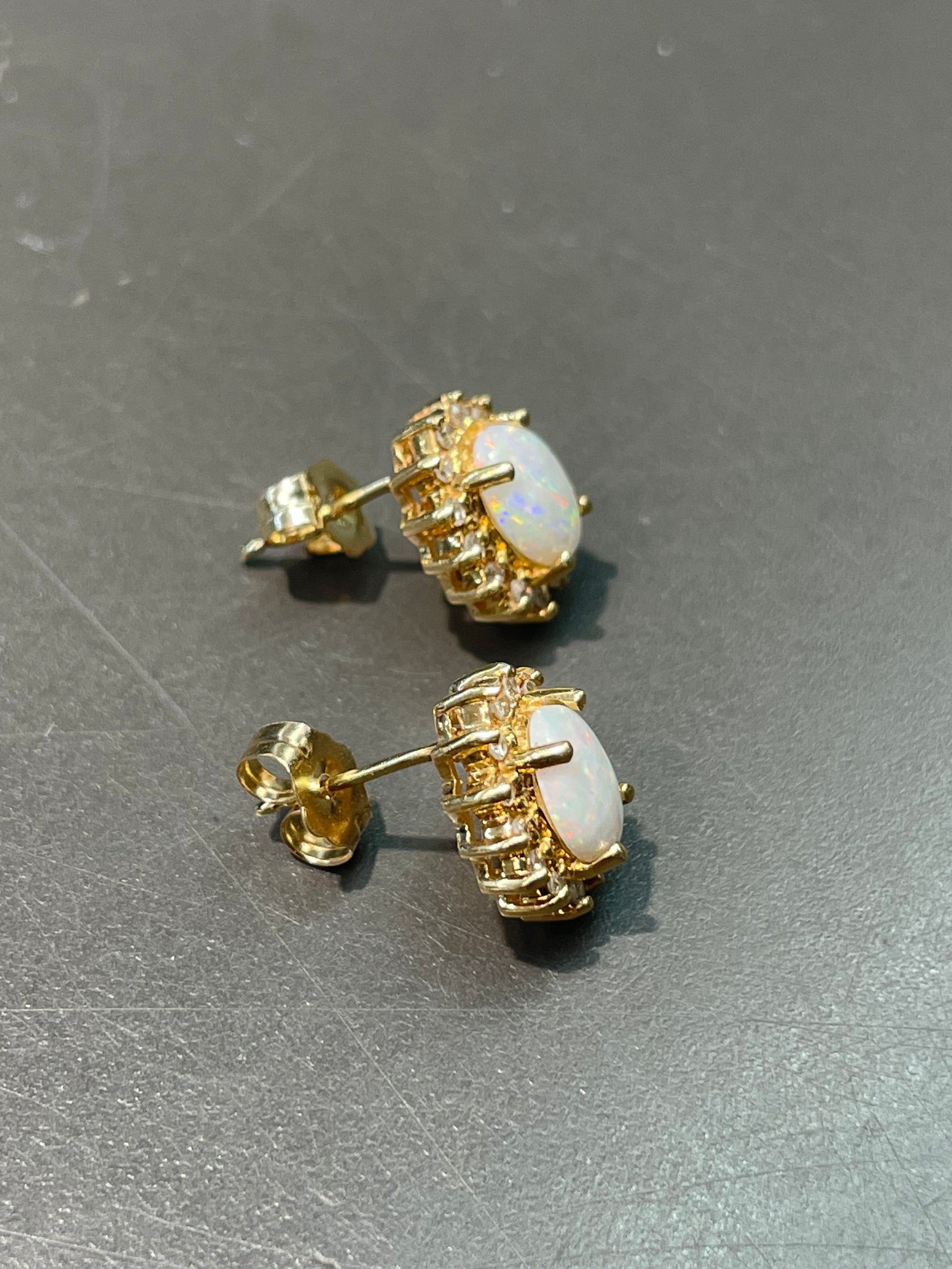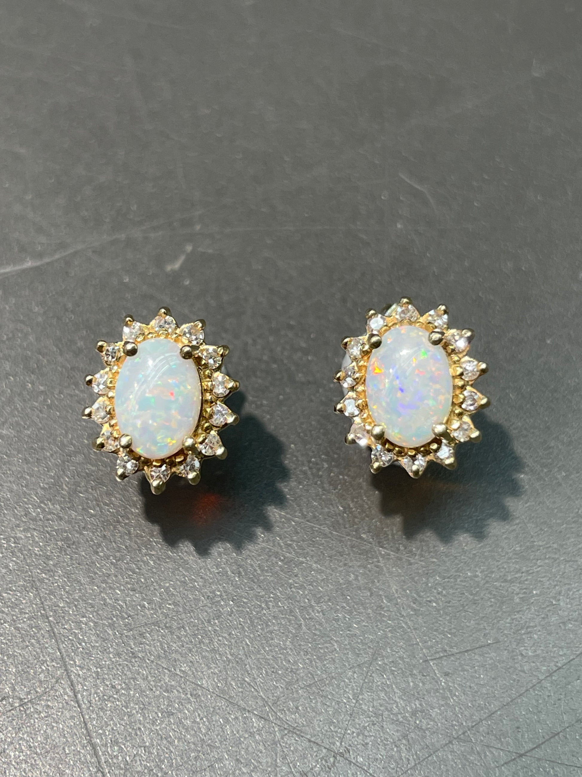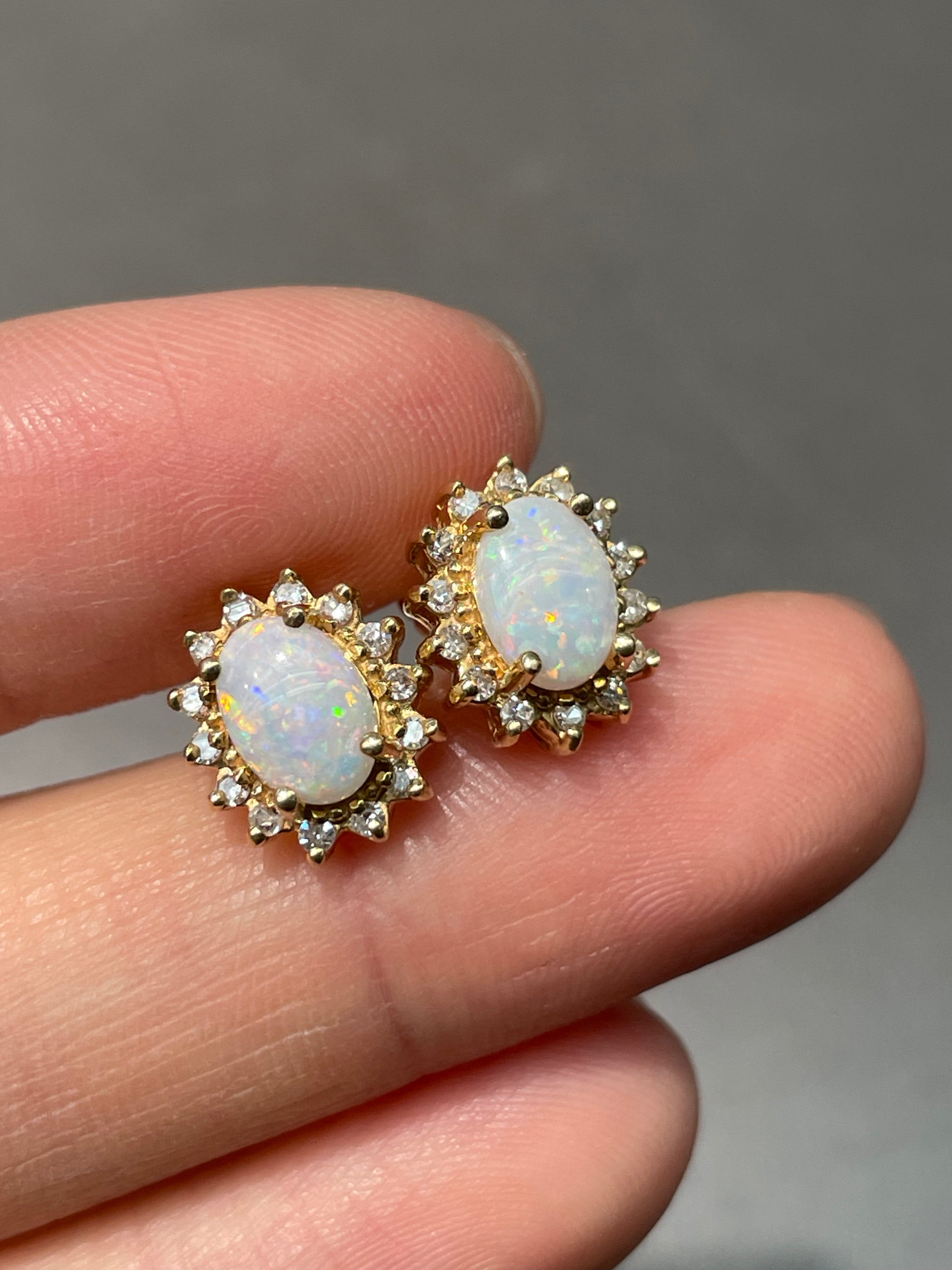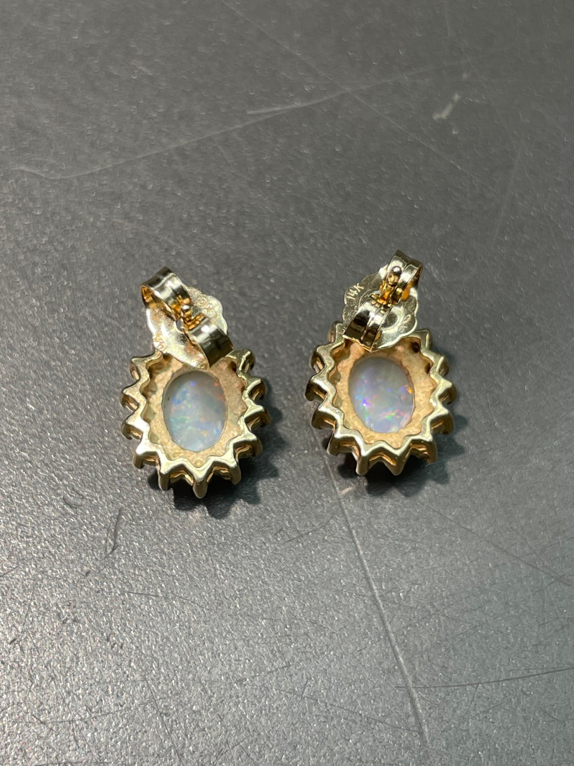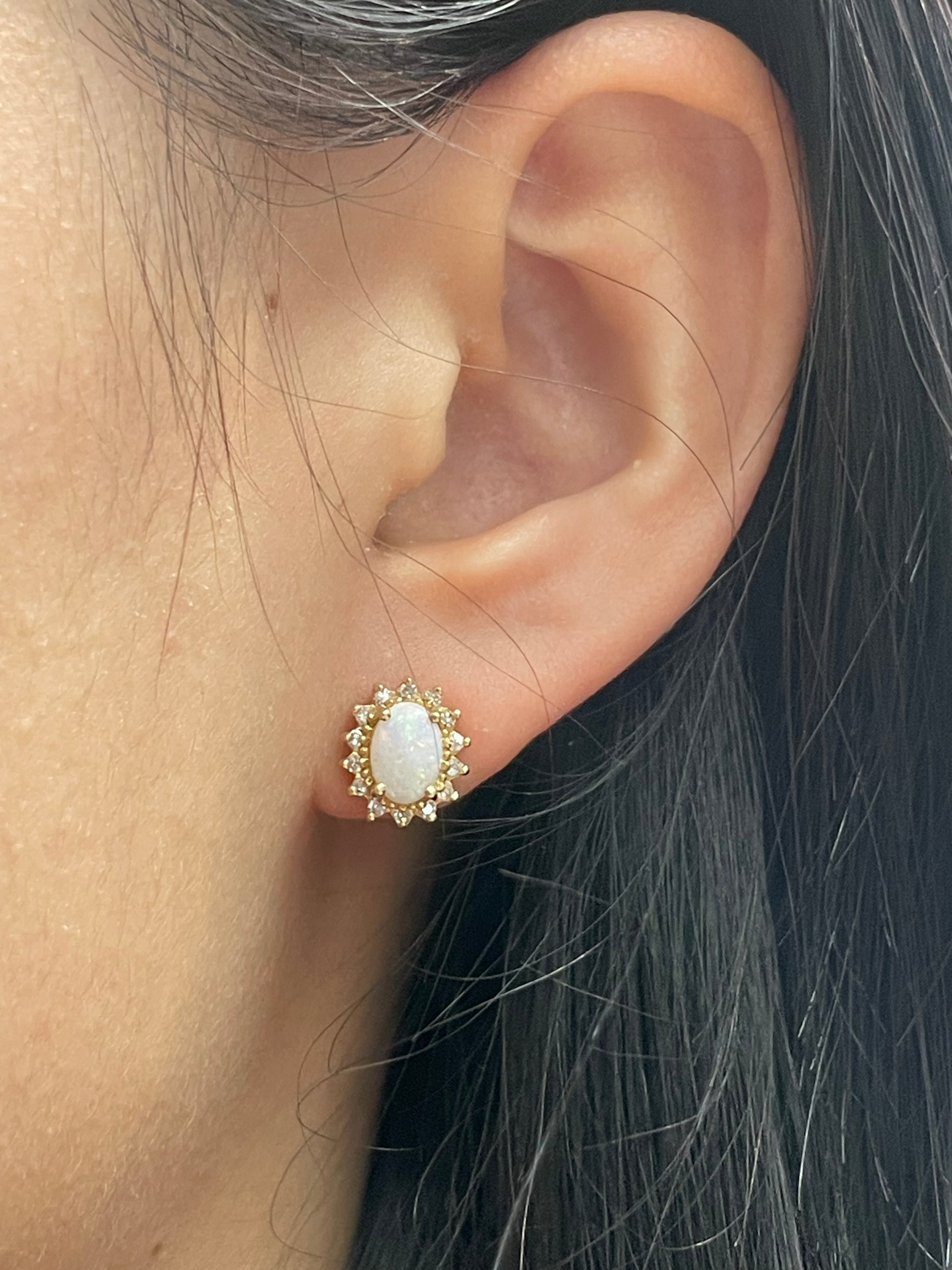 A classy 14K gold opal and diamond halo earring centered with an Australian opal with vibrant flashes of red, orange, yellow, green, and blue. Surrounded by a halo of sparkling white brilliant cut diamonds.