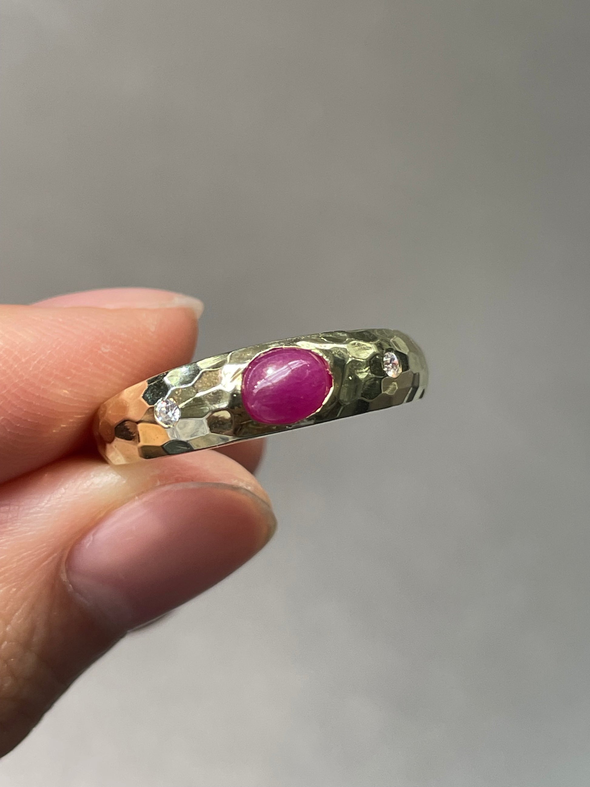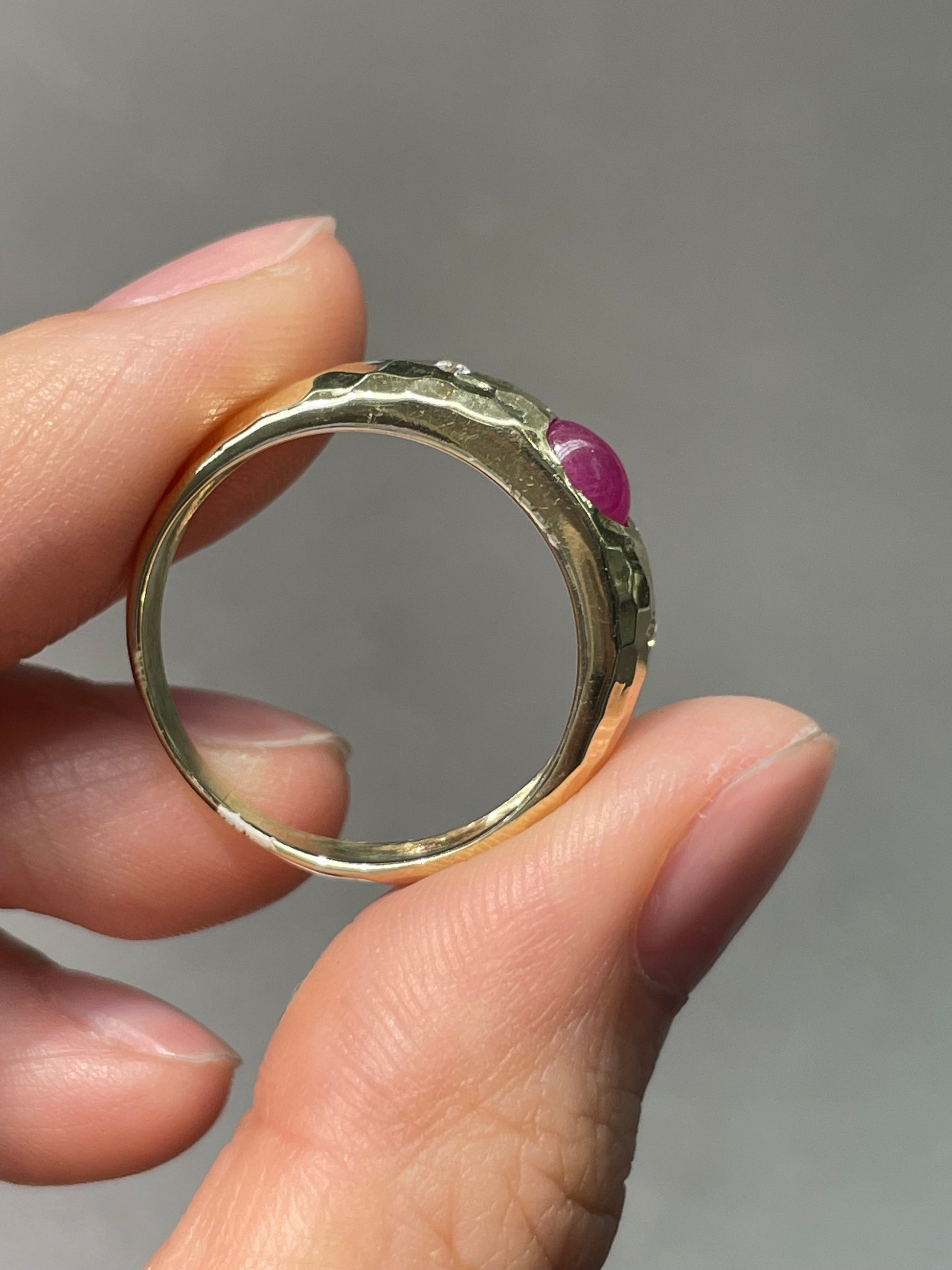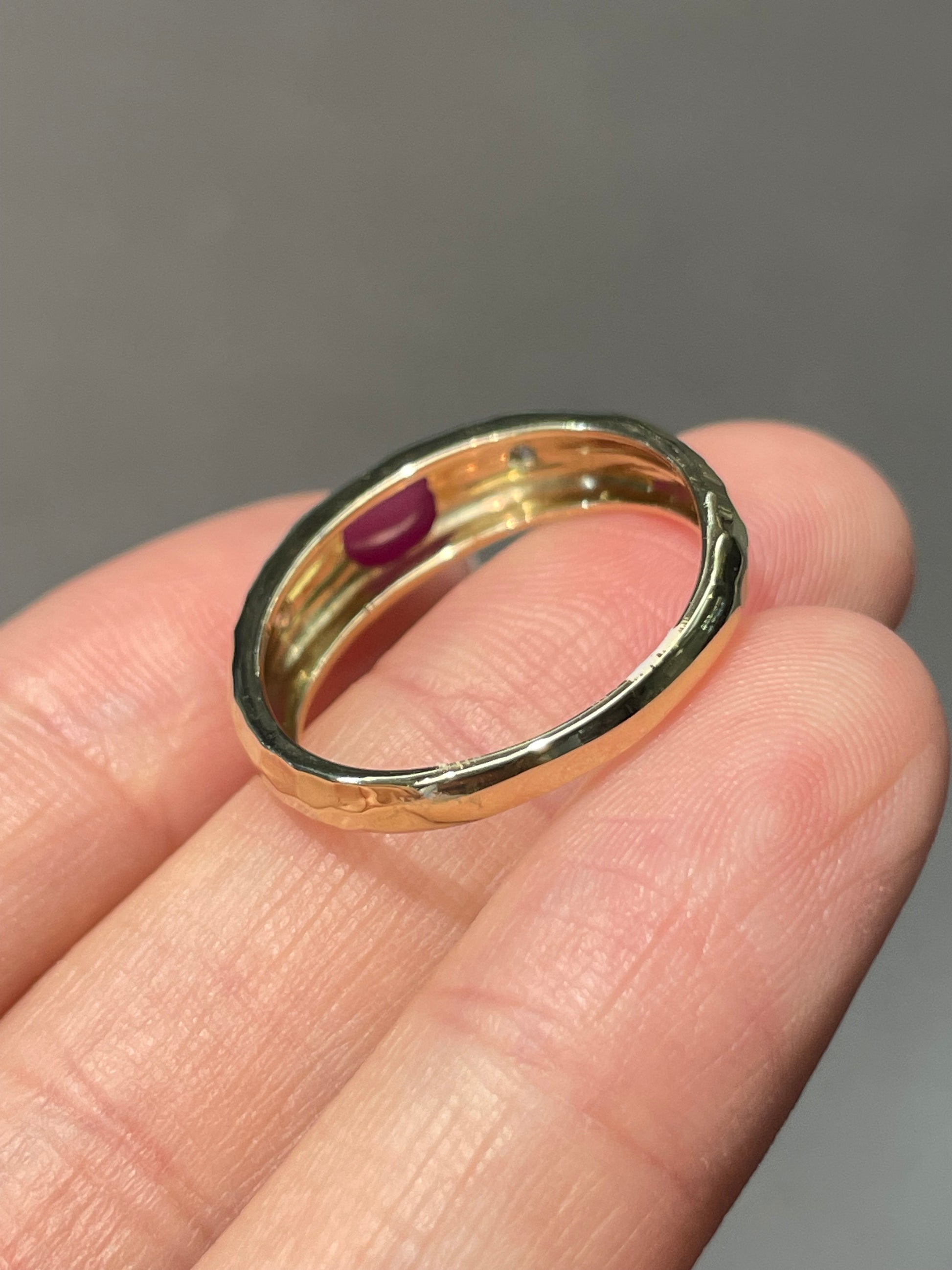 A 14K yellow gold gypsy ring set with a cabochon ruby flanked with two brilliant cut diamonds on the sides totaling 0.02 carats each.