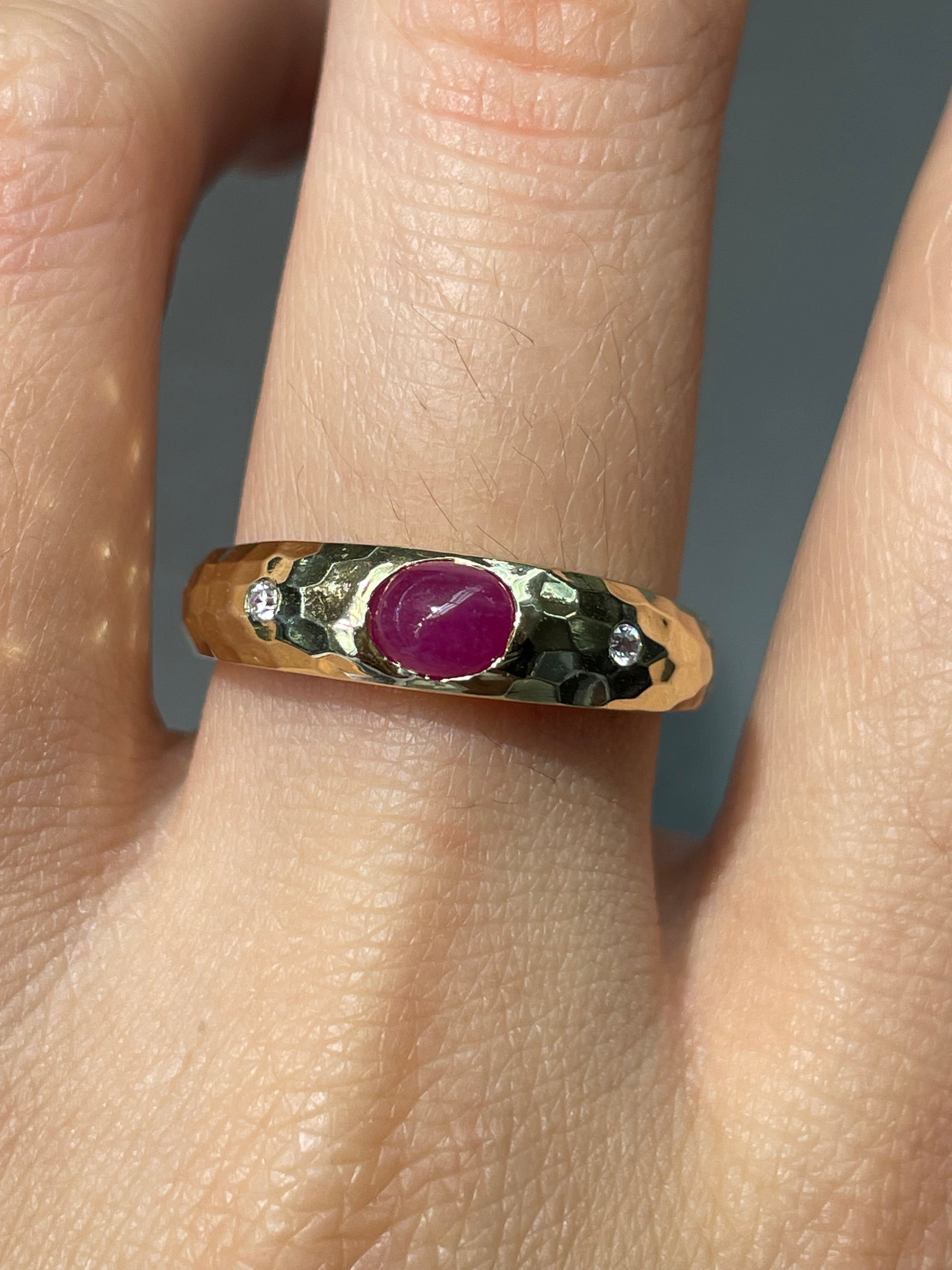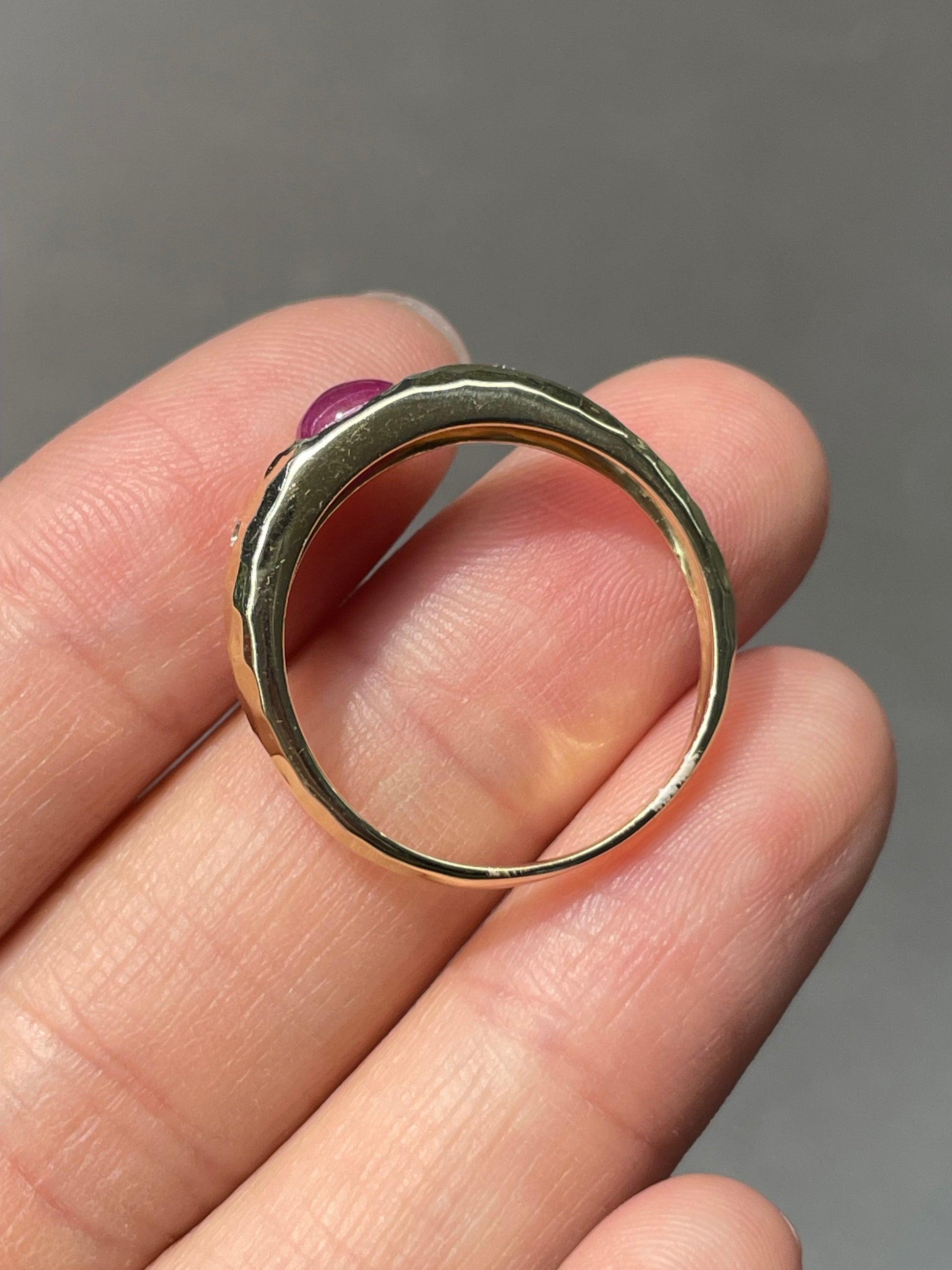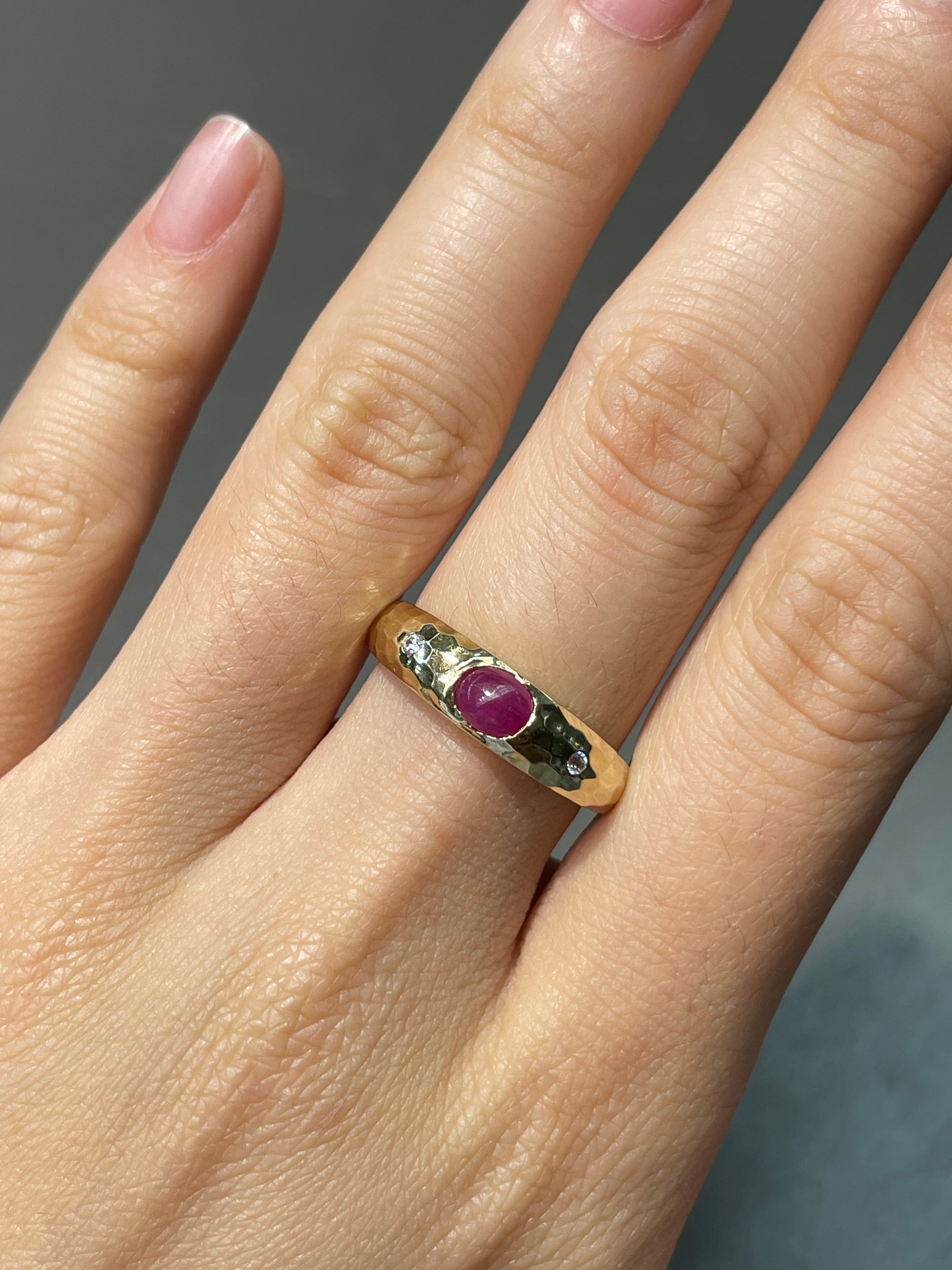 A 14K yellow gold gypsy ring set with a cabochon ruby flanked with two brilliant cut diamonds on the sides totaling 0.02 carats each.