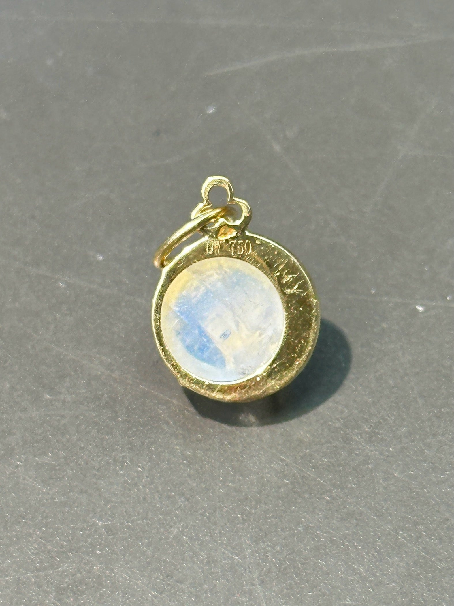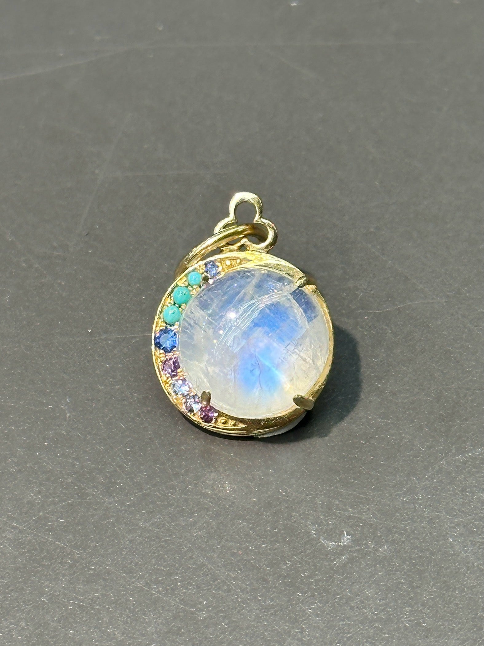 A whimsical 18K yellow gold celestial charm featuring a captivating moonstone that glows with a mesmerizing blue sheen. This luminous gemstone, set at the heart of the charm is adorned with a delicate crescent on the side, this crescent sparkles with natural vibrant turquoises and sapphires revealing the spectrum of rainbow that add a touch of elegance and shine, perfectly complementing the moonstone's ethereal glow!